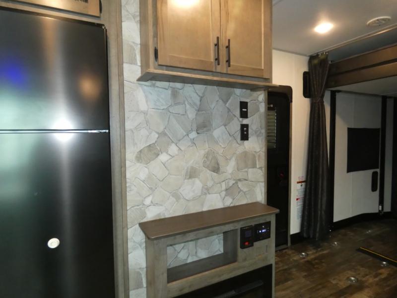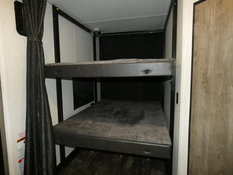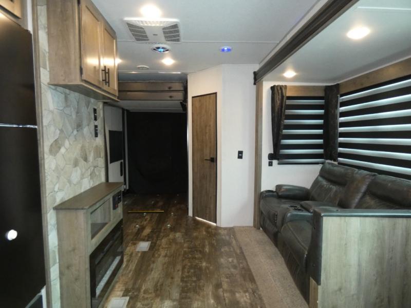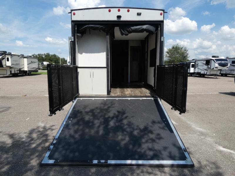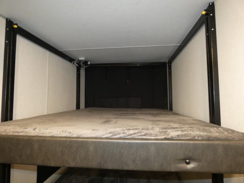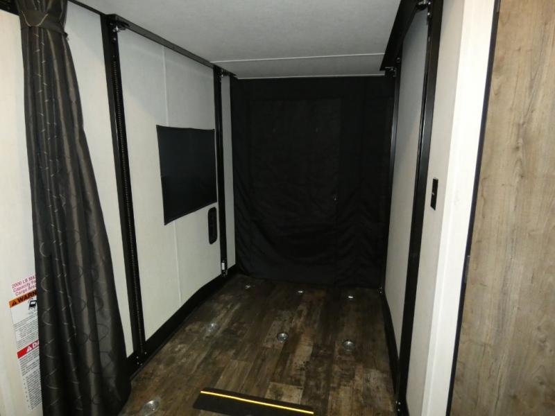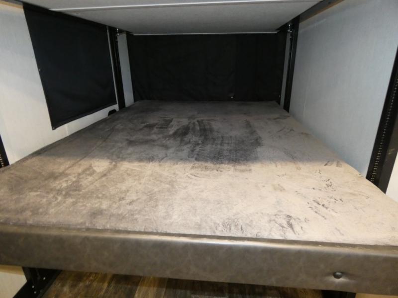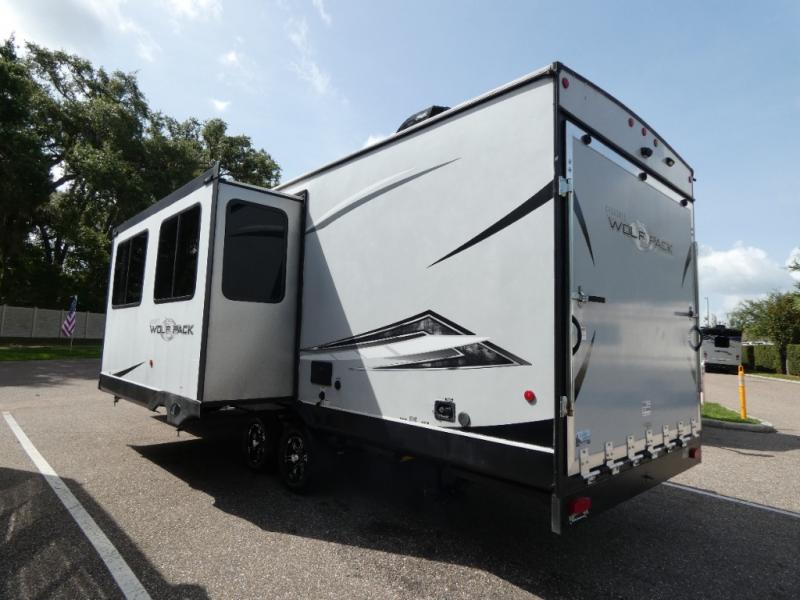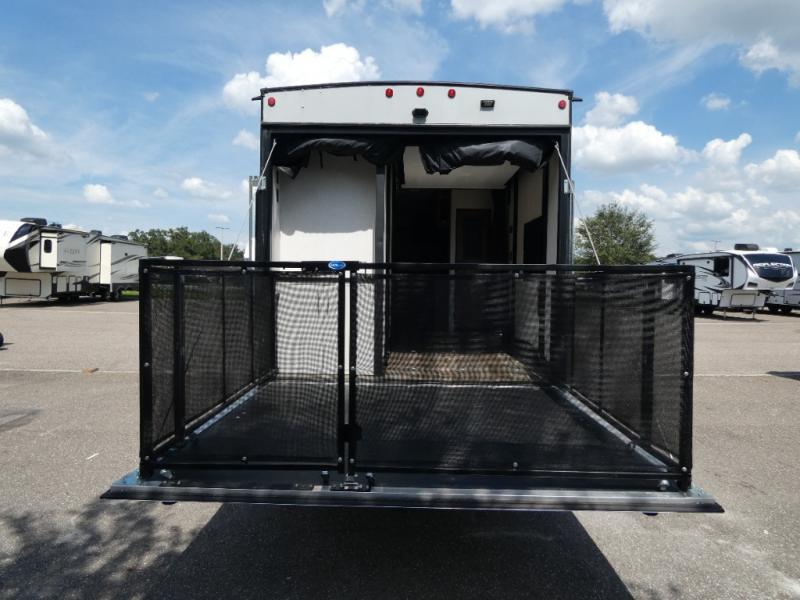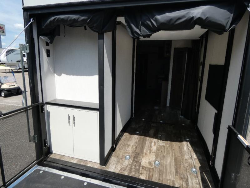 Every part of this toy hauler is maximized for utility and comfort! The Happijac bed lift system bunk beds can be set up within minutes of arriving at your destination. Behind the entertainment center with a fireplace is a large pantry for your snacks and across from it is a sofa and booth dinette slide. You can switch out the sofa for an optional theater seating if that fits your needs better. Freshen up in the rear corner bathroom then head to the front private bedroom to change your clothes that are store in the wardrobes on either side of the 67" x 74" Wolf Pack king bed. You will be the talk of the campground with the "party patio" that has outside TV hookups. Plus, there is an outside kitchen for sunrise breakfasts!