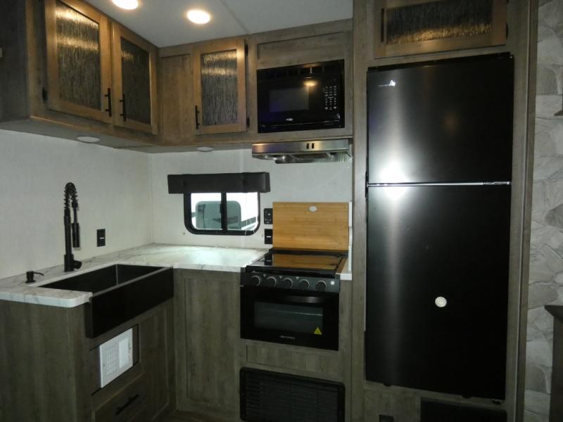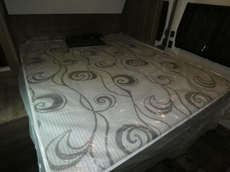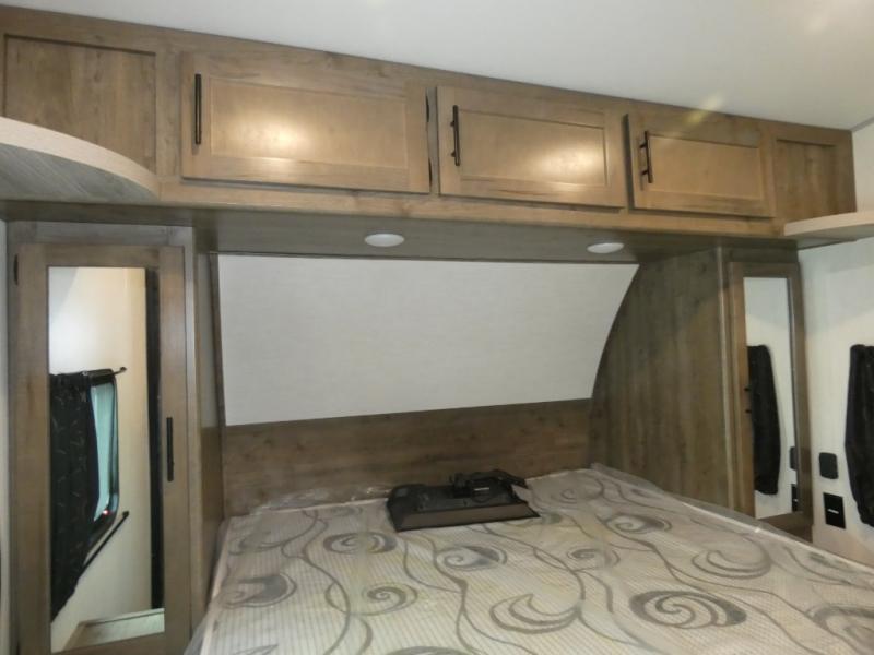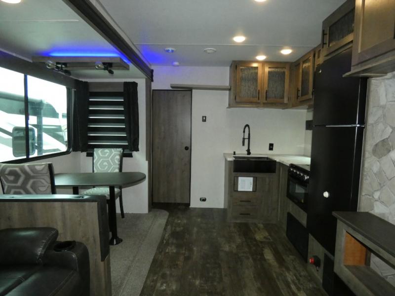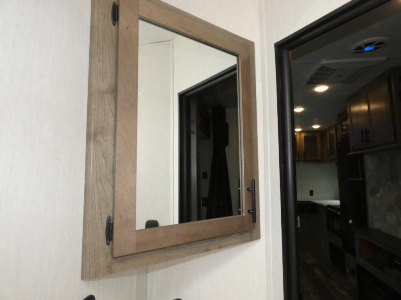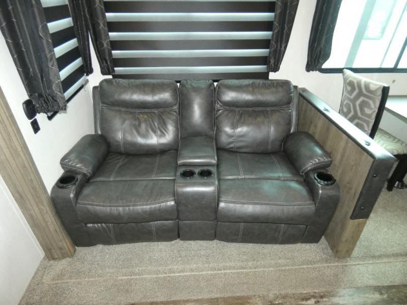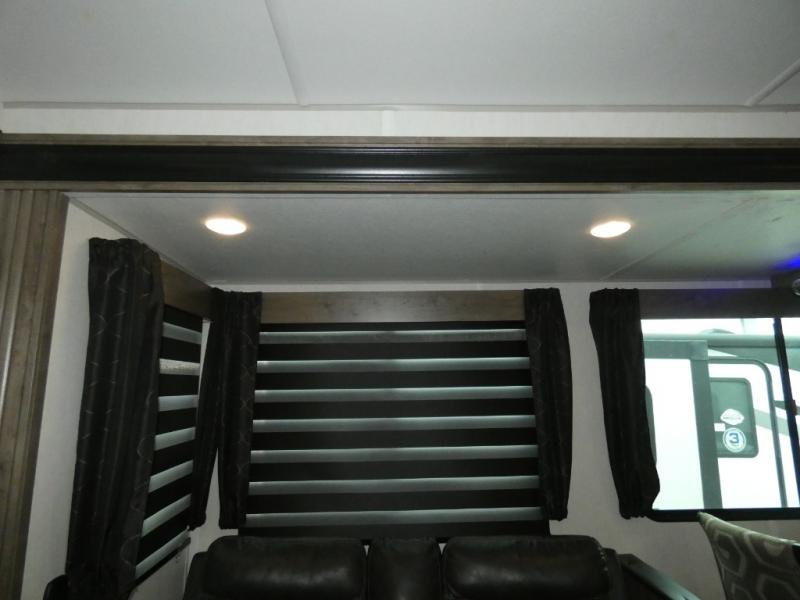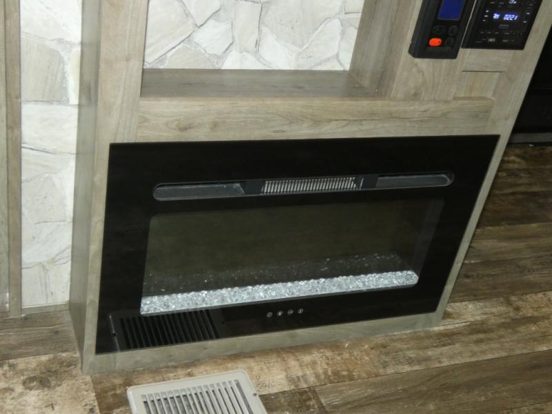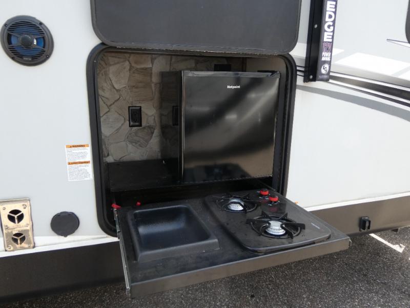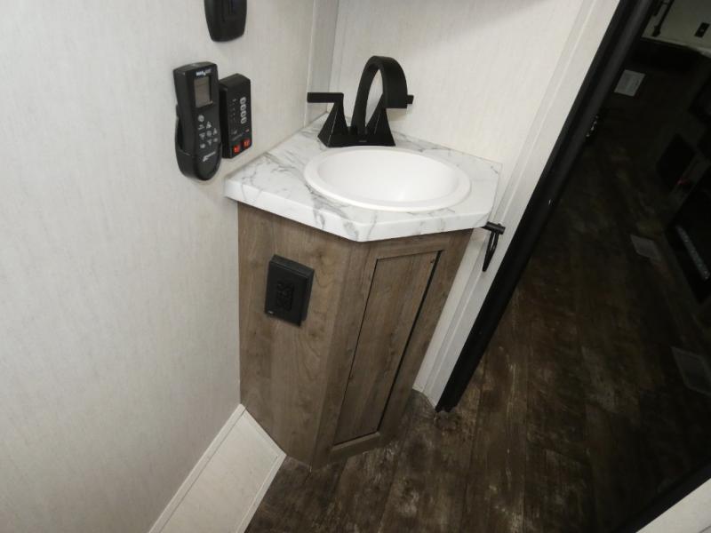 Every part of this toy hauler is maximized for utility and comfort! The Happijac bed lift system bunk beds can be set up within minutes of arriving at your destination. Behind the entertainment center with a fireplace is a large pantry for your snacks and across from it is a sofa and booth dinette slide. You can switch out the sofa for an optional theater seating if that fits your needs better. Freshen up in the rear corner bathroom then head to the front private bedroom to change your clothes that are store in the wardrobes on either side of the 67" x 74" Wolf Pack king bed. You will be the talk of the campground with the "party patio" that has outside TV hookups. Plus, there is an outside kitchen for sunrise breakfasts!