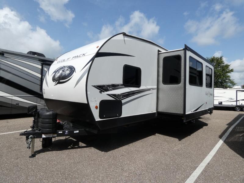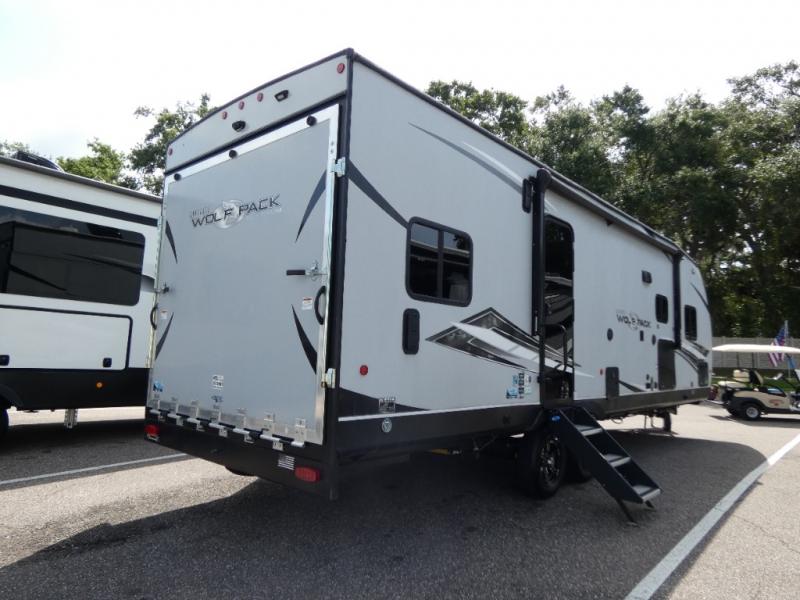 Run with the pack in any one of these Forest River Cherokee Wolf Pack toy haulers! They are affordable and versatile with a 102" widebody design to pack in all of the necessary features for a great adventure with your family and toys. The grey high gloss gel exterior will turn heads on the highway and the LED interior/exterior lights will make life easier. An outside shower with hot and cold water helps to keep the mud outside where it belongs. With an external 30 gallon fuel station, you won't have to worry about your toys being low on fuel. The Platinum package adds extra conveniences like a ramp door patio deck railing system, a Happijac bed lift system, and an industrial rubber garage floor on enclosed garage models. Come find the perfect model for you today!
