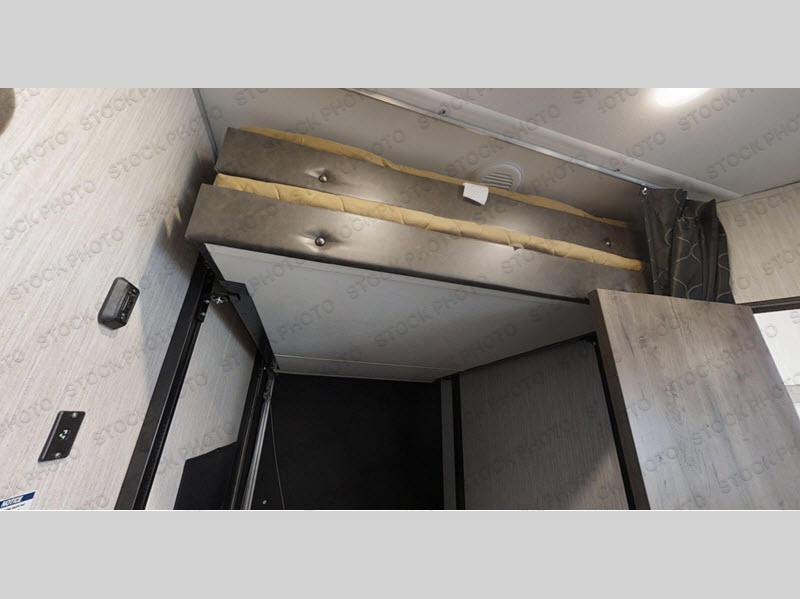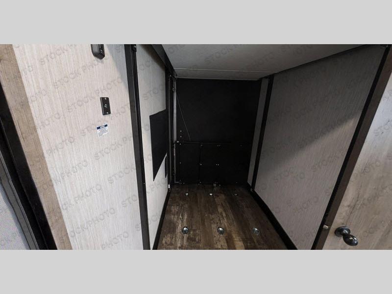 Every part of this toy hauler is maximized for utility and comfort! The Happijac bed lift system bunk beds can be set up within minutes of arriving at your destination. Behind the entertainment center with a fireplace is a large pantry for your snacks and across from it is a sofa and booth dinette slide. You can switch out the sofa for an optional theater seating if that fits your needs better. Freshen up in the rear corner bathroom then head to the front private bedroom to change your clothes that are store in the wardrobes on either side of the 67" x 74" Wolf Pack king bed. You will be the talk of the campground with the "party patio" that has outside TV hookups. Plus, there is an outside kitchen for sunrise breakfasts!