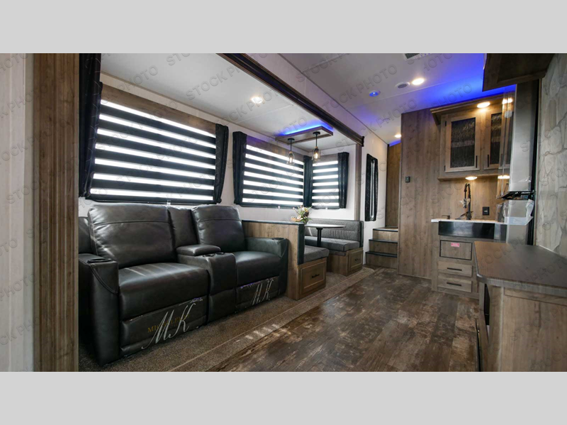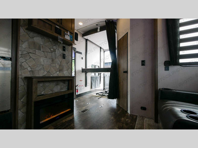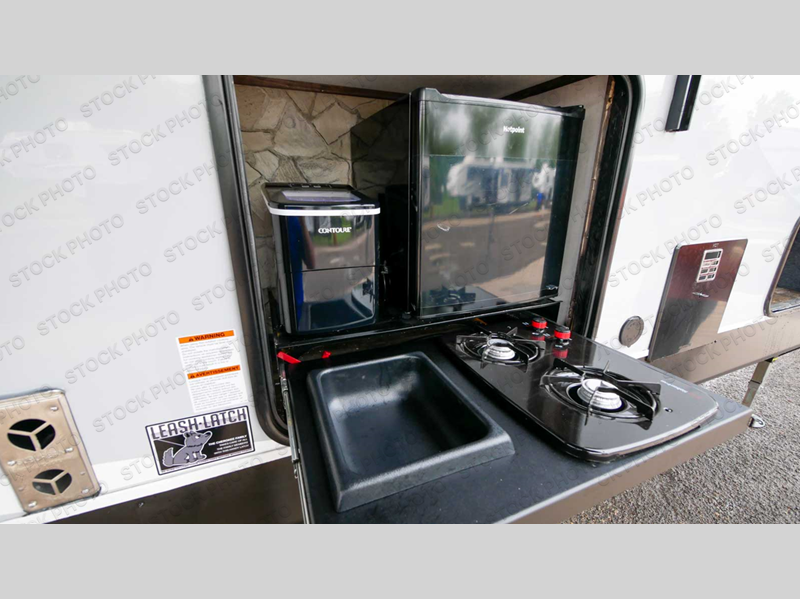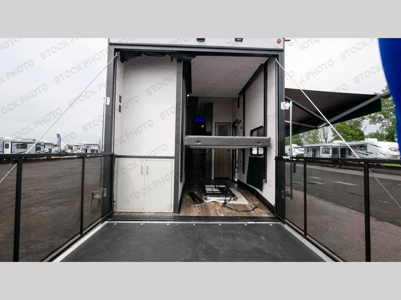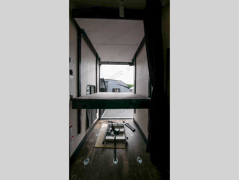 Everyone will have an easy time getting cleaned up after riding the trails with two full bathrooms in this toy hauler! The 96" x 96" ramp door makes it easy to load an unload your toys, plus it can also be the "party patio" with an outside TV hookup nearby. Next to the rear corner bathroom is a set of 52" x 74" bunk beds for easy access at night. Behind the entertainment center with a fireplace is a pantry to store everyone's favorite snacks that can be enjoyed at either the sofa or booth dinette slide. You could even switch out the sofa for the optional theater seating instead. The dual entry bathroom has a radius shower and leads directly into the front private bedroom which has a 67" x 74" Wolf Pack king bed and a wardrobe slide to keep your clothes looking their best. Don't forget to have a sunrise breakfast at the outside kitchen!