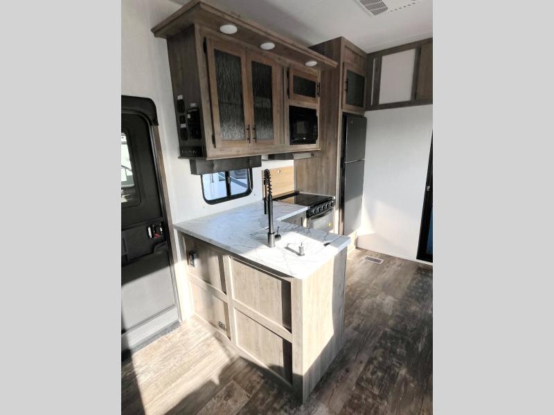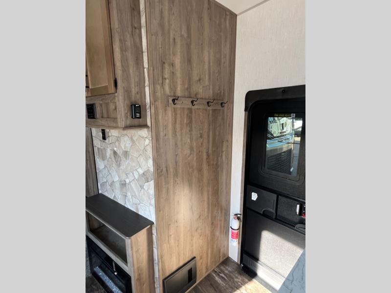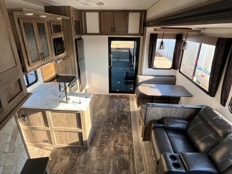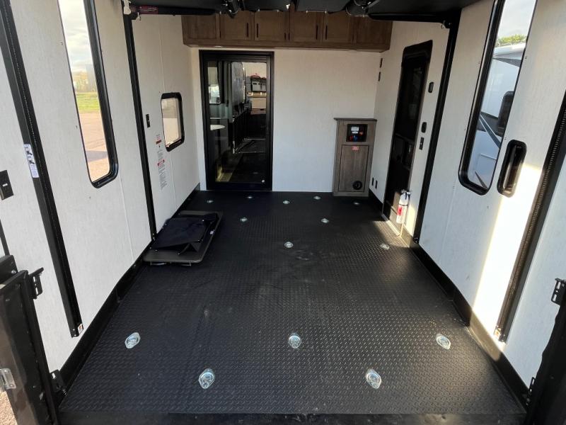 With dual entry doors, you will experience a smooth flow of traffic in and out of this toy hauler! One of the entrances leads into the 12' garage area with a folding dinette table below a Happijac bed lift system, and an area prepped to add an optional washer and dryer. The chef will have everything they need to prepare their best home cooked meals indoors or they can head to the outside kitchen to breathe in some fresh air while they cook. Gather together at the booth dinette for game night or relax on the sofa across from the entertainment center with a fireplace. When you're ready to wind down your nights, clean up in the dual entry bathroom with the radius shower then head directly into the front private bedroom where you can rest your head on the 67" x 74" Wolf Pack king bed!