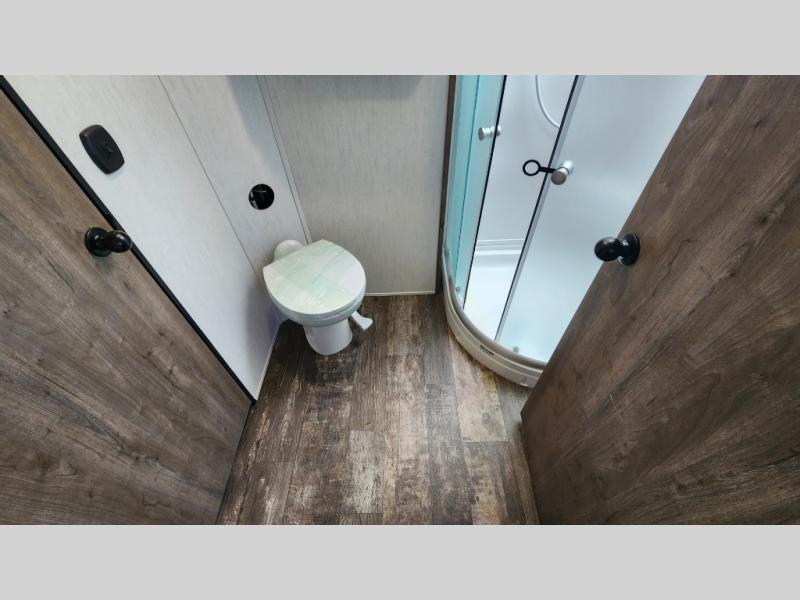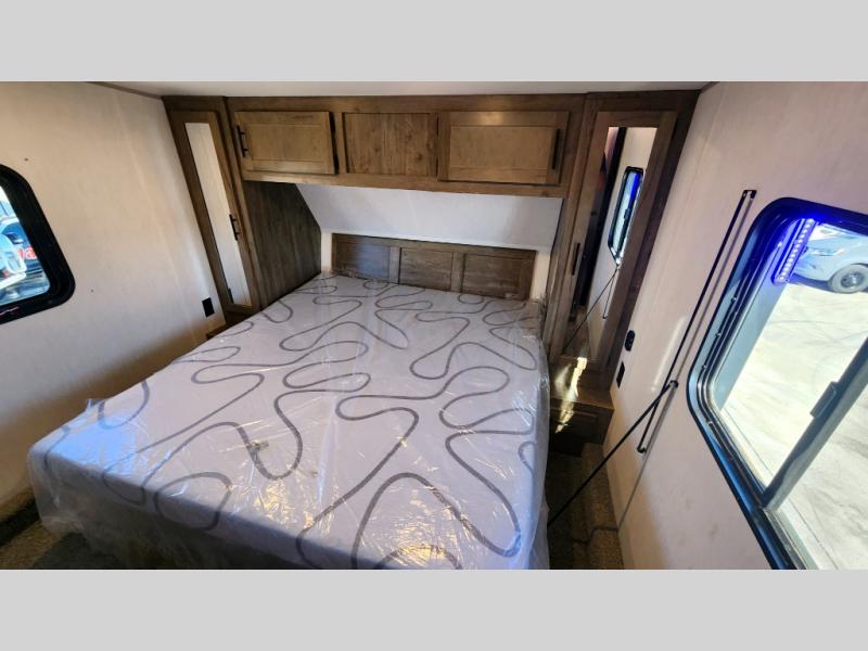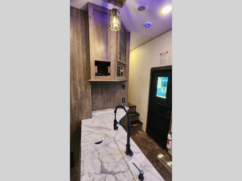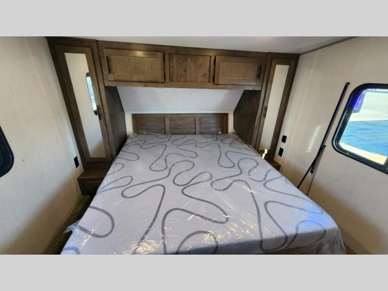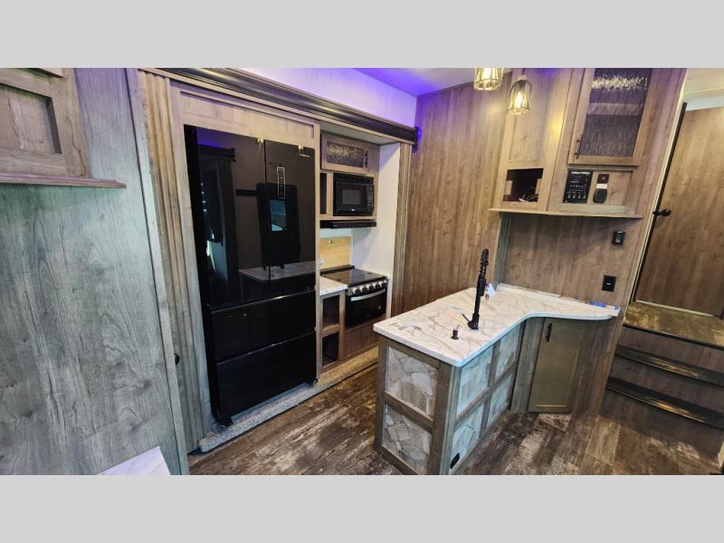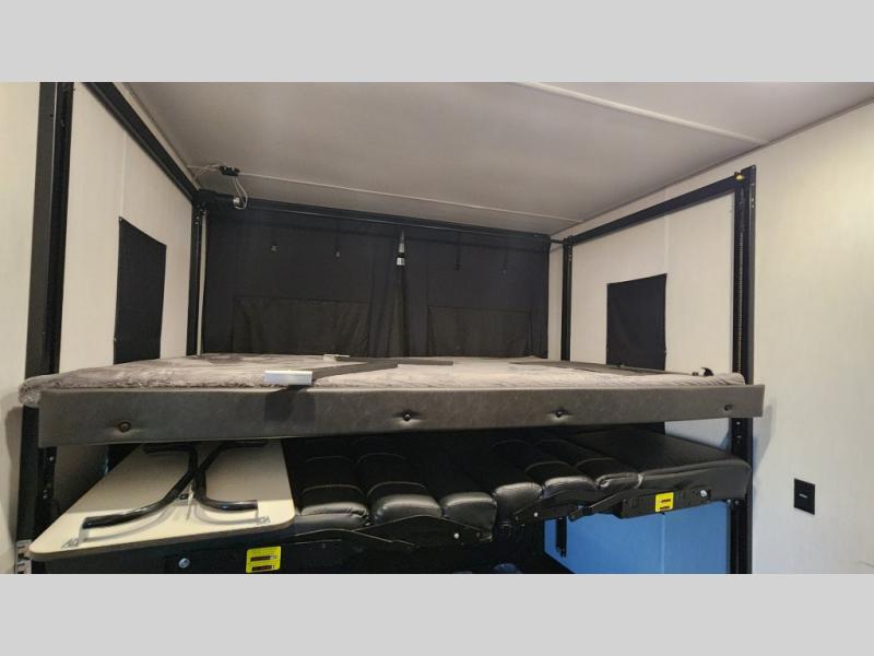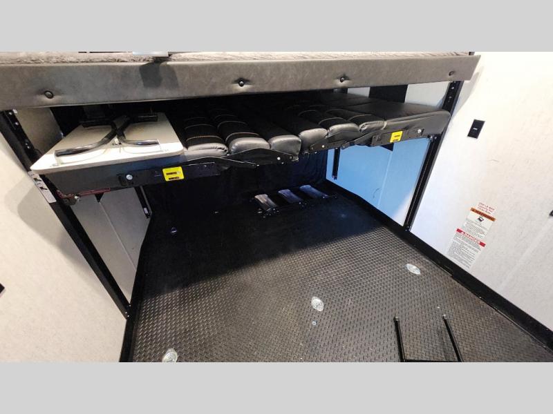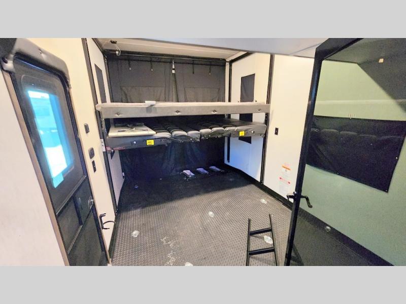 If you need a toy hauler big enough for your whole gang and your toys then look no further! It features a wrap-around loft above the 13' garage area which has a folding dinette table below a Happijac bed lift system, an area prepped to an optional washer and dryer, and a half bathroom, plus there is one of the dual entry doors to the unit and a 96" x 96" ramp door "party patio". The U-shaped dinette is great for meals, games, and even sleeping but it can be switched out for the optional party recliner sofa instead. You also have a great view from here of the entertainment center with a fireplace. After enjoying a good night's rest on the 67" x 74" Wolf Pack king bed in the front private bedroom, you can head directly into the dual entry bathroom to freshen up in the radius shower!