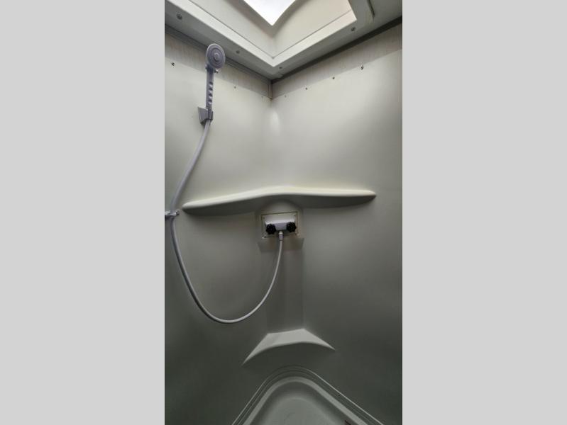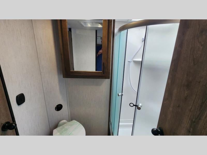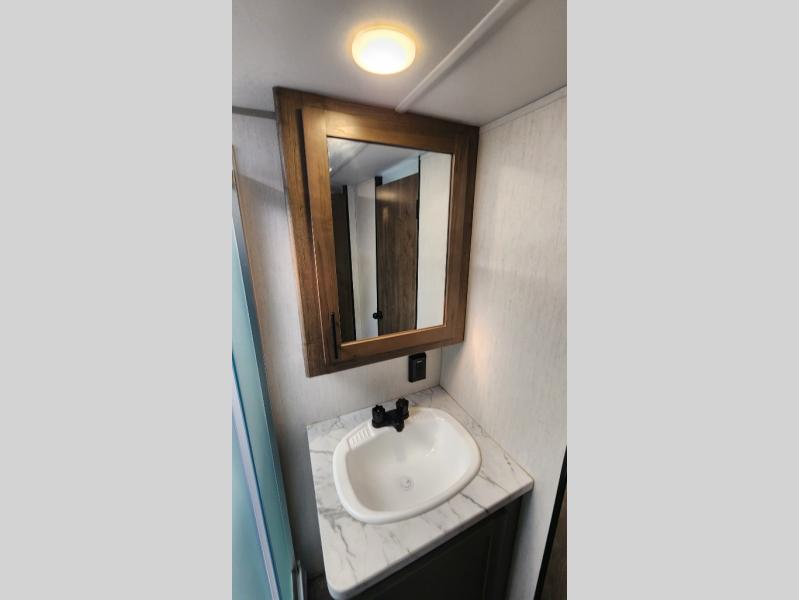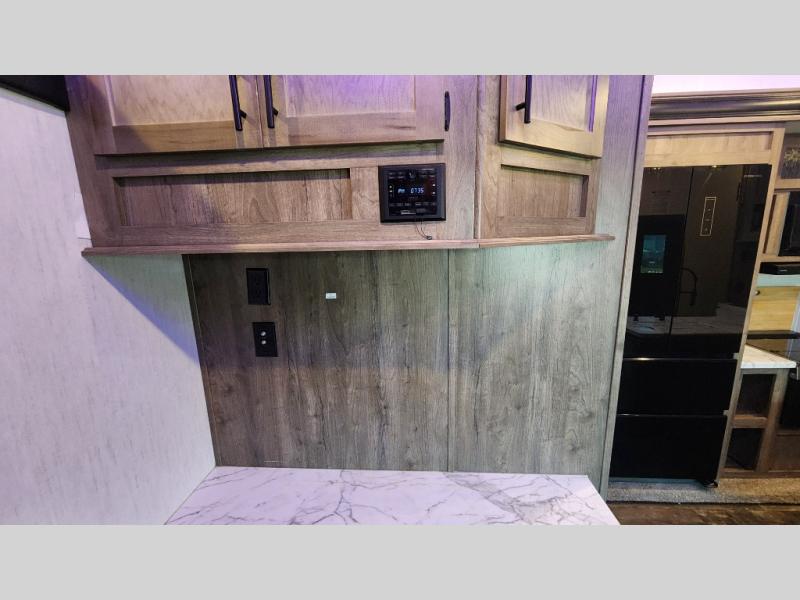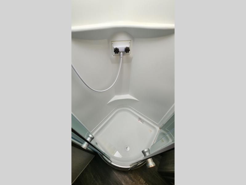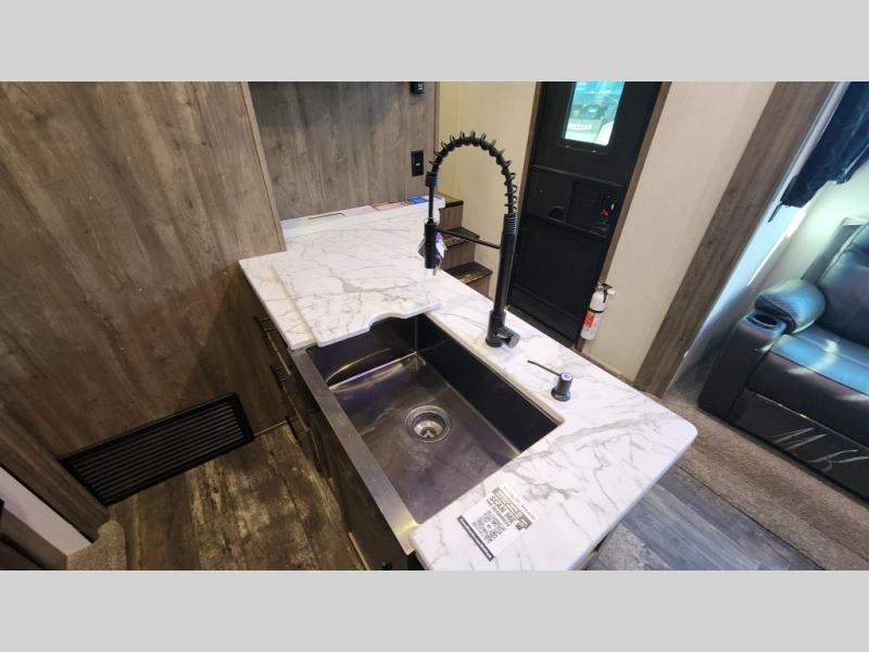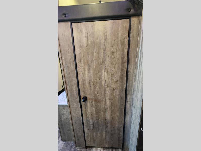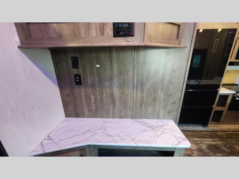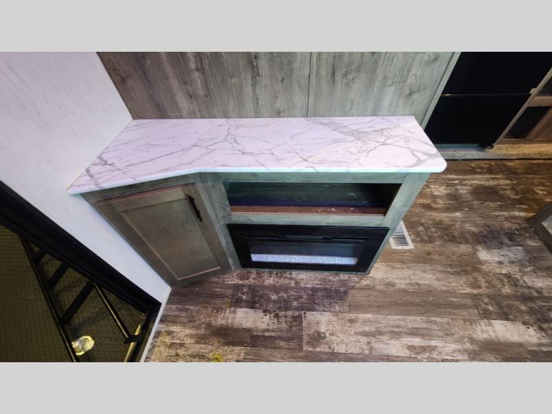 If you need a toy hauler big enough for your whole gang and your toys then look no further! It features a wrap-around loft above the 13' garage area which has a folding dinette table below a Happijac bed lift system, an area prepped to an optional washer and dryer, and a half bathroom, plus there is one of the dual entry doors to the unit and a 96" x 96" ramp door "party patio". The U-shaped dinette is great for meals, games, and even sleeping but it can be switched out for the optional party recliner sofa instead. You also have a great view from here of the entertainment center with a fireplace. After enjoying a good night's rest on the 67" x 74" Wolf Pack king bed in the front private bedroom, you can head directly into the dual entry bathroom to freshen up in the radius shower!
