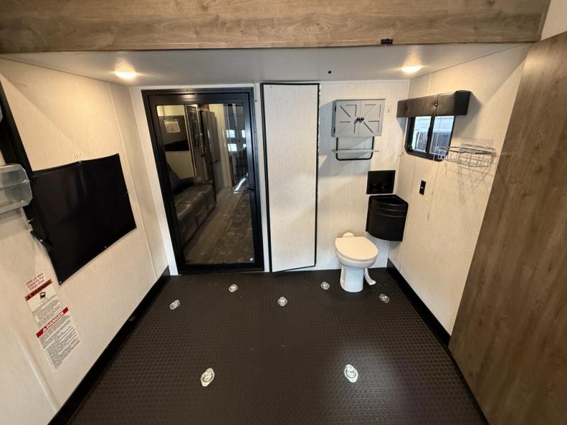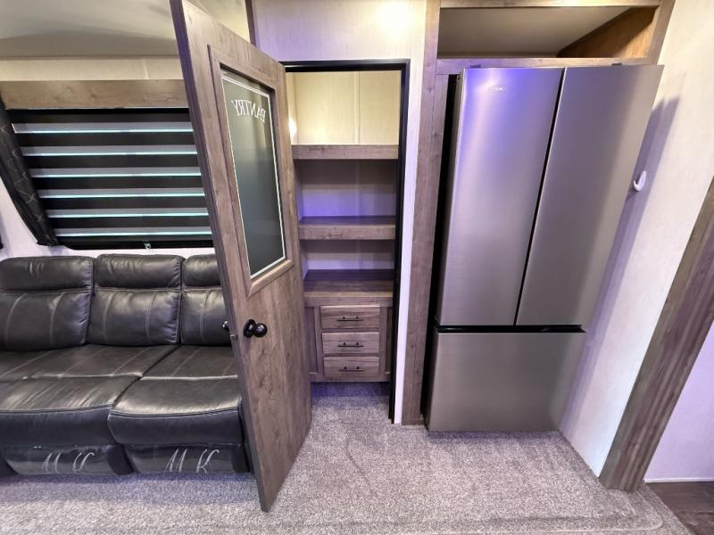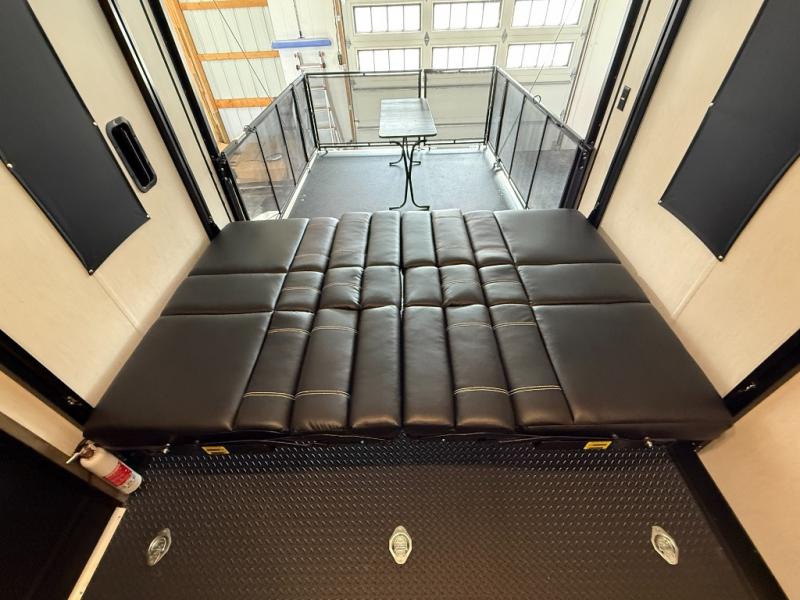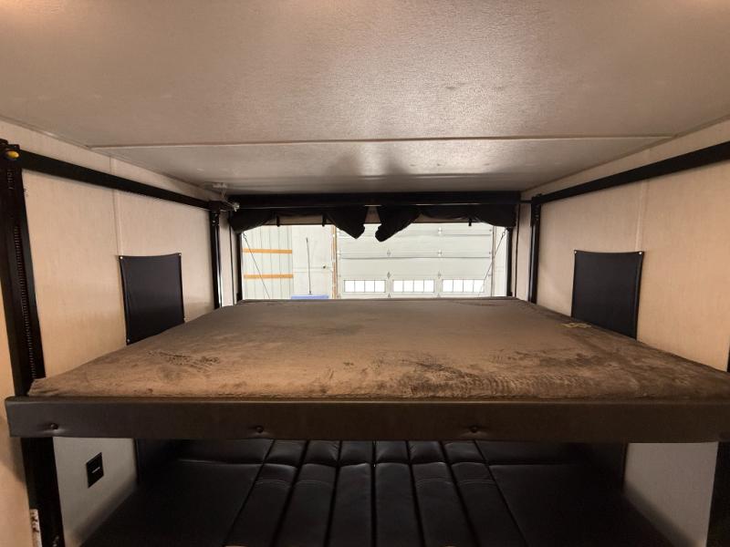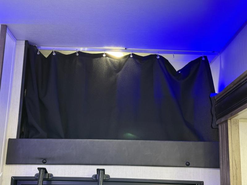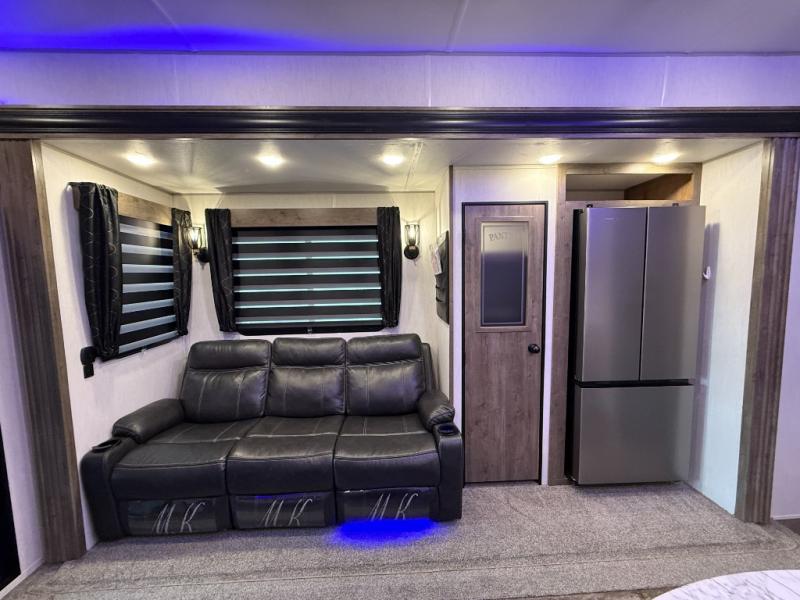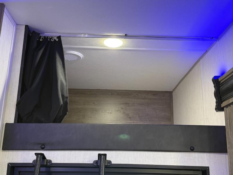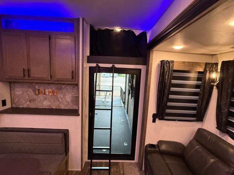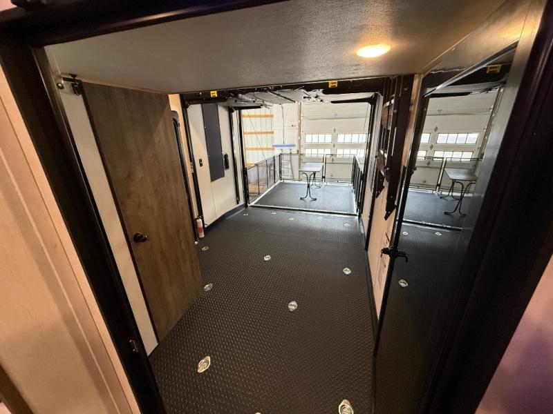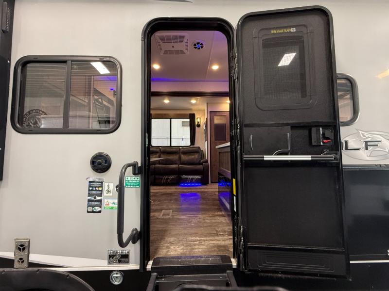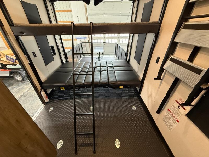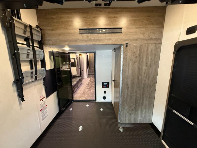 An outside kitchen, a loft, plus dual entry doors make this unit the one! Your guests will love the 13' separate garage that includes a Happijac power bed, plus their own half bath for convenience. The bathroom walls can fold to provide more space when loading toys, and the ramp door can convert to a "party patio" for more fun. Now, that sounds like a fun bunkhouse! Head to the main living area to relax on the party recliner sofa within the large slide, and you can grab a snack from the large pantry. When sleep is calling your name head to front master bedroom for a great night's rest on the Wolf Pack king bed, and you can store your clothes in the slide out wardrobe. This model also includes a pass-through storage with D-rings so you can secure your gear on the way to the campground!