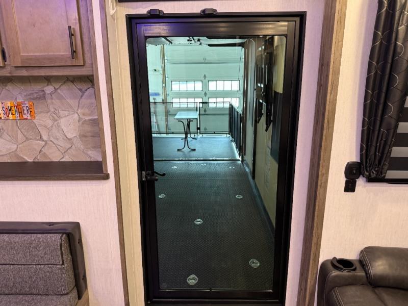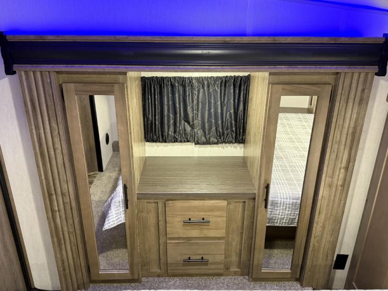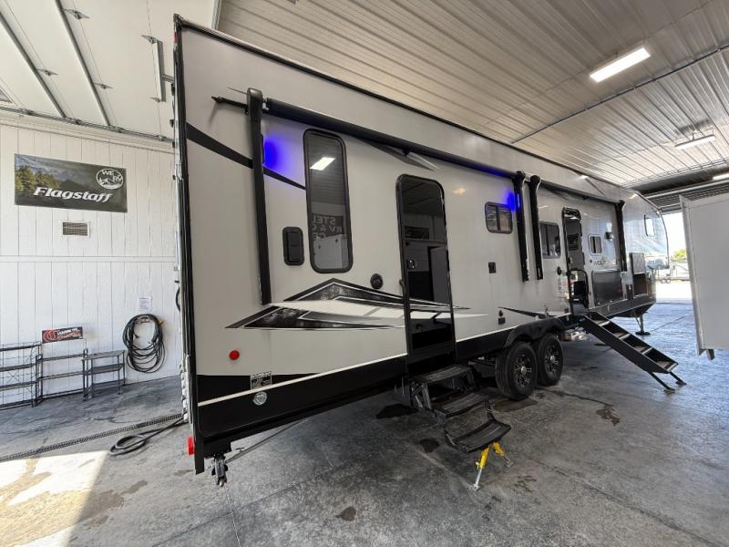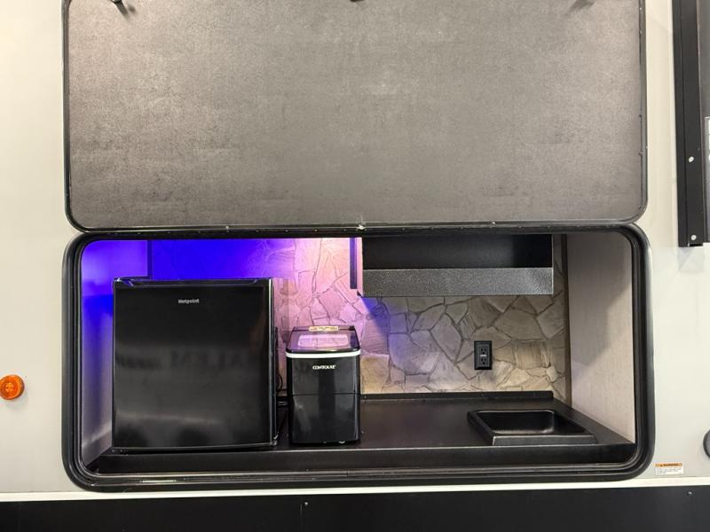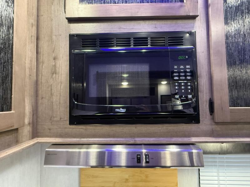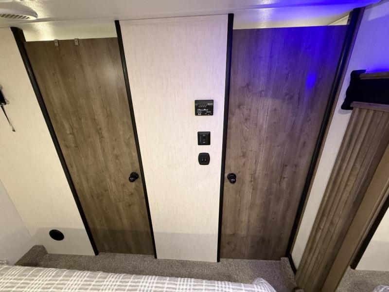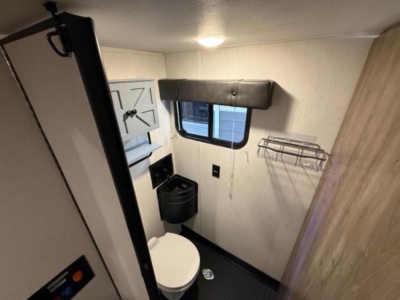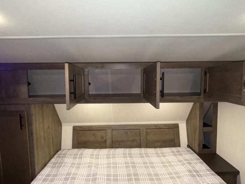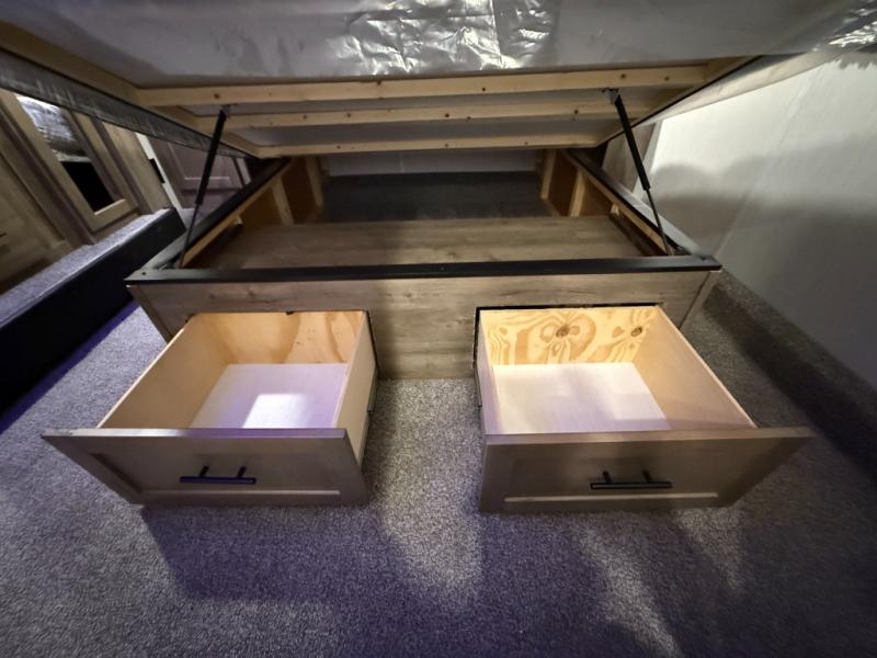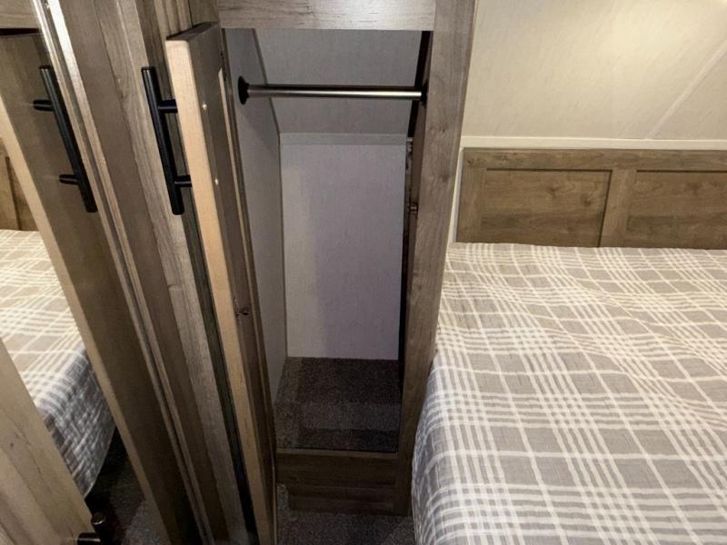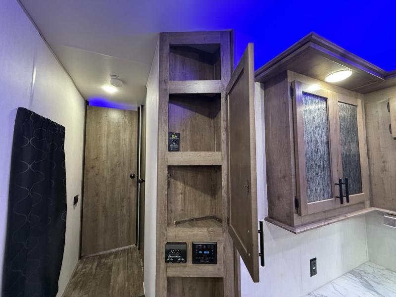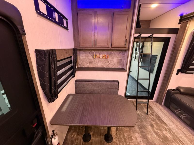 An outside kitchen, a loft, plus dual entry doors make this unit the one! Your guests will love the 13' separate garage that includes a Happijac power bed, plus their own half bath for convenience. The bathroom walls can fold to provide more space when loading toys, and the ramp door can convert to a "party patio" for more fun. Now, that sounds like a fun bunkhouse! Head to the main living area to relax on the party recliner sofa within the large slide, and you can grab a snack from the large pantry. When sleep is calling your name head to front master bedroom for a great night's rest on the Wolf Pack king bed, and you can store your clothes in the slide out wardrobe. This model also includes a pass-through storage with D-rings so you can secure your gear on the way to the campground!