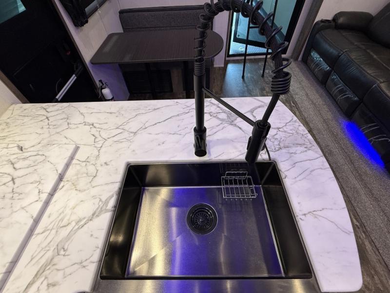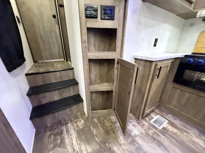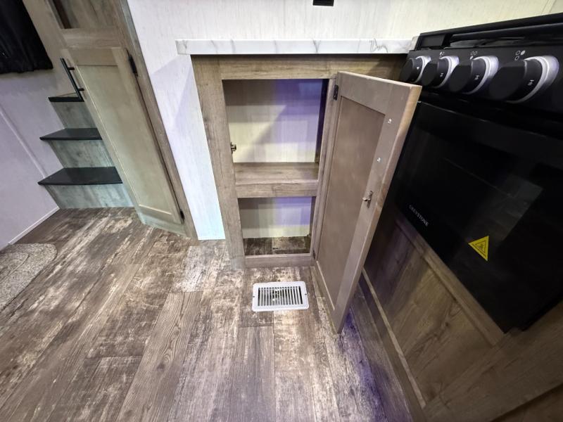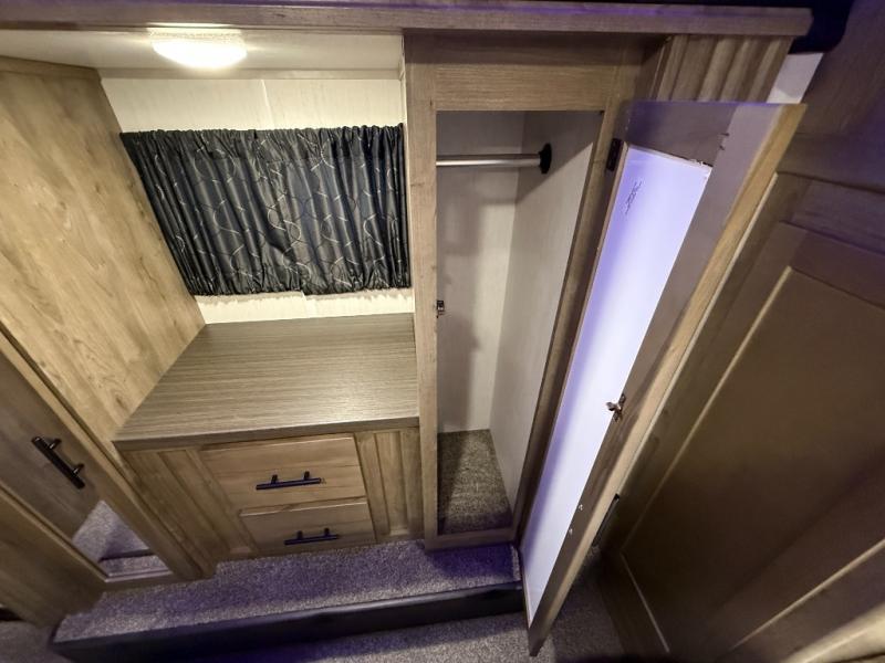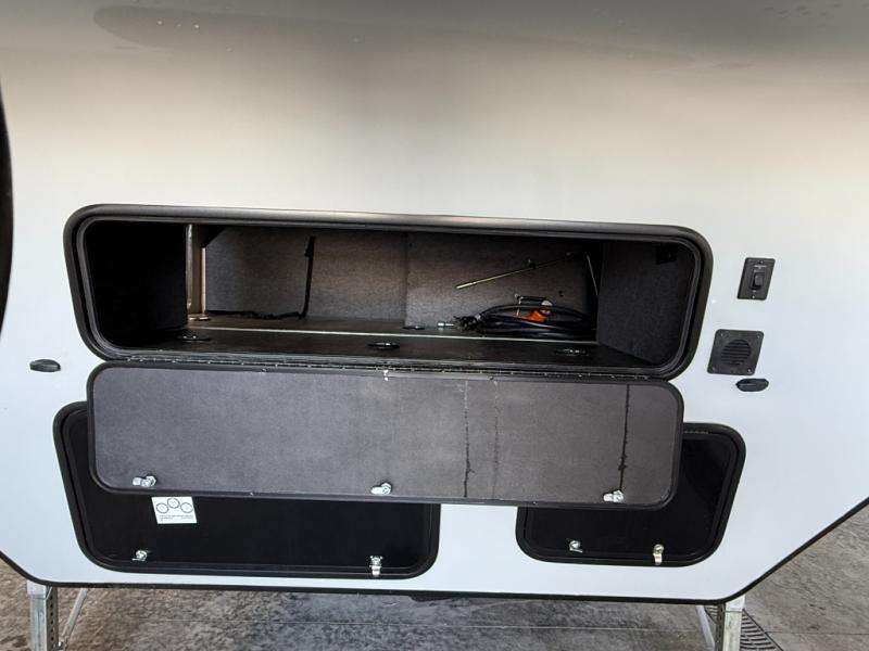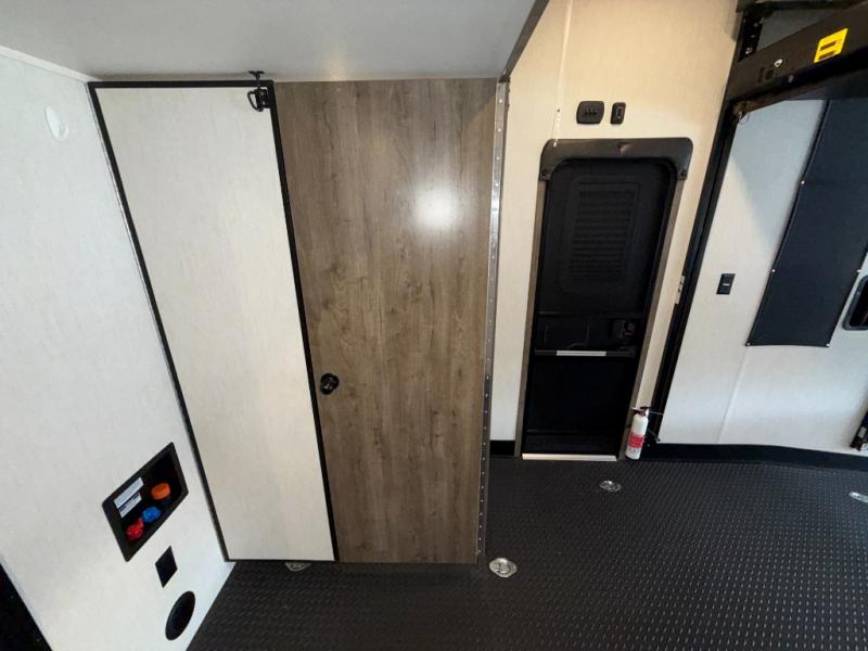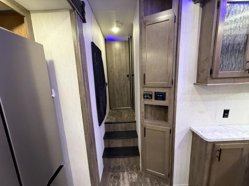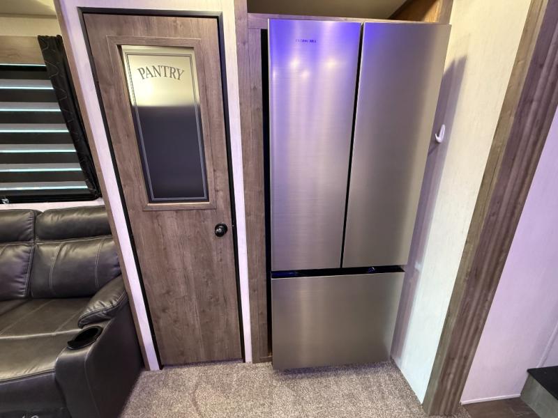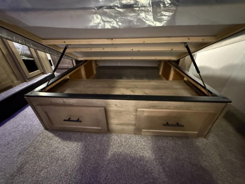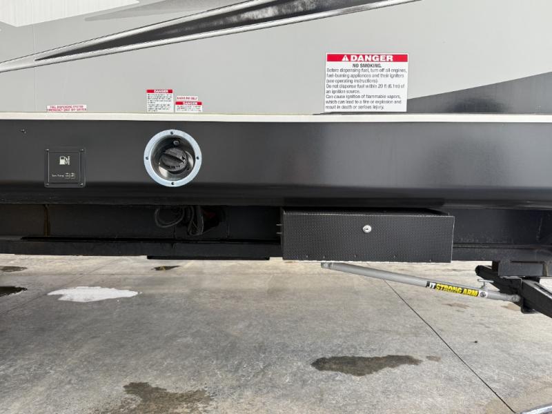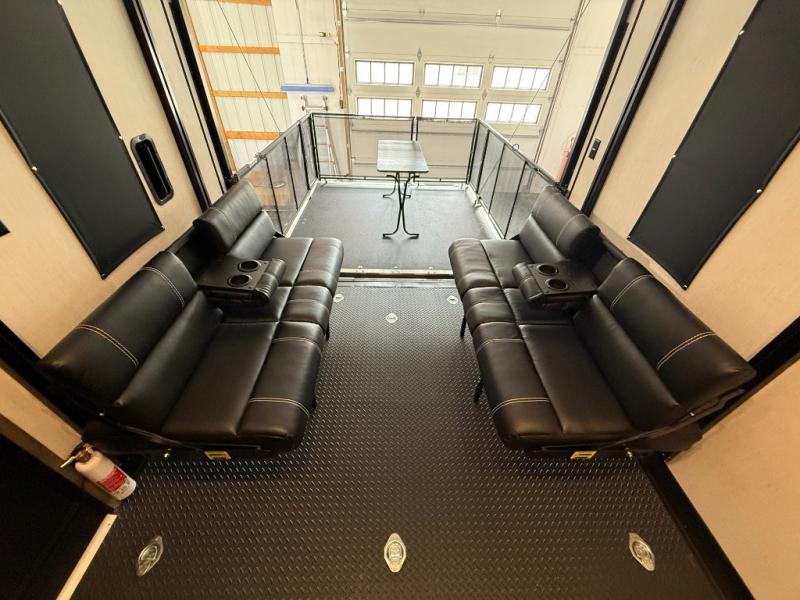 An outside kitchen, a loft, plus dual entry doors make this unit the one! Your guests will love the 13' separate garage that includes a Happijac power bed, plus their own half bath for convenience. The bathroom walls can fold to provide more space when loading toys, and the ramp door can convert to a "party patio" for more fun. Now, that sounds like a fun bunkhouse! Head to the main living area to relax on the party recliner sofa within the large slide, and you can grab a snack from the large pantry. When sleep is calling your name head to front master bedroom for a great night's rest on the Wolf Pack king bed, and you can store your clothes in the slide out wardrobe. This model also includes a pass-through storage with D-rings so you can secure your gear on the way to the campground!