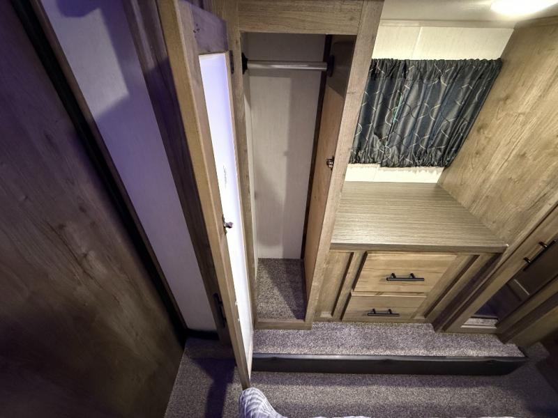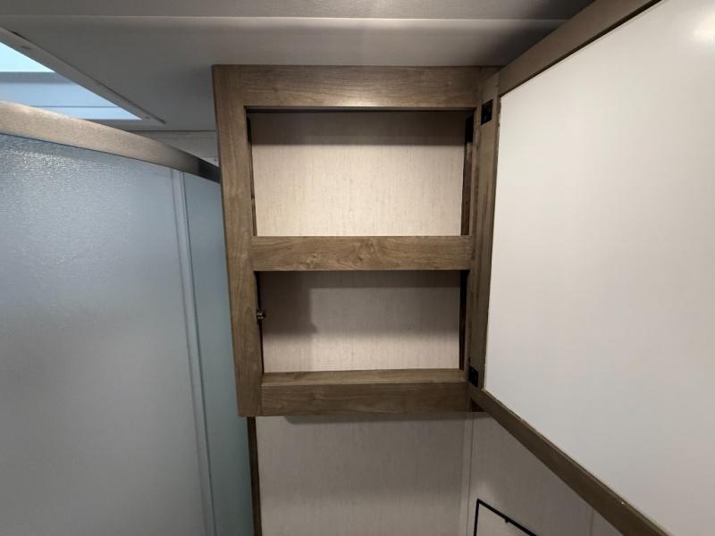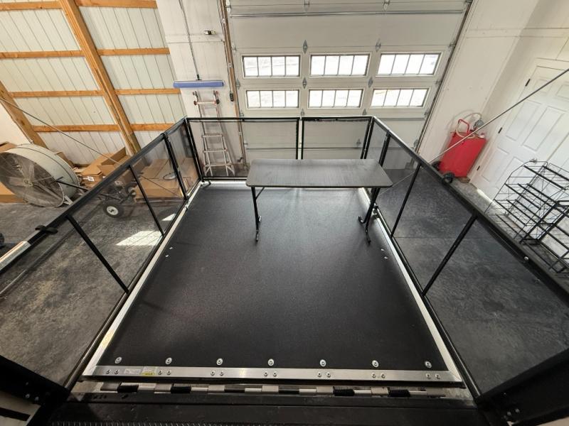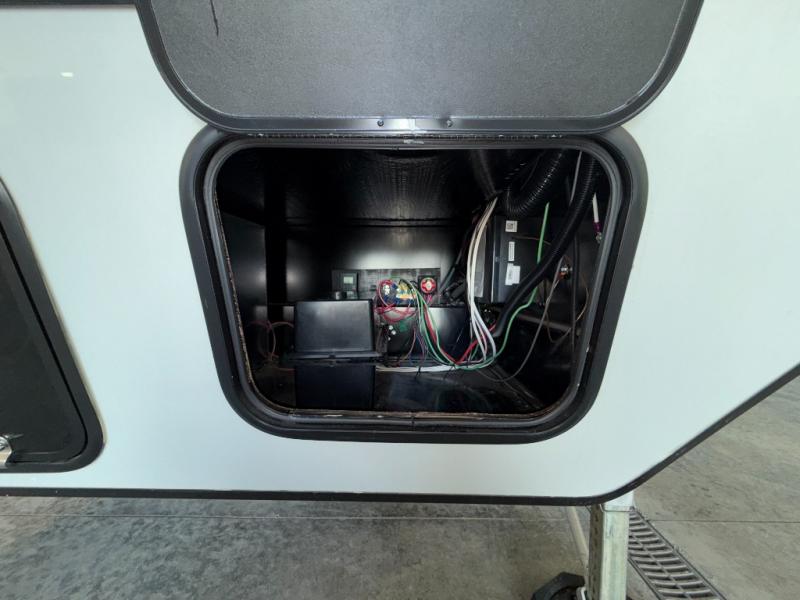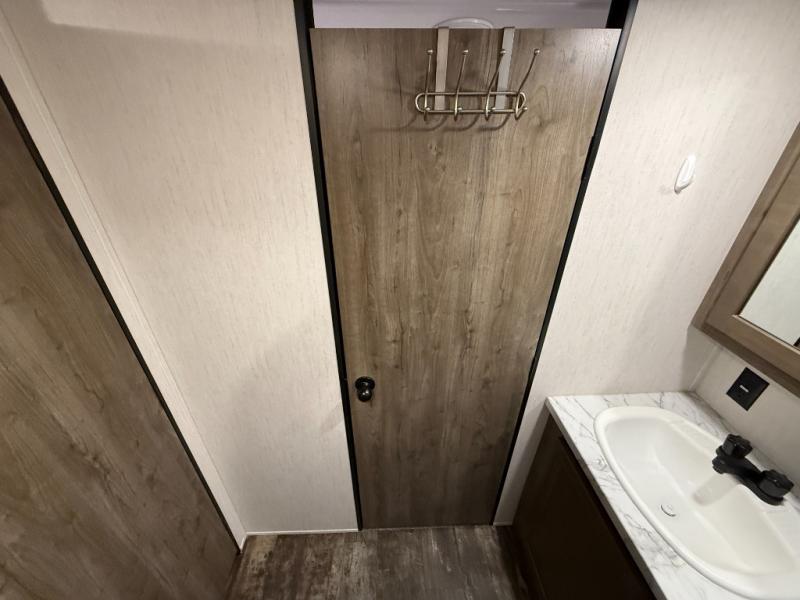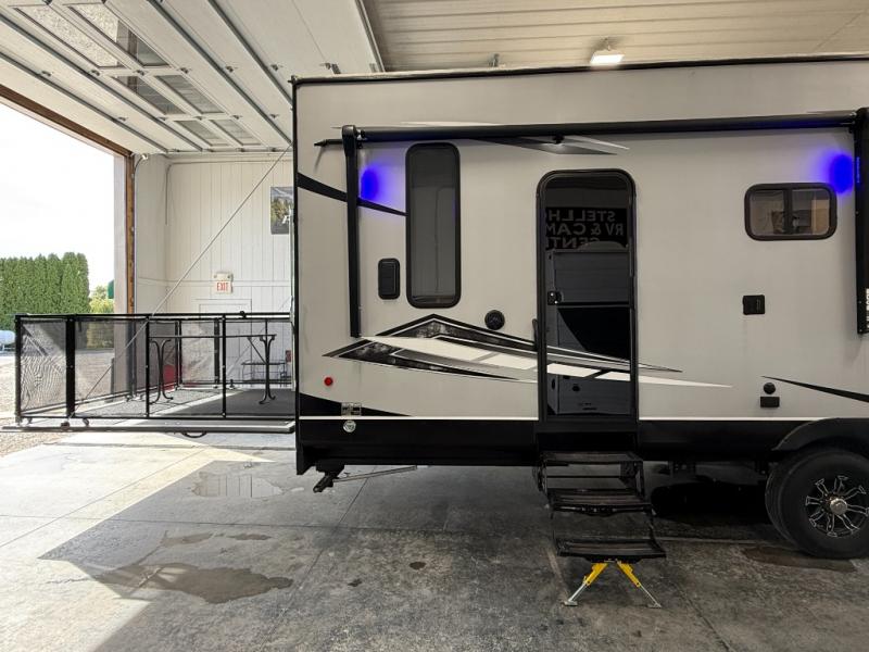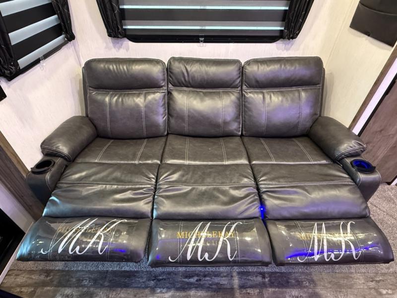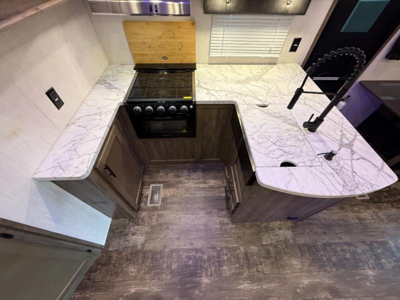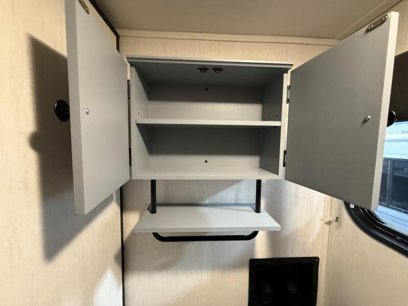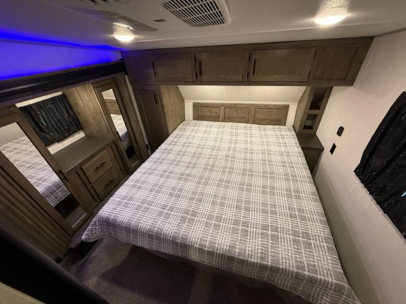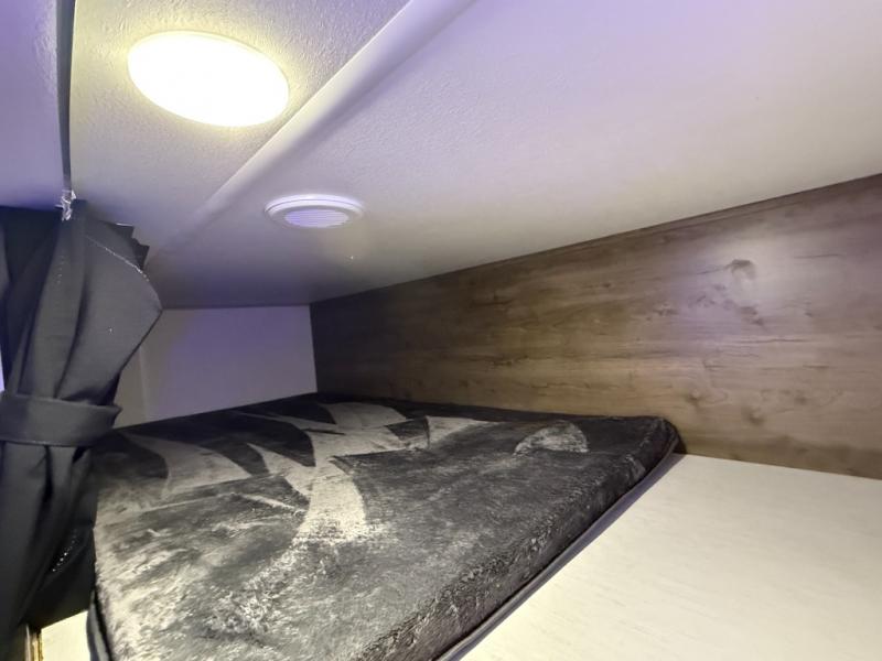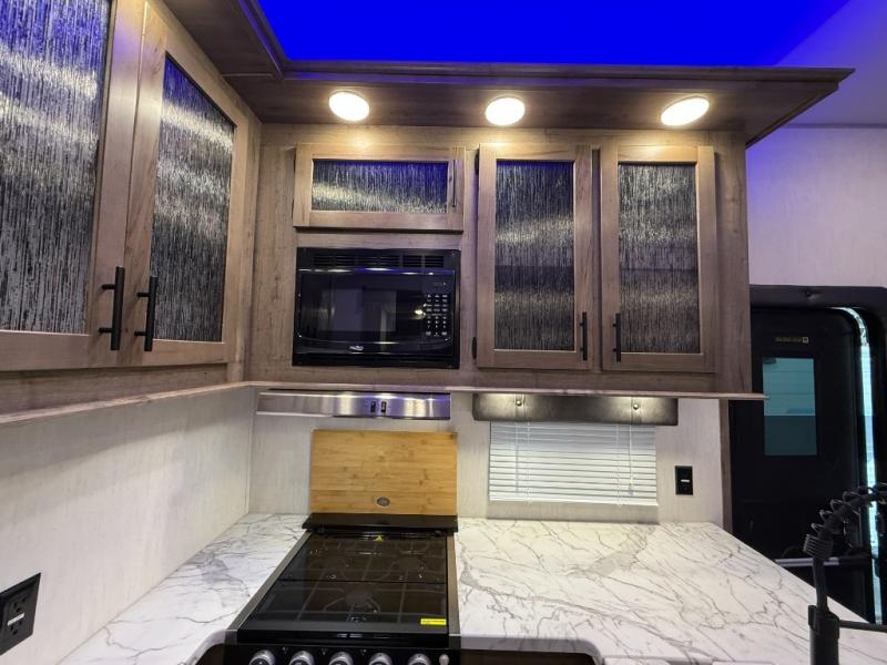 An outside kitchen, a loft, plus dual entry doors make this unit the one! Your guests will love the 13' separate garage that includes a Happijac power bed, plus their own half bath for convenience. The bathroom walls can fold to provide more space when loading toys, and the ramp door can convert to a "party patio" for more fun. Now, that sounds like a fun bunkhouse! Head to the main living area to relax on the party recliner sofa within the large slide, and you can grab a snack from the large pantry. When sleep is calling your name head to front master bedroom for a great night's rest on the Wolf Pack king bed, and you can store your clothes in the slide out wardrobe. This model also includes a pass-through storage with D-rings so you can secure your gear on the way to the campground!
