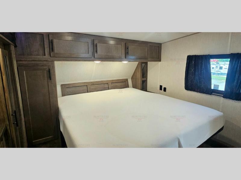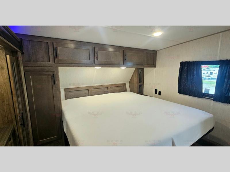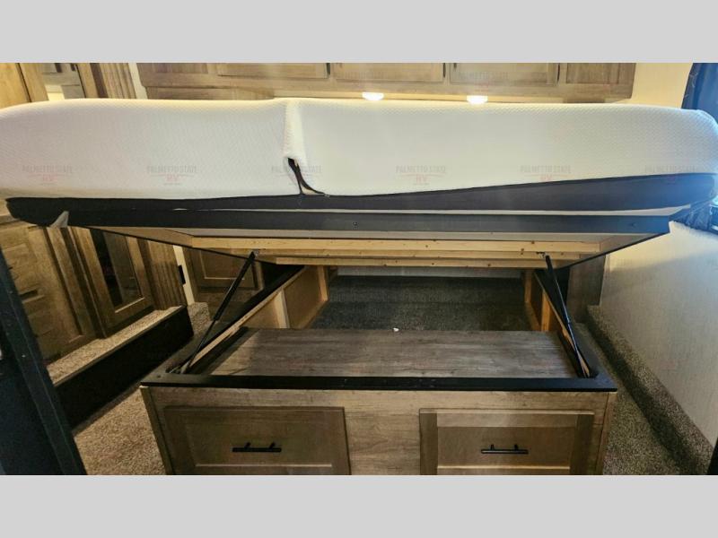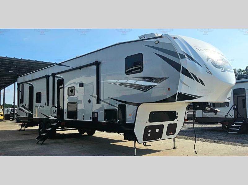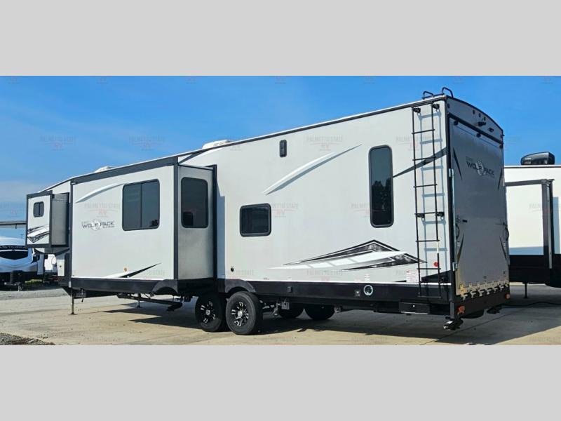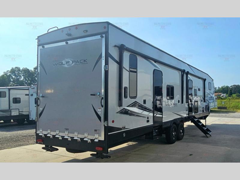 Run with the pack in any one of these Forest River Cherokee Wolf Pack toy haulers! They are affordable and versatile with a 102" widebody design to pack in all of the necessary features for a great adventure with your family and toys. The grey high gloss gel exterior will turn heads on the highway and the LED interior/exterior lights will make life easier. An outside shower with hot and cold water helps to keep the mud outside where it belongs. With an external 30 gallon fuel station, you won't have to worry about your toys being low on fuel. The Platinum package adds extra conveniences like a ramp door patio deck railing system, a Happijac bed lift system, and an industrial rubber garage floor on enclosed garage models. Come find the perfect model for you today!