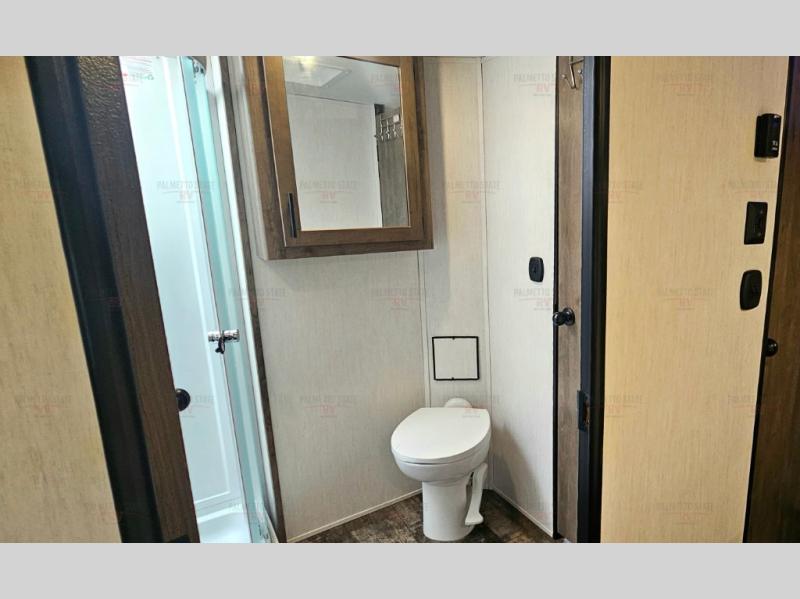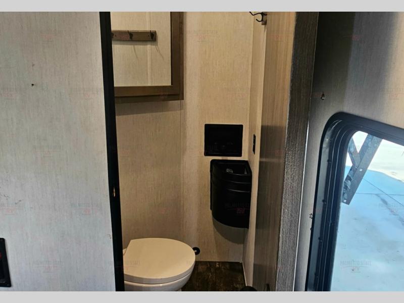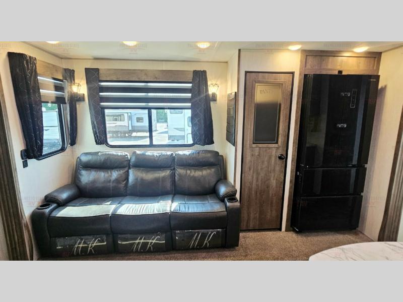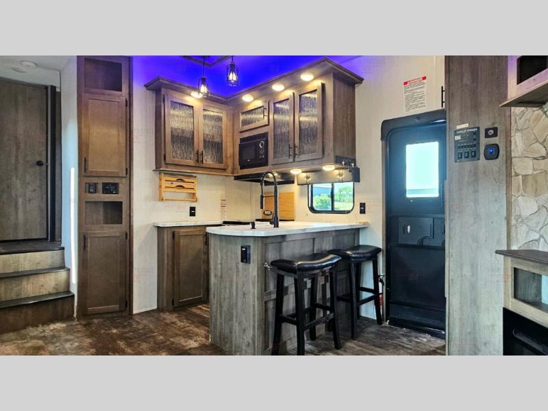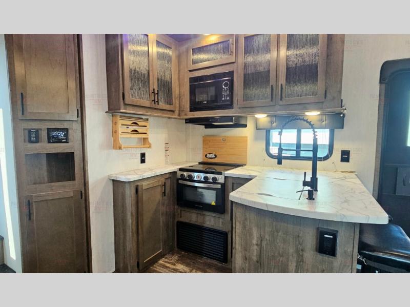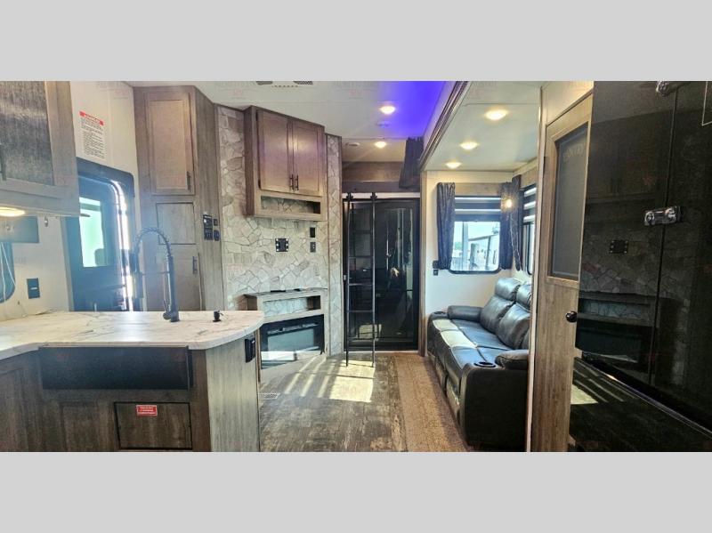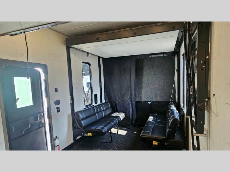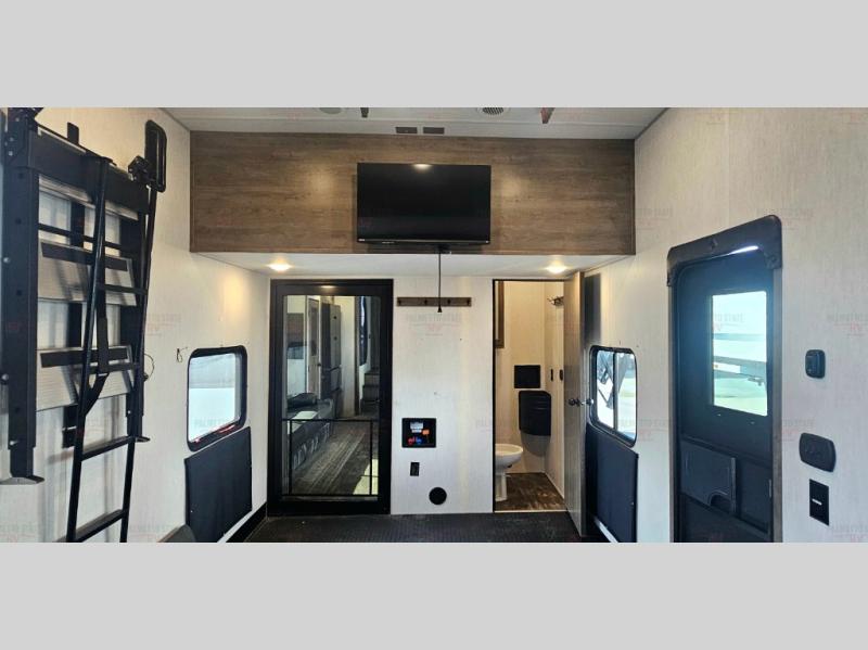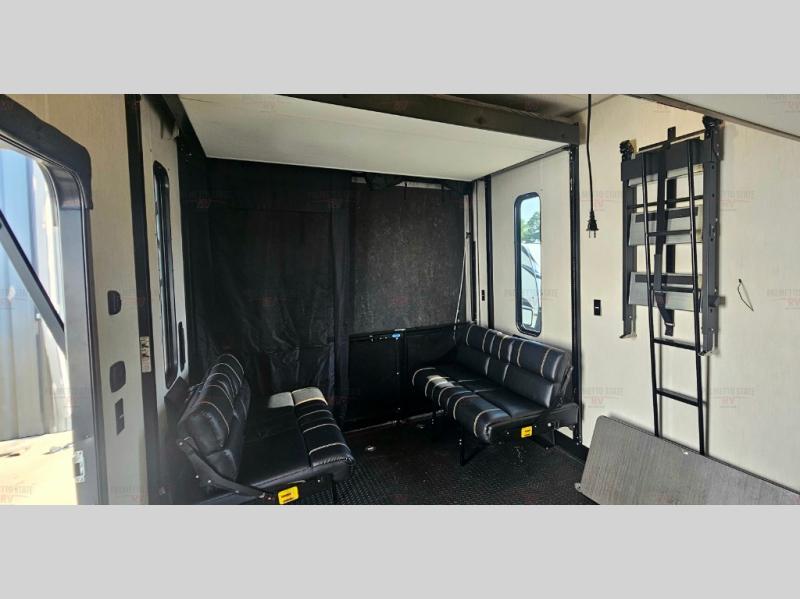Pack your bags and load up your favorite toys into the 14' 6" garage area of this toy hauler! Once you have arrived at your destination, you can set up the folding dinette table with a Happijac bed lift system above it, plus there is an area to add the optional washer and dryer, a half bathroom, one of the dual entry doors into the unit, and a loft above it all. The chef will enjoy the company of those sitting at the bar top with bar stools while they prepare dinner or everyone can head to the outside kitchen and play games while the burgers are grilling. Gather together at night on the party recliner sofa with an end table on one side and pantry on the other all of which is across from the entertainment center with a fireplace. The front private bedroom has a 67" x 74" Wolf Pack king bed to lay your head on at night and even has an entrance into the dual entry bathroom which will come in handy at night!