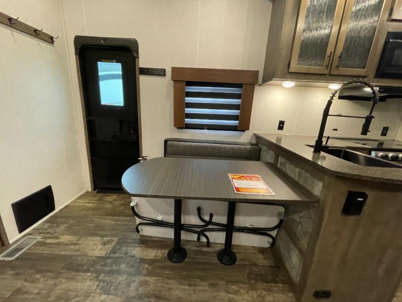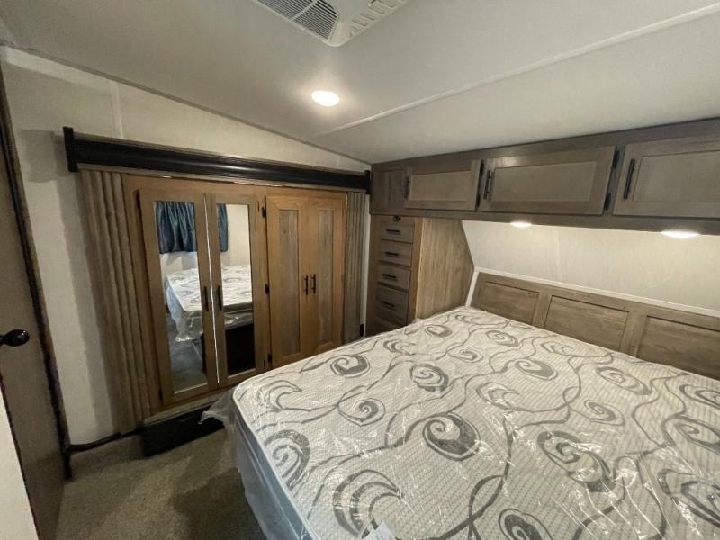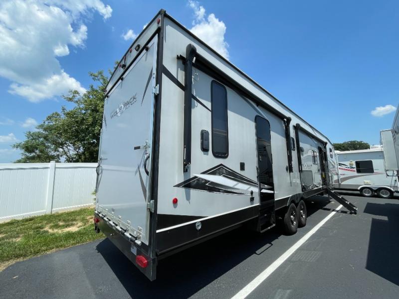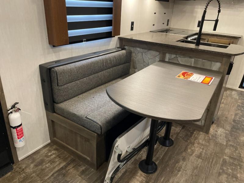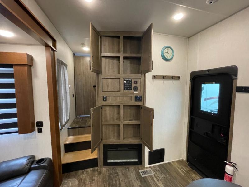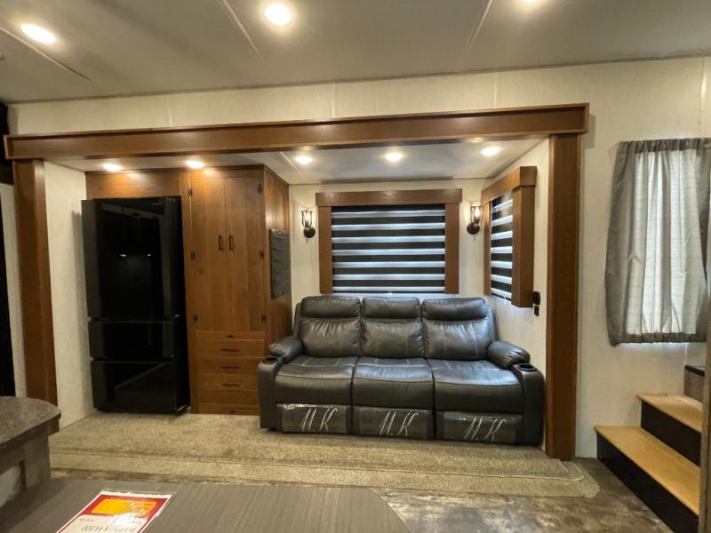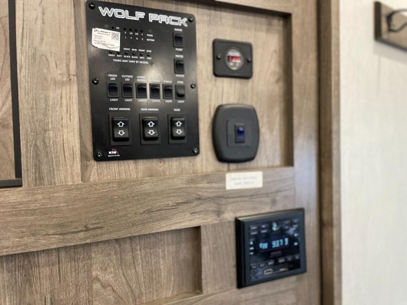 Come see all that this toy hauler has to offer! From the folding half bathroom walls in the 15' 10" garage to the outside kitchen protected by one of the two power awnings. The garage area also has a folding dinette table with a Happijac bed lift system above it, an area prepped to add an optional washer and dryer, and one of the dual entry doors to the unit. The little ones will love the loft above it all, and a 96" x 96" ramp door "party patio" will be perfect for guests. The open kitchen has everything you need to prepare your best home cooked meals including a large pantry and a table with bench seating to enjoy them at. Relax each night on the party recliner sofa while enjoying the fireplace across from it. The dual entry bathroom has a radius shower and is easy for everyone to access, especially those staying in the front private bedroom where there is a 67" x 74" Wolf Pack king bed to lay your head on at night and a wardrobe with nightstand slide!
