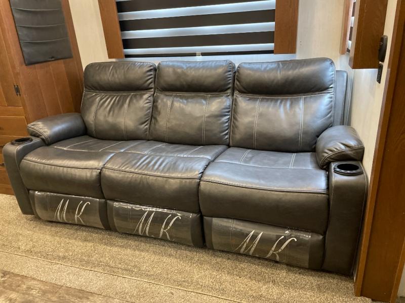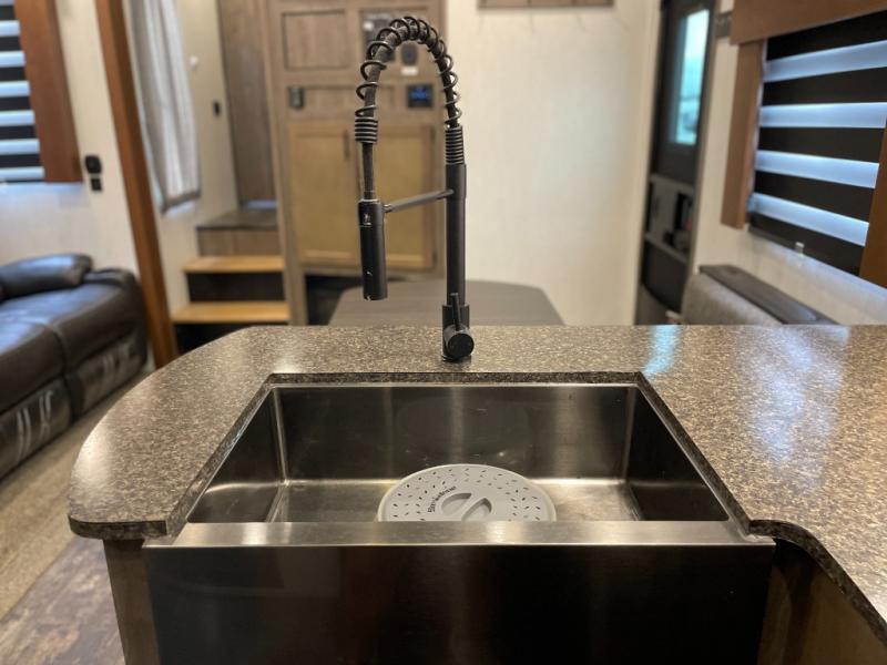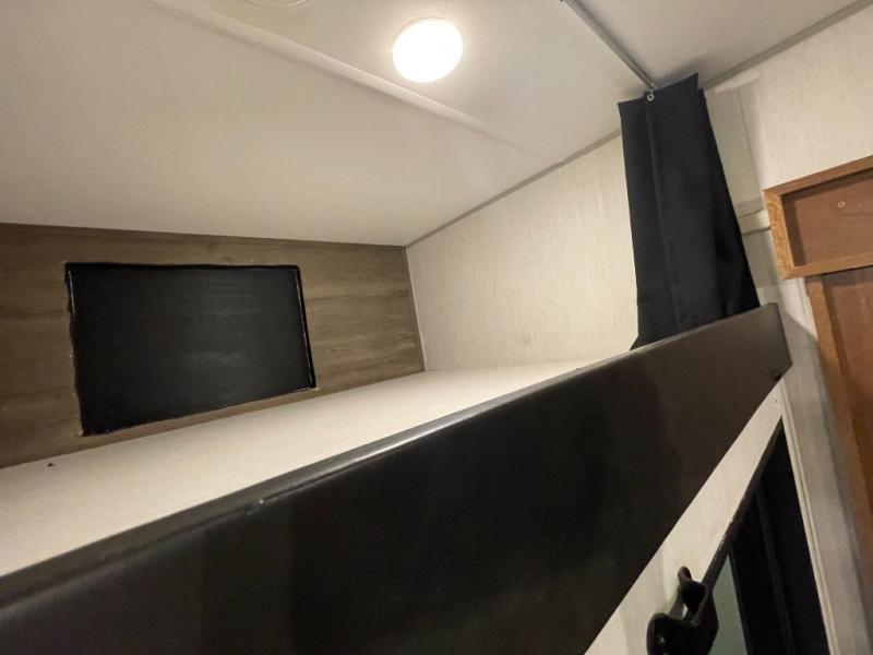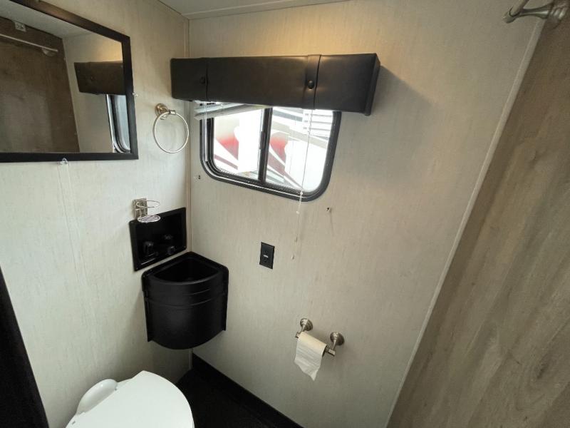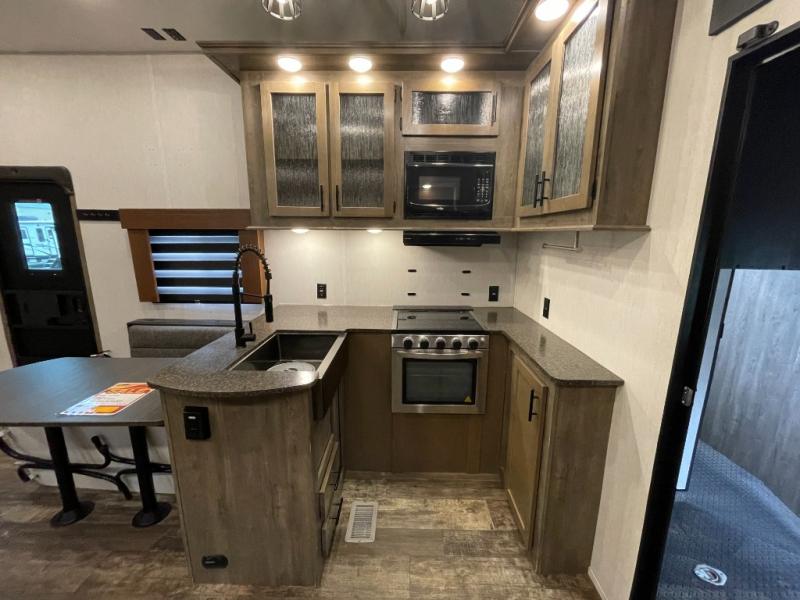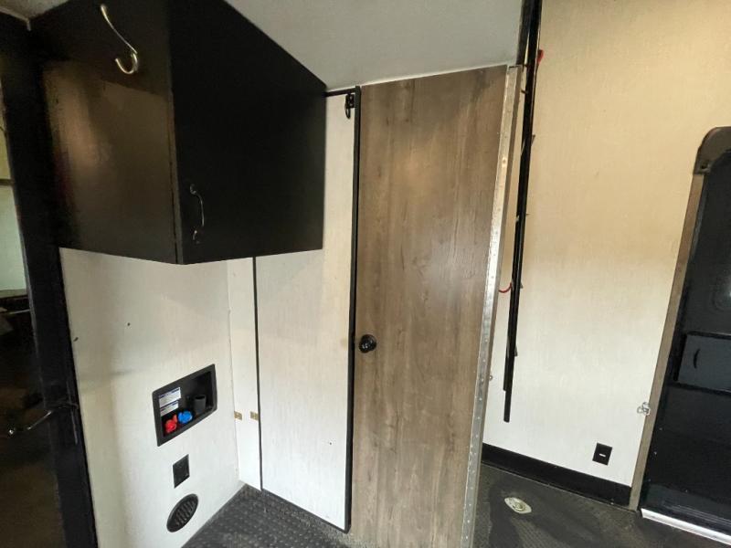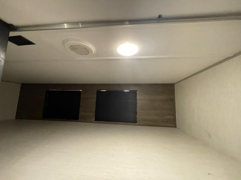 Come see all that this toy hauler has to offer! From the folding half bathroom walls in the 15' 10" garage to the outside kitchen protected by one of the two power awnings. The garage area also has a folding dinette table with a Happijac bed lift system above it, an area prepped to add an optional washer and dryer, and one of the dual entry doors to the unit. The little ones will love the loft above it all, and a 96" x 96" ramp door "party patio" will be perfect for guests. The open kitchen has everything you need to prepare your best home cooked meals including a large pantry and a table with bench seating to enjoy them at. Relax each night on the party recliner sofa while enjoying the fireplace across from it. The dual entry bathroom has a radius shower and is easy for everyone to access, especially those staying in the front private bedroom where there is a 67" x 74" Wolf Pack king bed to lay your head on at night and a wardrobe with nightstand slide!