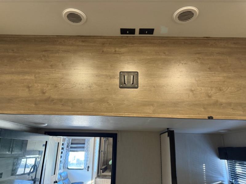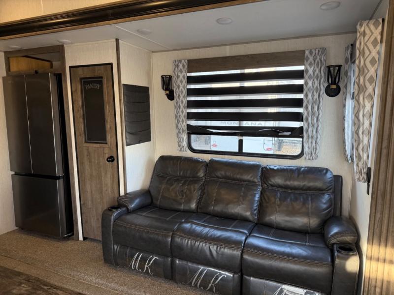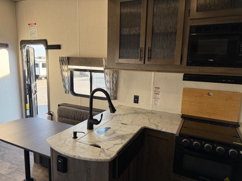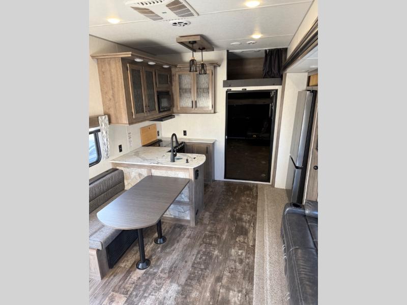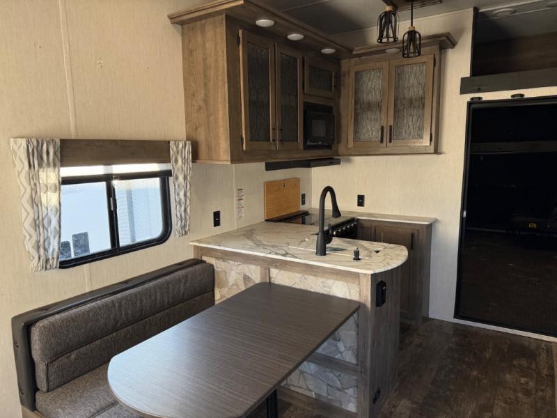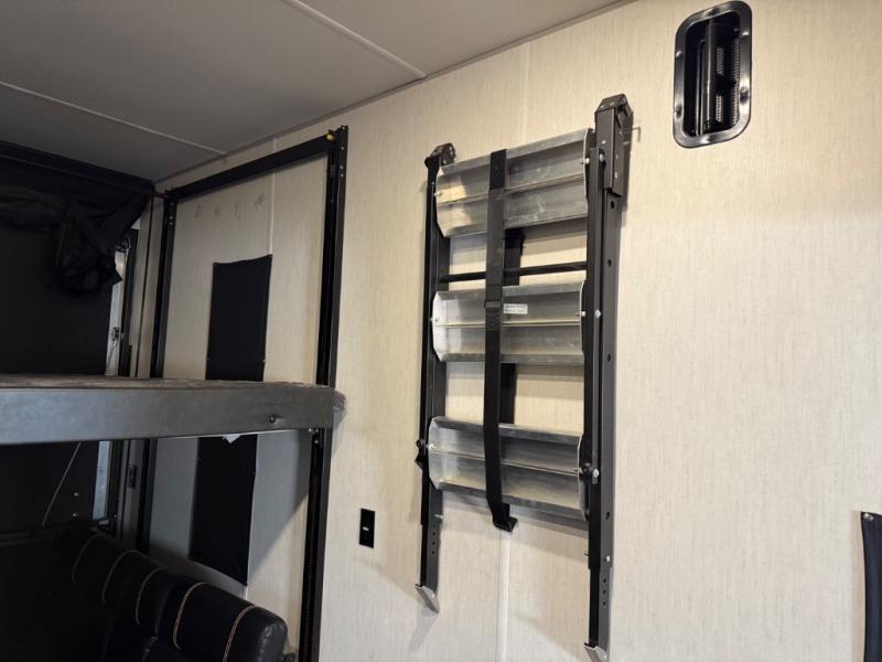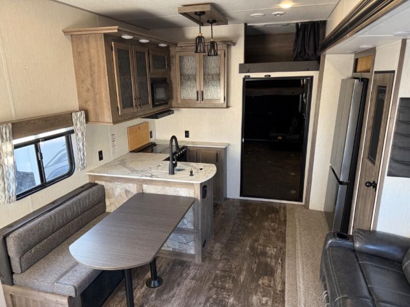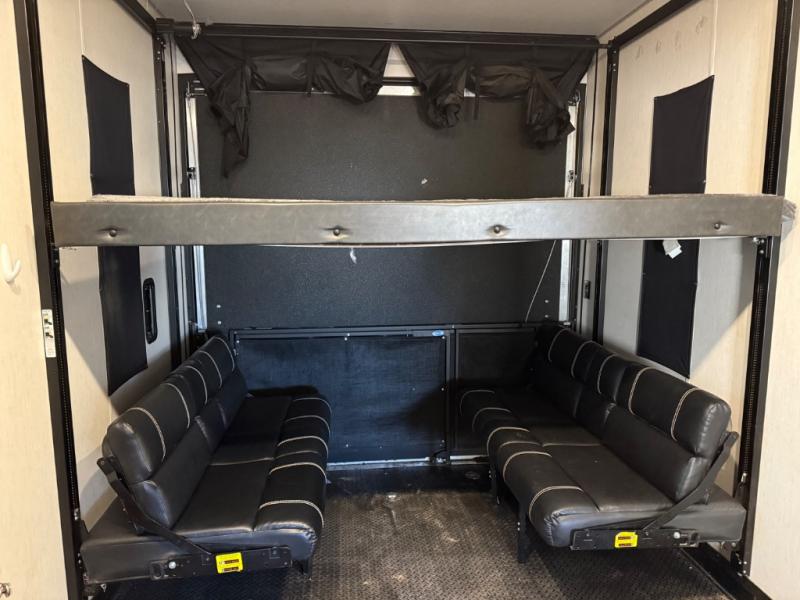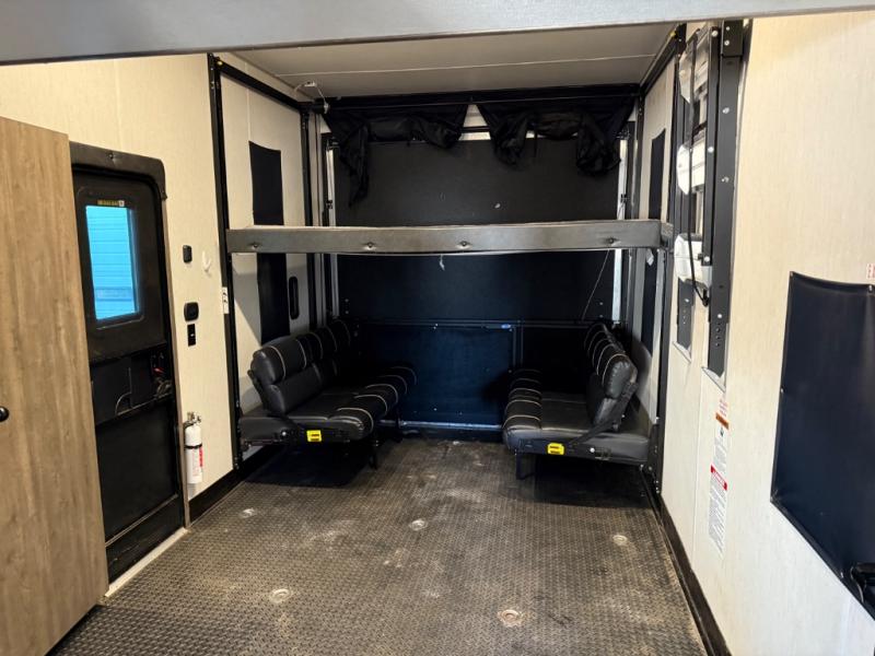 Come see all that this toy hauler has to offer! From the folding half bathroom walls in the 15' 10" garage to the outside kitchen protected by one of the two power awnings. The garage area also has a folding dinette table with a Happijac bed lift system above it, an area prepped to add an optional washer and dryer, and one of the dual entry doors to the unit. The little ones will love the loft above it all, and a 96" x 96" ramp door "party patio" will be perfect for guests. The open kitchen has everything you need to prepare your best home cooked meals including a large pantry and a table with bench seating to enjoy them at. Relax each night on the party recliner sofa while enjoying the fireplace across from it. The dual entry bathroom has a radius shower and is easy for everyone to access, especially those staying in the front private bedroom where there is a 67" x 74" Wolf Pack king bed to lay your head on at night and a wardrobe with nightstand slide!