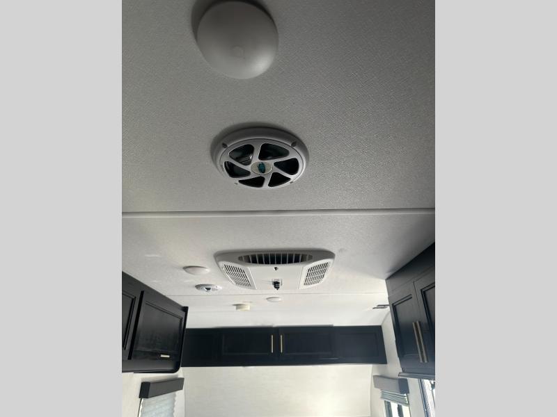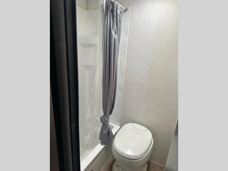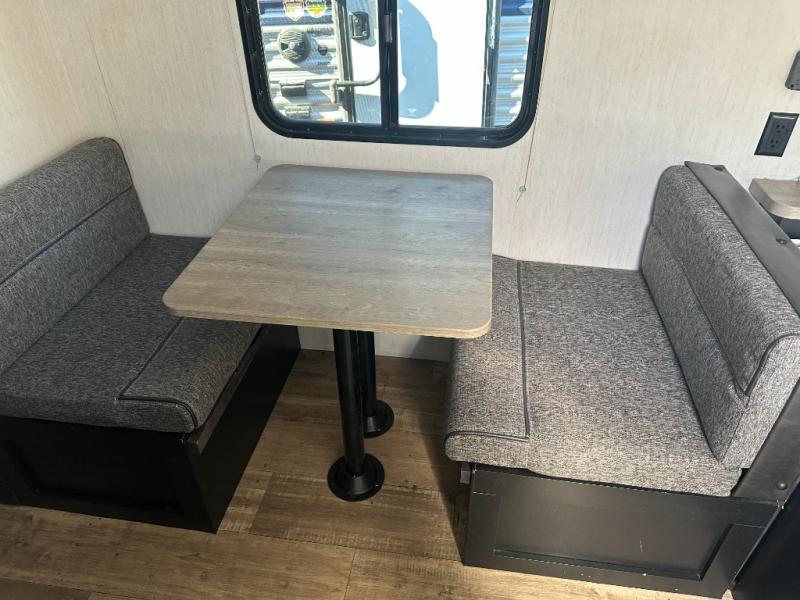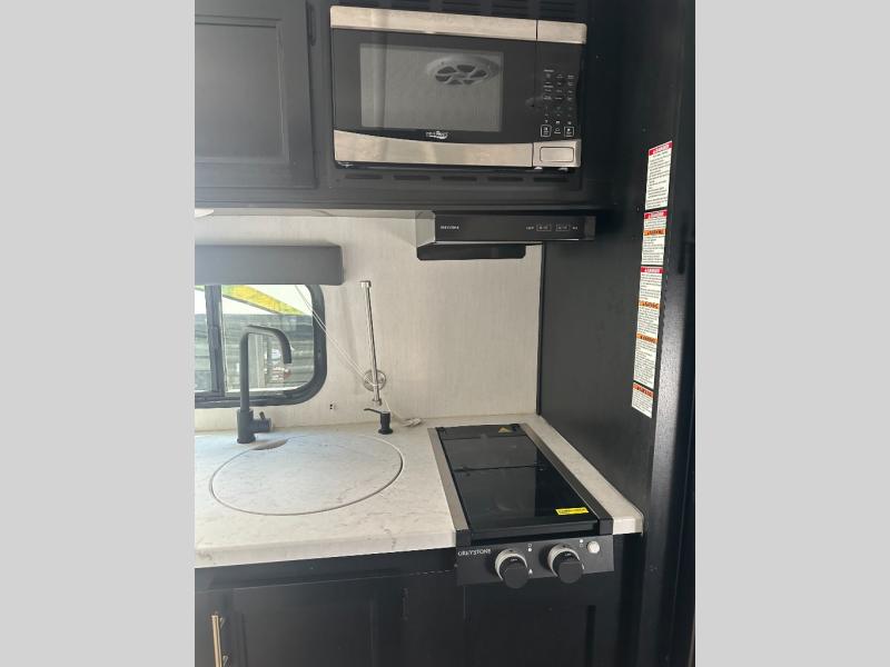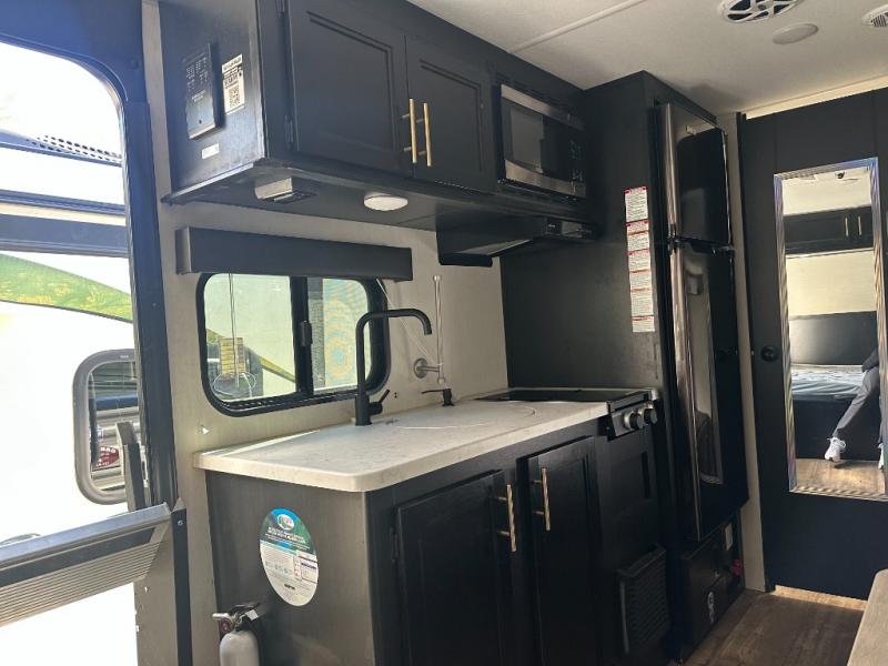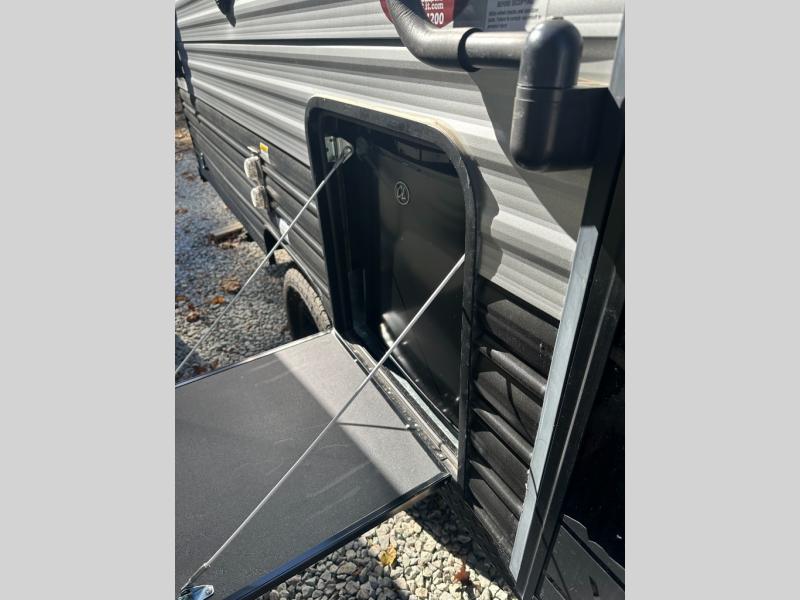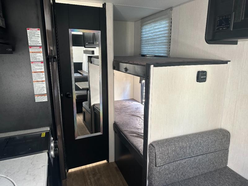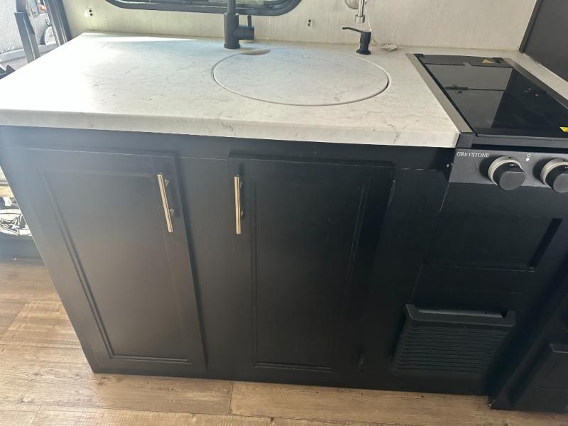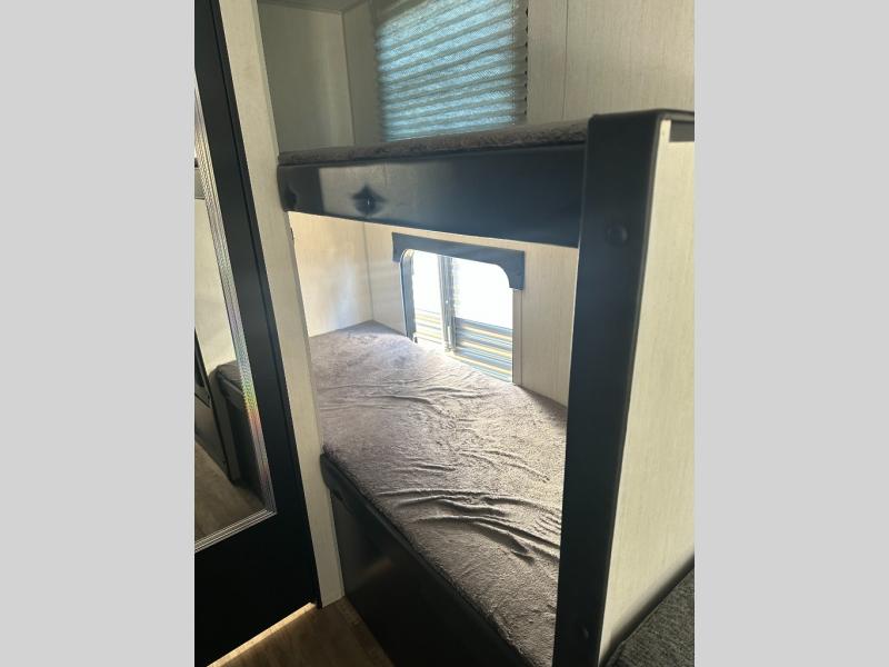 The whole family can sleep comfortably in this travel trailer! It has a set of bunk beds for the kids to sleep on with a TV mount location for extra entertainment, and you can sleep comfortably on the front queen bed with overhead cabinets and a shelf. There is even an exterior pack and play door that accesses the storage space under the bottom bunk. The chef will enjoy preparing their best home cooked meals either indoors with the high output cooktop or at the outside mini kitchen while staying protected by the 12' power awning, plus you have an outside TV mount location for added entertainment while you cook!
