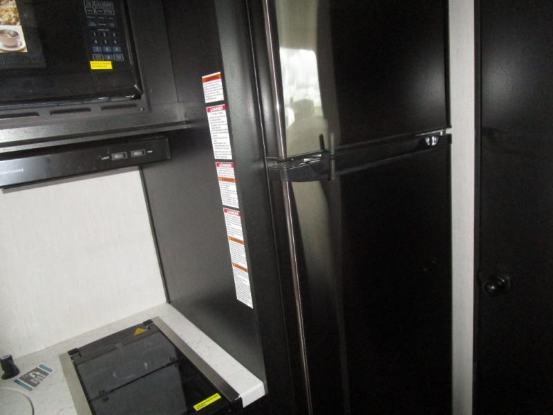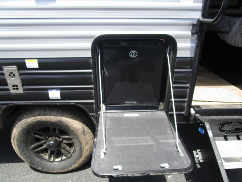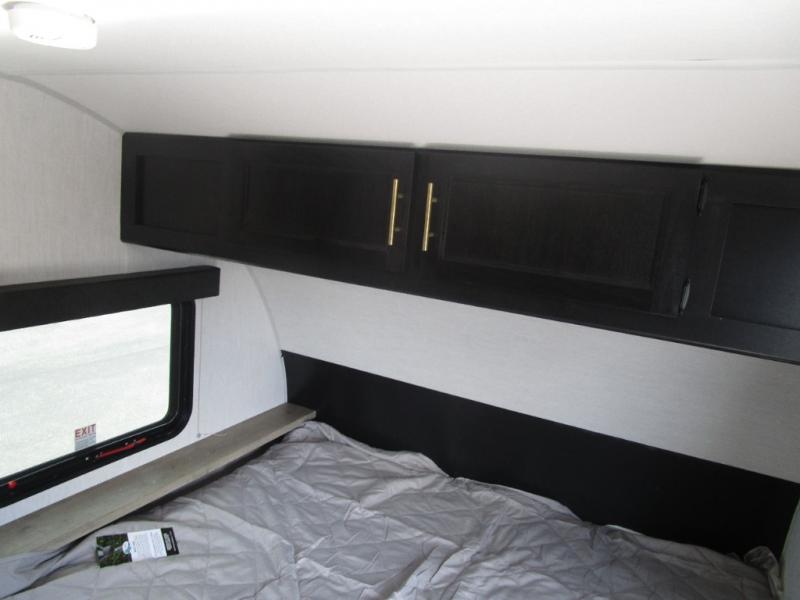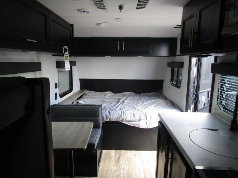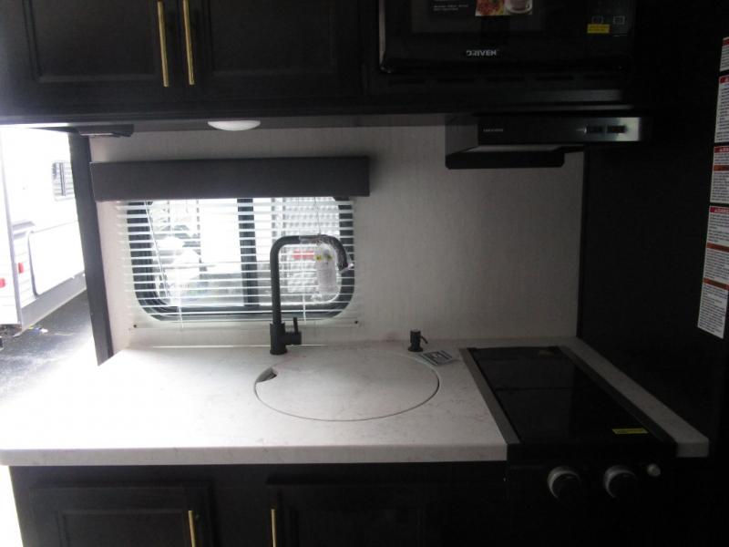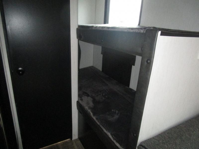 The whole family can sleep comfortably in this travel trailer! It has a set of bunk beds for the kids to sleep on with a TV mount location for extra entertainment, and you can sleep comfortably on the front queen bed with overhead cabinets and a shelf. There is even an exterior pack and play door that accesses the storage space under the bottom bunk. The chef will enjoy preparing their best home cooked meals either indoors with the high output cooktop or at the outside mini kitchen while staying protected by the 12' power awning, plus you have an outside TV mount location for added entertainment while you cook!