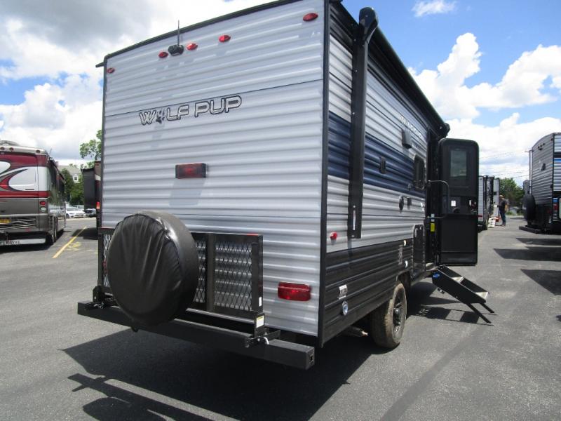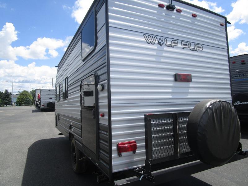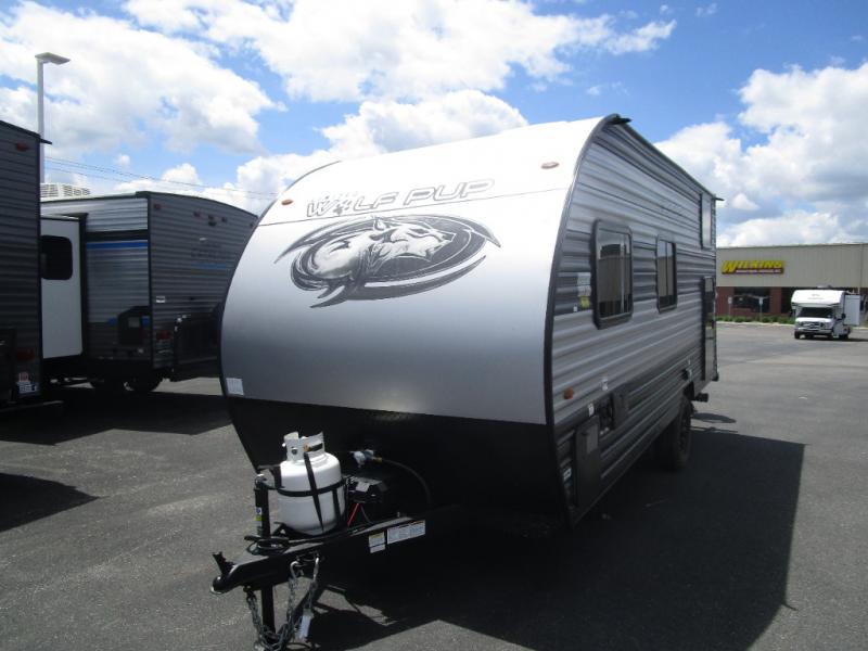 Each one of these Forest River Cherokee Wolf Pup travel trailers and toy haulers are lightweight and easy to tow! They are fully self contained with ample tank capacities, an abundance of storage space, and filled with at home amenities. The aerodynamic smooth radius front profile, the Power Gear frame technology, and the space saver rail design make them easier to maneuver. You will also appreciate the seamless roofing membrane with heat reflectivity to keep the sun from making your unit a hot box. The tongue and groove plywood flooring will hold up for years of fun and the USB charging stations help to keep your electronics at 100% while you're away. Come find the best model for you today!