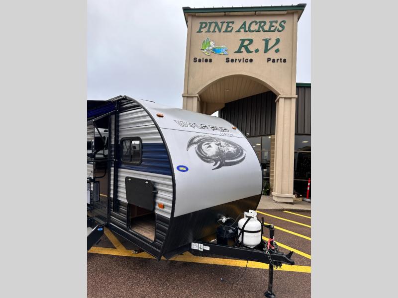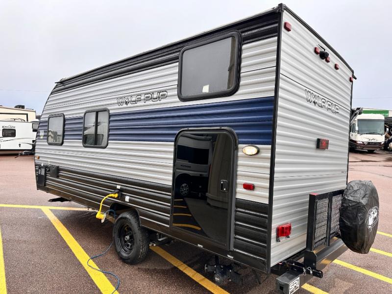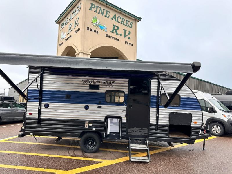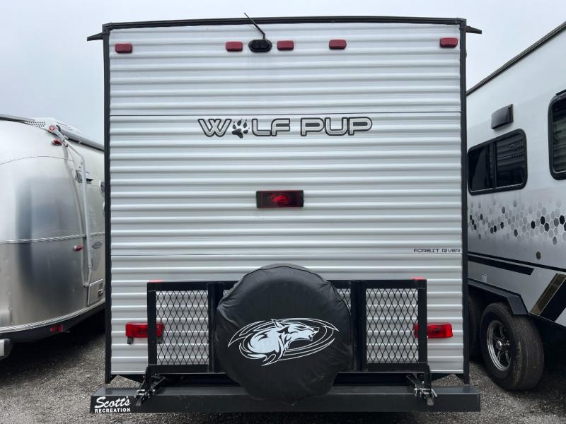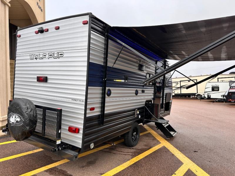Each one of these Forest River Cherokee Wolf Pup travel trailers and toy haulers are lightweight and easy to tow! They are fully self contained with ample tank capacities, an abundance of storage space, and filled with at home amenities. The aerodynamic smooth radius front profile, the Power Gear frame technology, and the space saver rail design make them easier to maneuver. You will also appreciate the seamless roofing membrane with heat reflectivity to keep the sun from making your unit a hot box. The tongue and groove plywood flooring will hold up for years of fun and the USB charging stations help to keep your electronics at 100% while you're away. Come find the best model for you today!