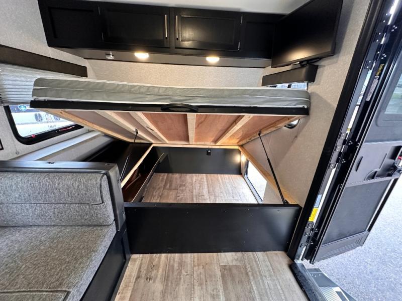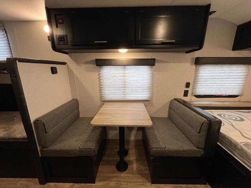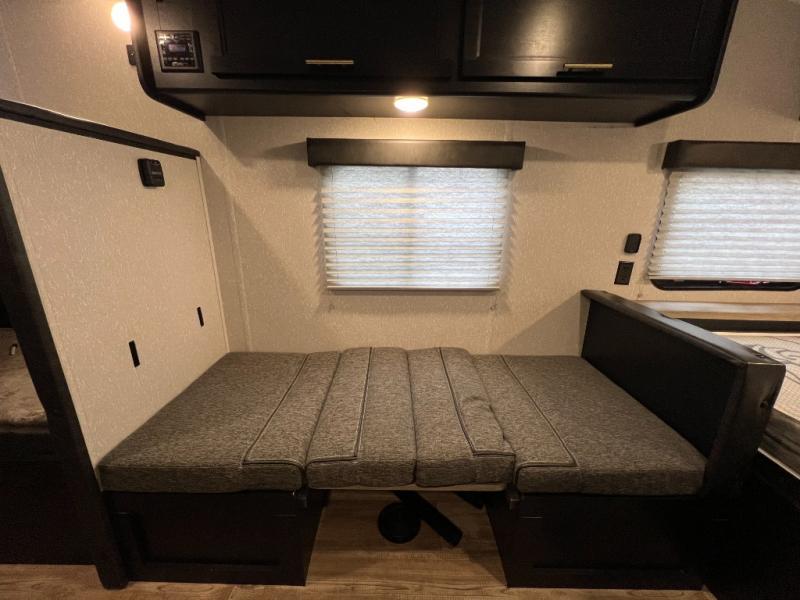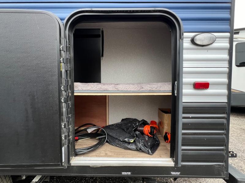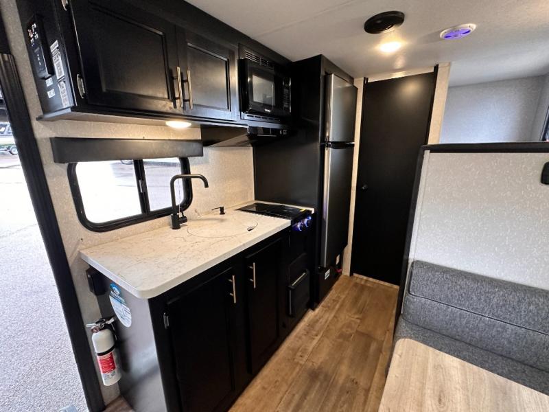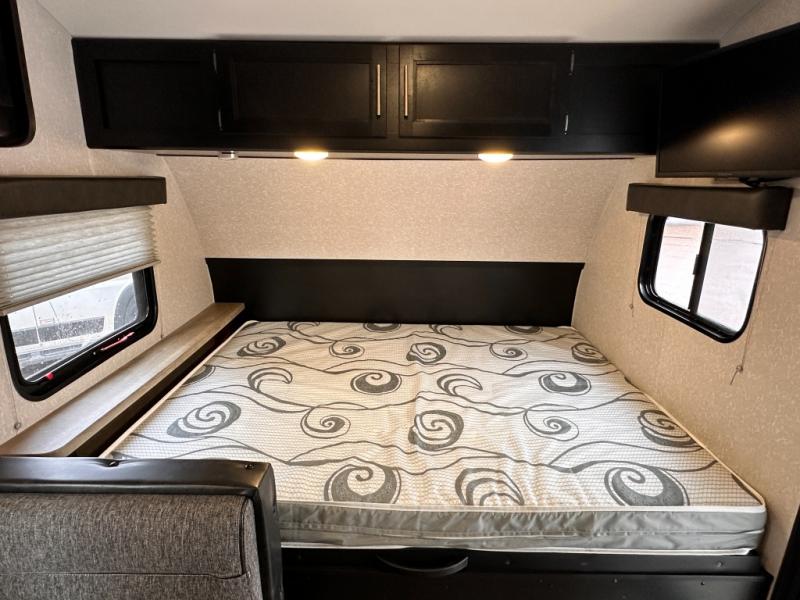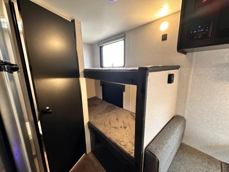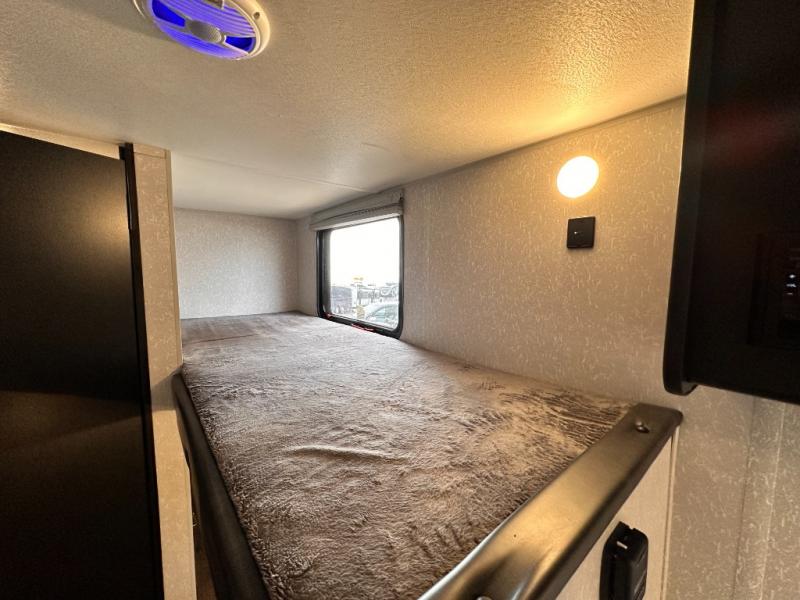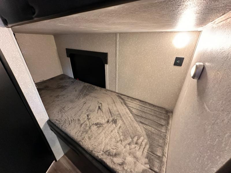 The whole family can sleep comfortably in this travel trailer! It has a set of bunk beds for the kids to sleep on with a TV mount location for extra entertainment, and you can sleep comfortably on the front queen bed with overhead cabinets and a shelf. There is even an exterior pack and play door that accesses the storage space under the bottom bunk. The chef will enjoy preparing their best home cooked meals either indoors with the high output cooktop or at the outside mini kitchen while staying protected by the 12' power awning, plus you have an outside TV mount location for added entertainment while you cook!