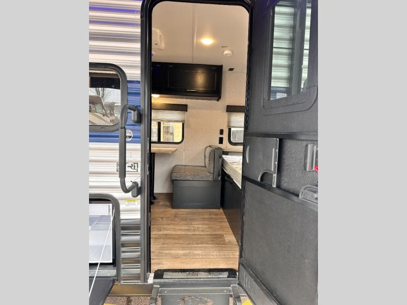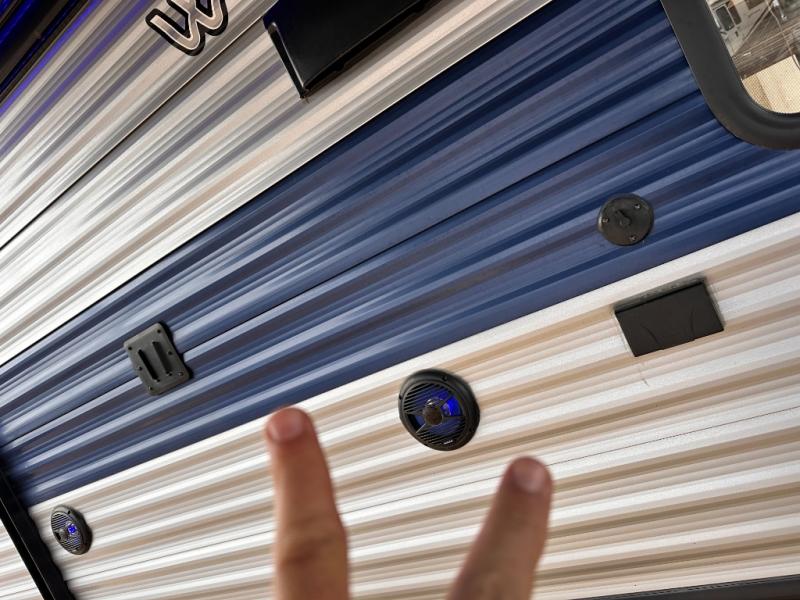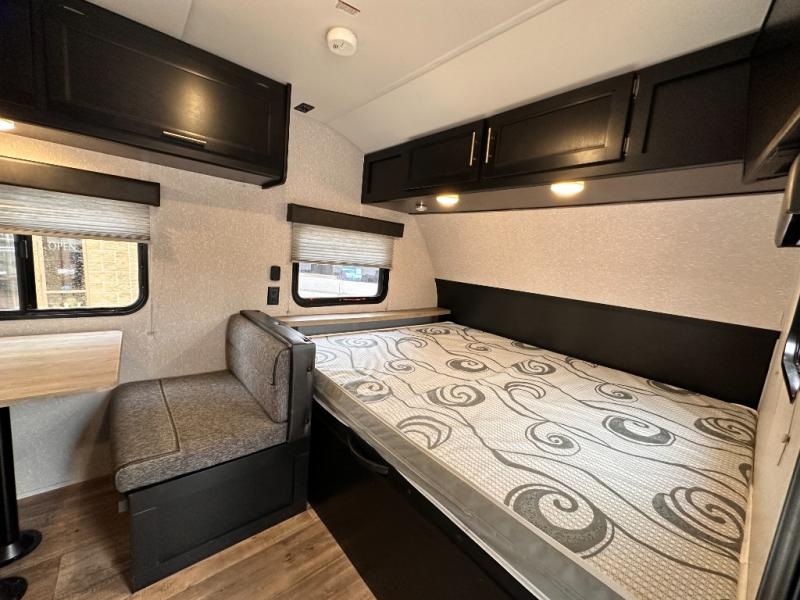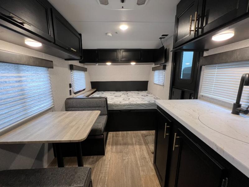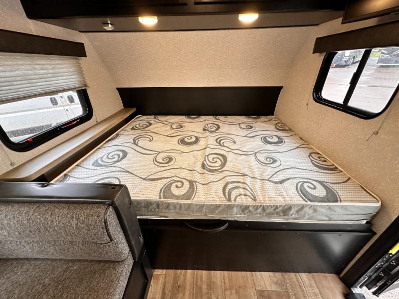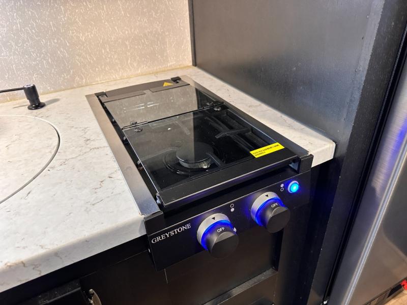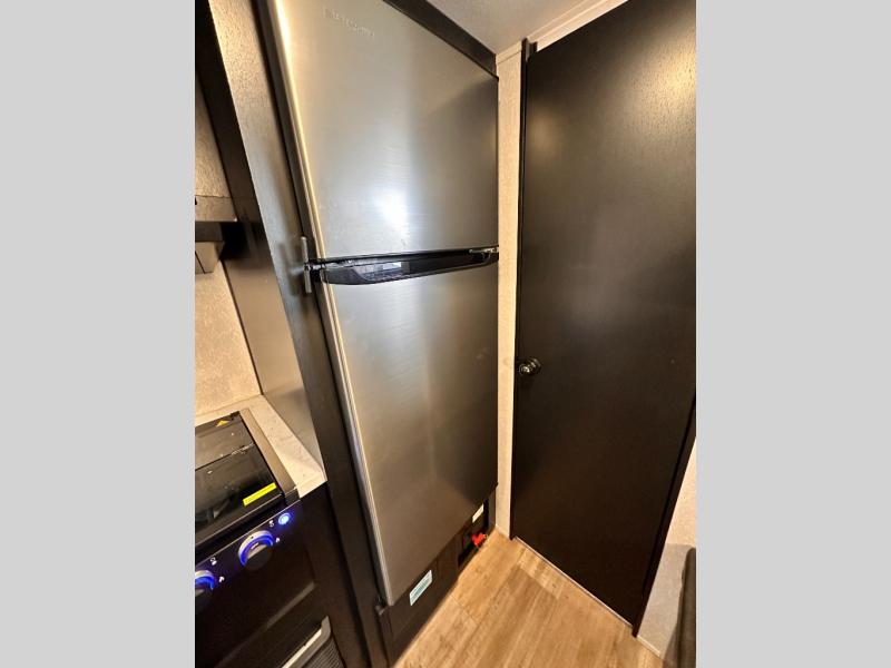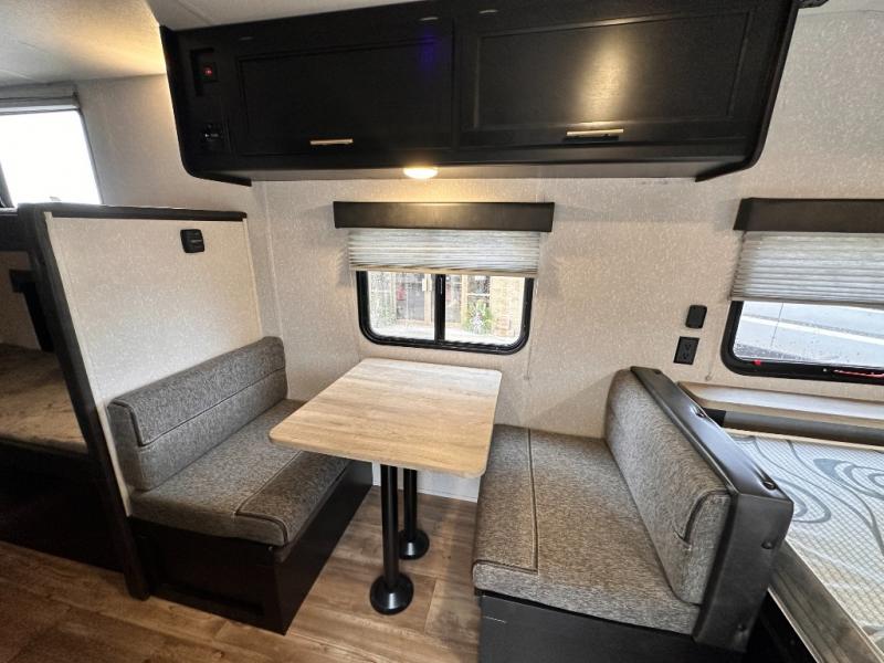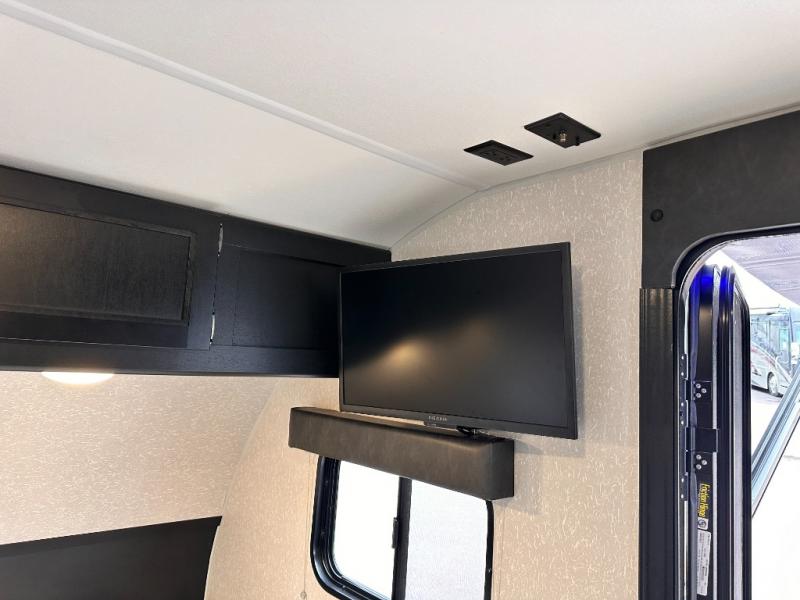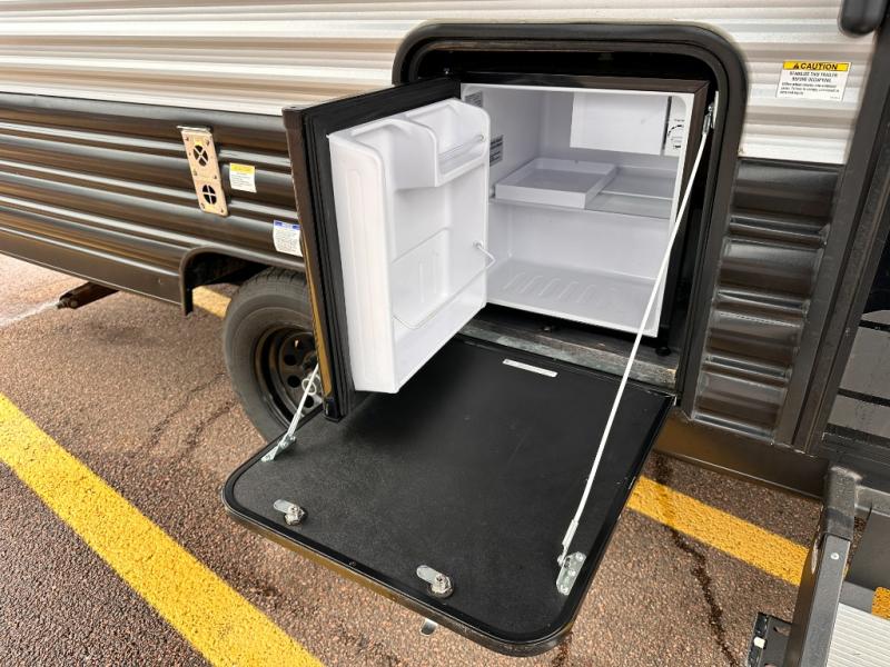 The whole family can sleep comfortably in this travel trailer! It has a set of bunk beds for the kids to sleep on with a TV mount location for extra entertainment, and you can sleep comfortably on the front queen bed with overhead cabinets and a shelf. There is even an exterior pack and play door that accesses the storage space under the bottom bunk. The chef will enjoy preparing their best home cooked meals either indoors with the high output cooktop or at the outside mini kitchen while staying protected by the 12' power awning, plus you have an outside TV mount location for added entertainment while you cook!