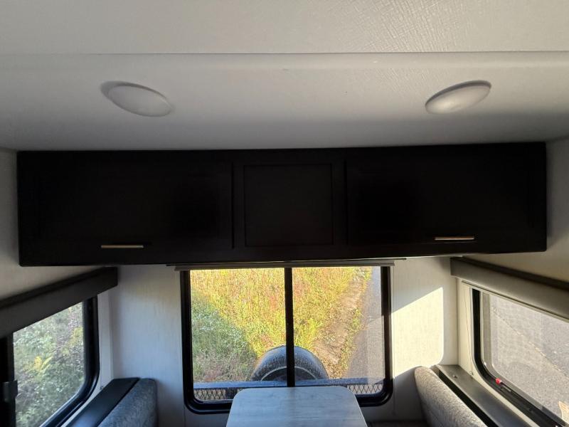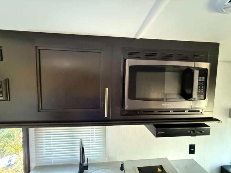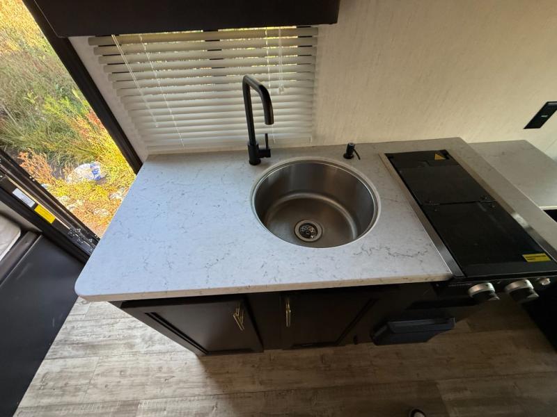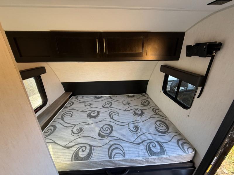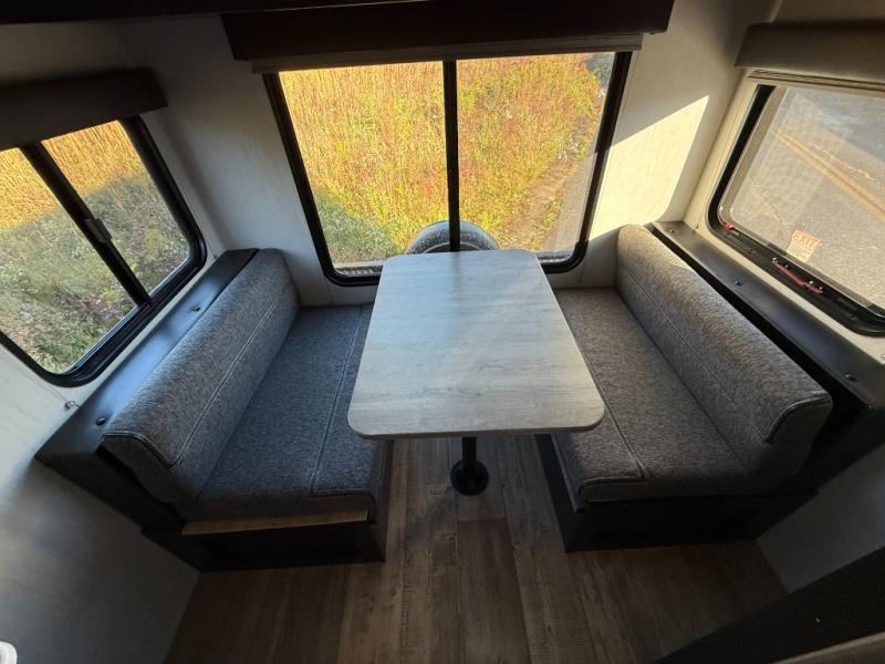 Enjoy a panoramic view of your surroundings while eating a meal at the rear dinette in this travel trailer! If you need an extra sleeping space in addition to the front queen bed then you can transform the dinette into one. Everyone can stay squeaky clean in the full bathroom with the radius shower. The fully equipped kitchen has everything you need to prepare your home cooked meals, but you could breathe in some fresh air instead while you cook at the outside mini kitchen and stay protected by the 10' power awning. There is a TV mount location at the foot of the front queen bed and also an exterior TV mount for added entertainment. You even have outside storage to keep all of your outdoor gear!