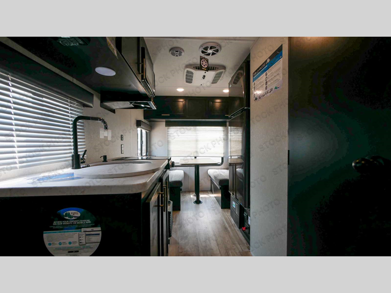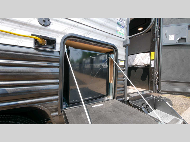 Enjoy a panoramic view of your surroundings while eating a meal at the rear dinette in this travel trailer! If you need an extra sleeping space in addition to the front queen bed then you can transform the dinette into one. Everyone can stay squeaky clean in the full bathroom with the radius shower. The fully equipped kitchen has everything you need to prepare your home cooked meals, but you could breathe in some fresh air instead while you cook at the outside mini kitchen and stay protected by the 10' power awning. There is a TV mount location at the foot of the front queen bed and also an exterior TV mount for added entertainment. You even have outside storage to keep all of your outdoor gear!