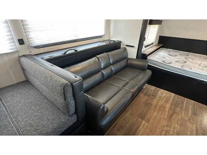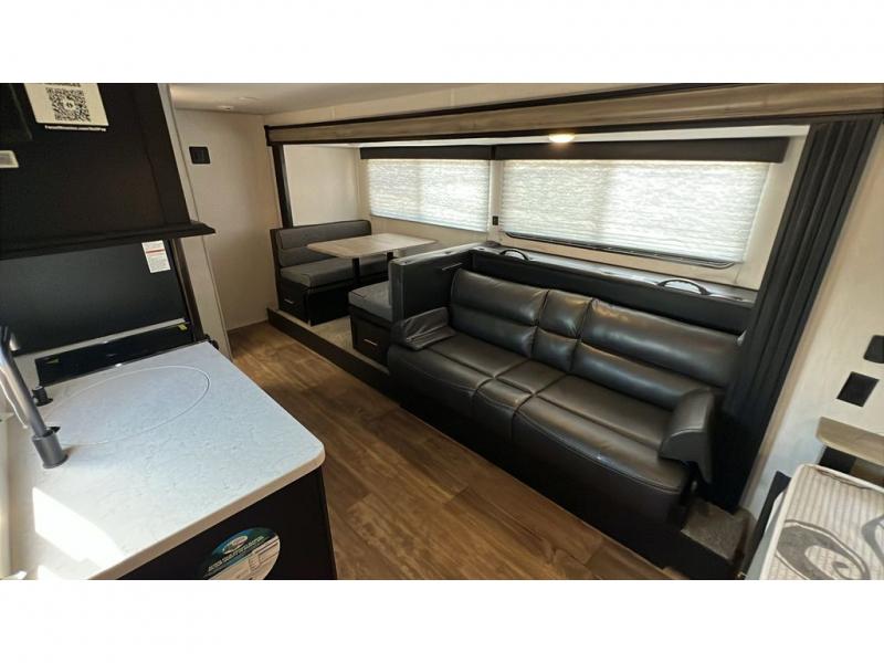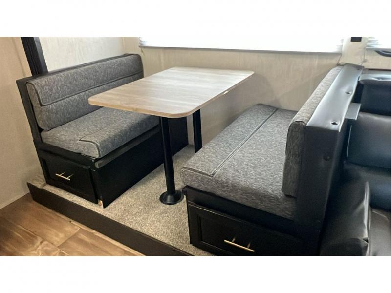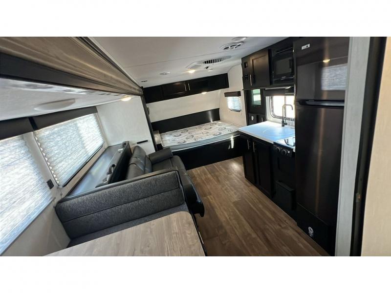 Enjoy plenty of walking around space in this travel trailer with the full slide! Inside the slide is a sofa with a hidden bunk above it and a booth dinette to play card games and enjoy delicious meals prepared with the high output cooktop and 11 cu. ft. Cannon high efficiency refrigerator. There is also an outside mini kitchen to cook your meals, outside storage to keep your camping chairs, and a 12' power awning to protect you while you cook and relax in the chair. For your entertainment needs, there is an outside TV mount and a TV mount location next to the rear corner bathroom which has a tub/shower to get squeaky clean each morning!
