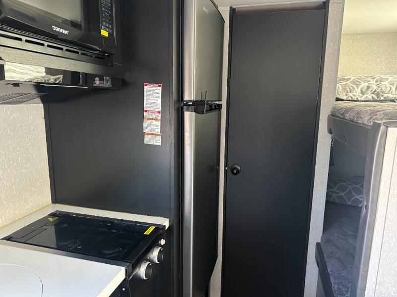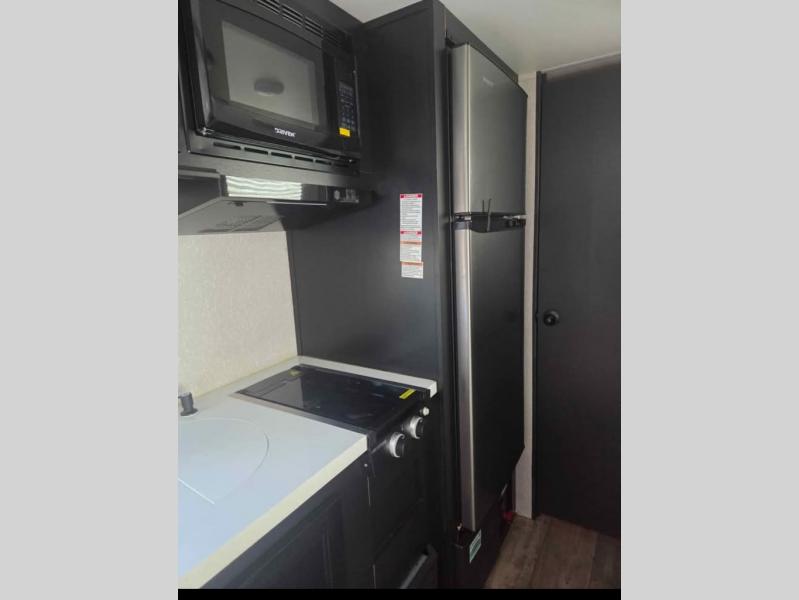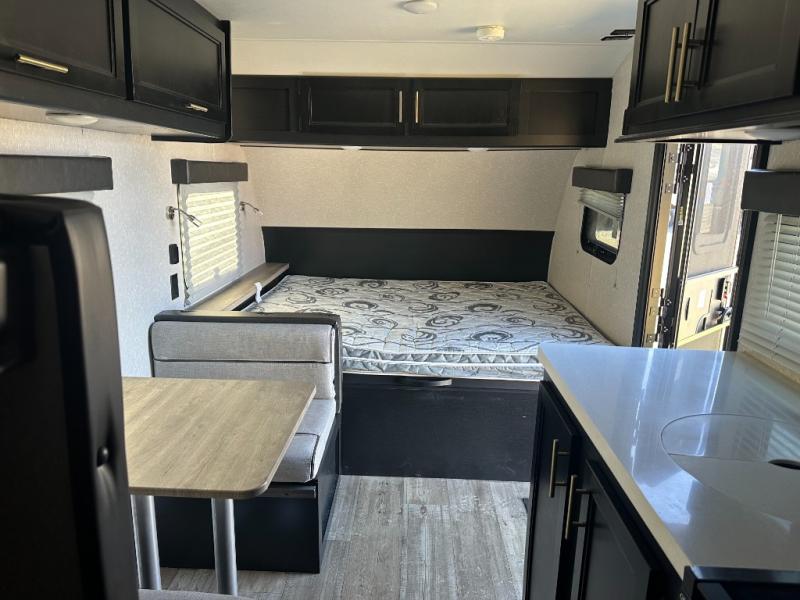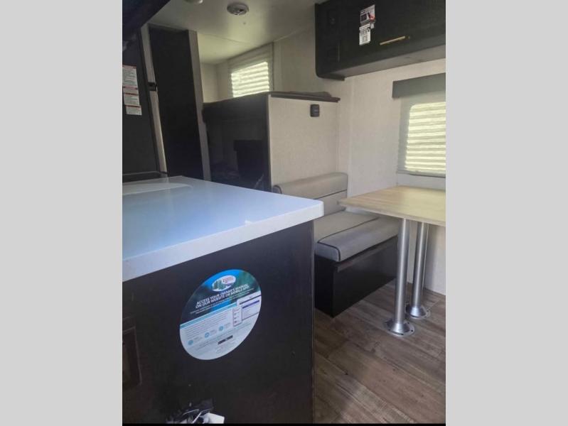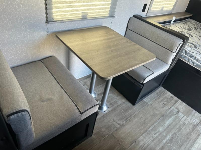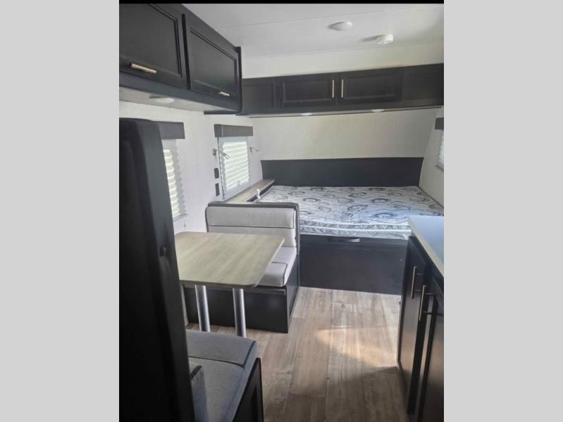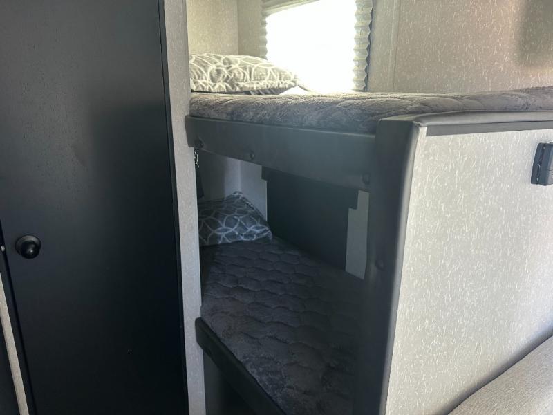 Enjoy a home away from home with this travel trailer! There is a front queen bed with a pillowtop mattress to lay your head on at night and the kiddos can sleep on the set of bunk beds in the rear with a TV mount location for extra entertainment on those rainy days. They will also appreciate having the rear corner bathroom so close to them at night. The chef can either prepare their meals indoors with the high output cooktop or at the outside mini kitchen, and the large stainless steel kitchen sink inside will make cleaning up easier. You can enjoy your meals at the booth dinette, play games, and even transform it into an extra sleeping space!