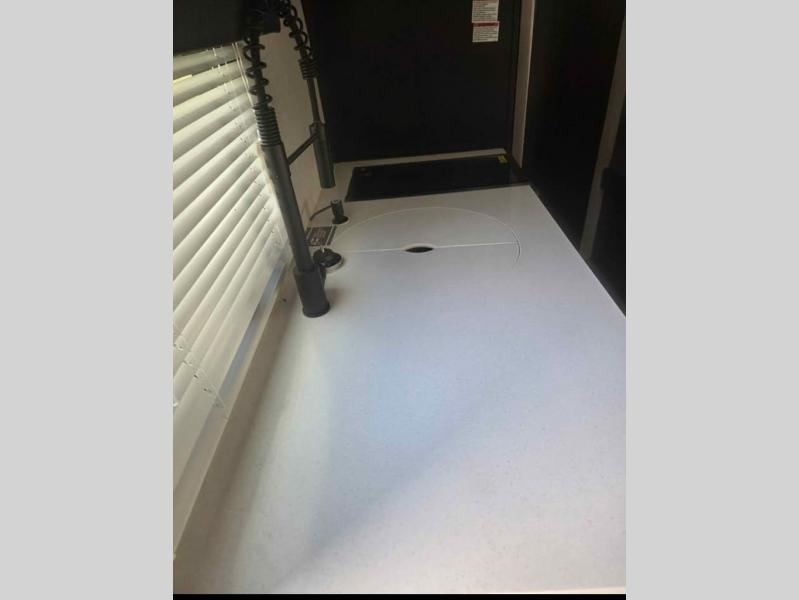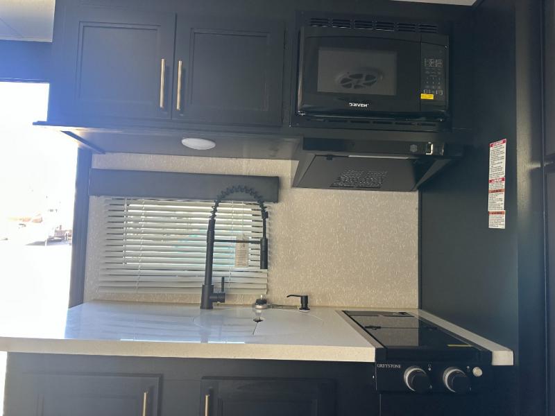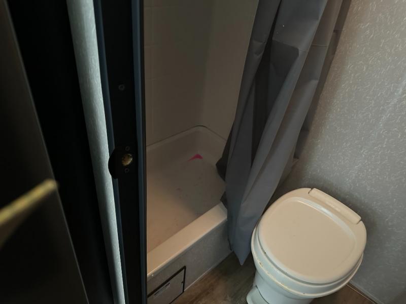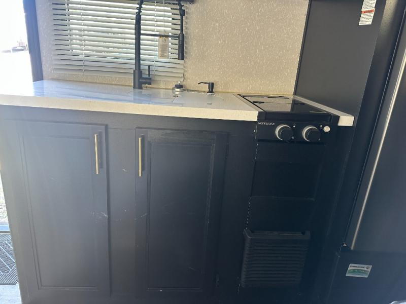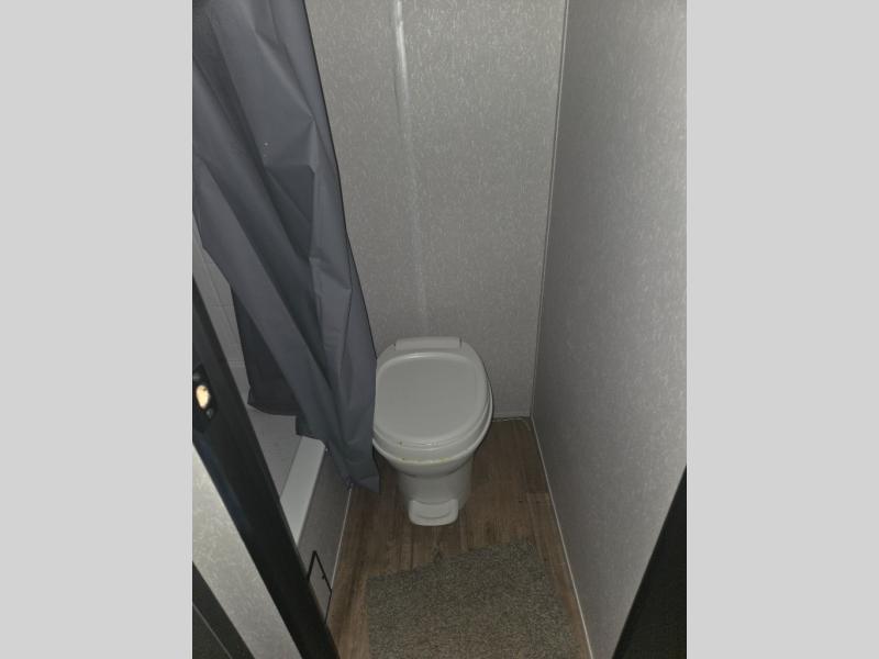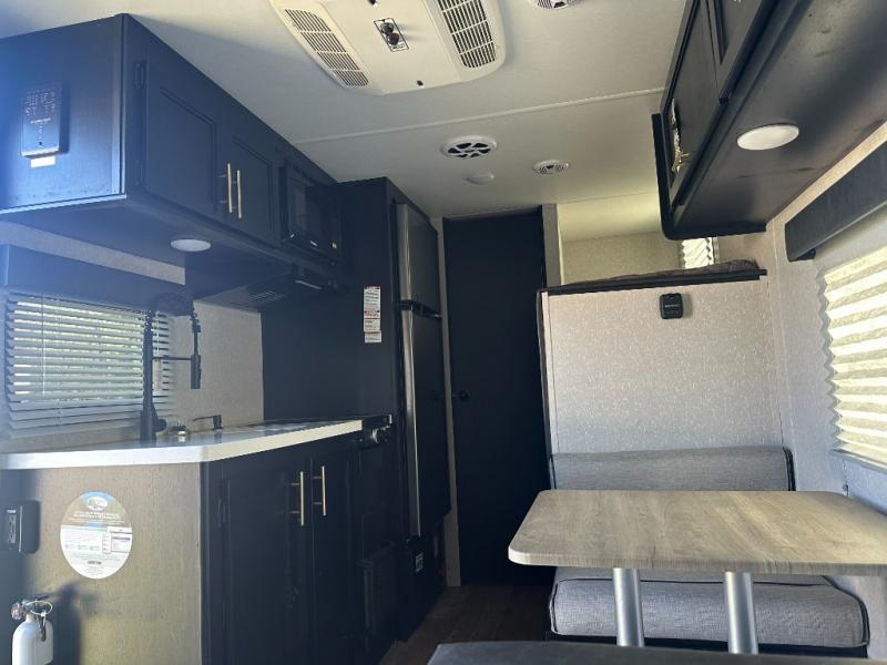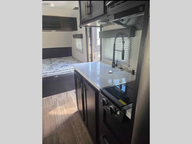Enjoy a home away from home with this travel trailer! There is a front queen bed with a pillowtop mattress to lay your head on at night and the kiddos can sleep on the set of bunk beds in the rear with a TV mount location for extra entertainment on those rainy days. They will also appreciate having the rear corner bathroom so close to them at night. The chef can either prepare their meals indoors with the high output cooktop or at the outside mini kitchen, and the large stainless steel kitchen sink inside will make cleaning up easier. You can enjoy your meals at the booth dinette, play games, and even transform it into an extra sleeping space!