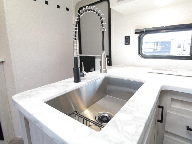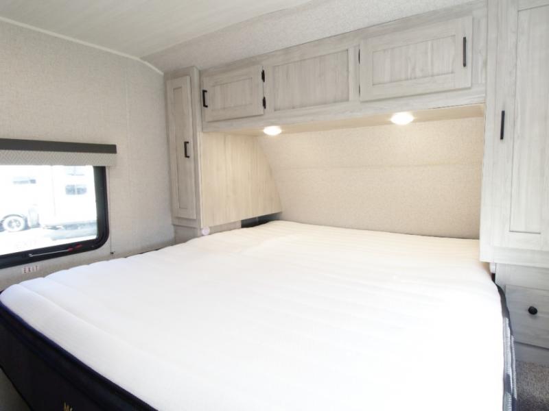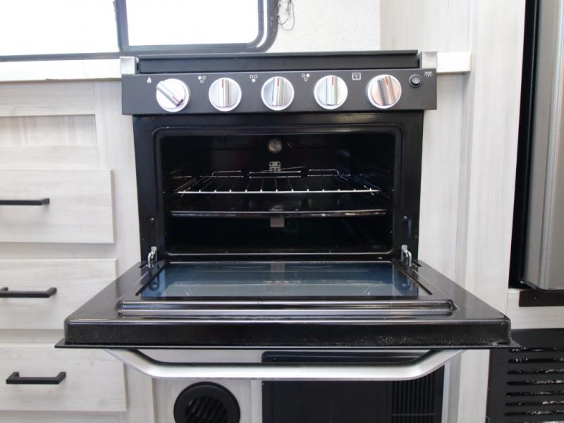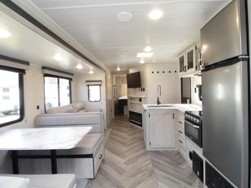 Inside, you’ll find 81" ceilings, seamless designer countertops, night shades, and an XL dinette picture window for scenic views. Entertainment is easy with a Bluetooth sound system and HDMI connectivity, creating the perfect setup for both relaxation and family fun.