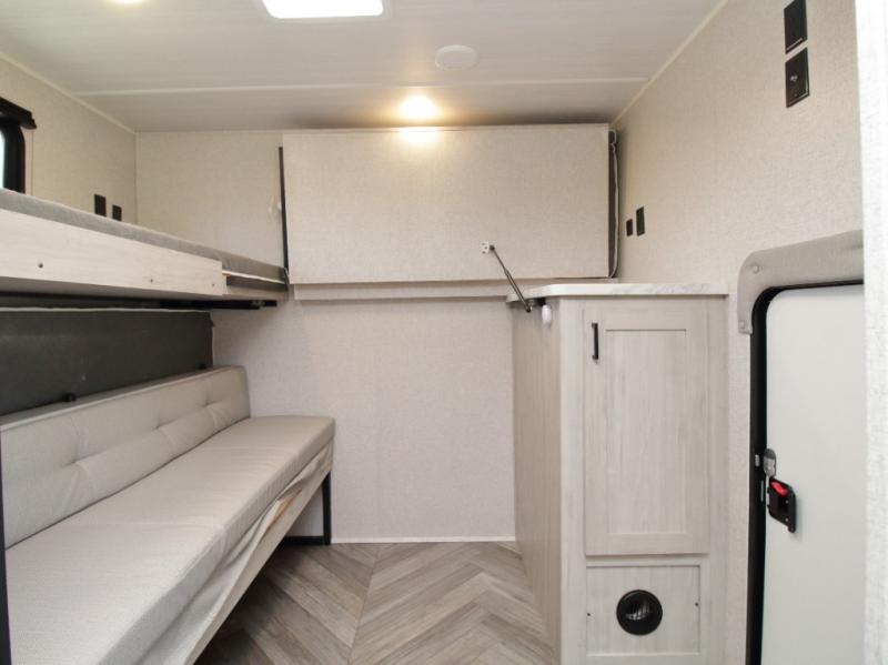 Private Bunkhouse with Queen Bed Below – Perfect for kids or guests, this flexible bunk area includes two upper bunks and a convertible lower queen bed that doubles as a sofa by day. A sliding door adds privacy, while the wardrobe provides ample storage space.