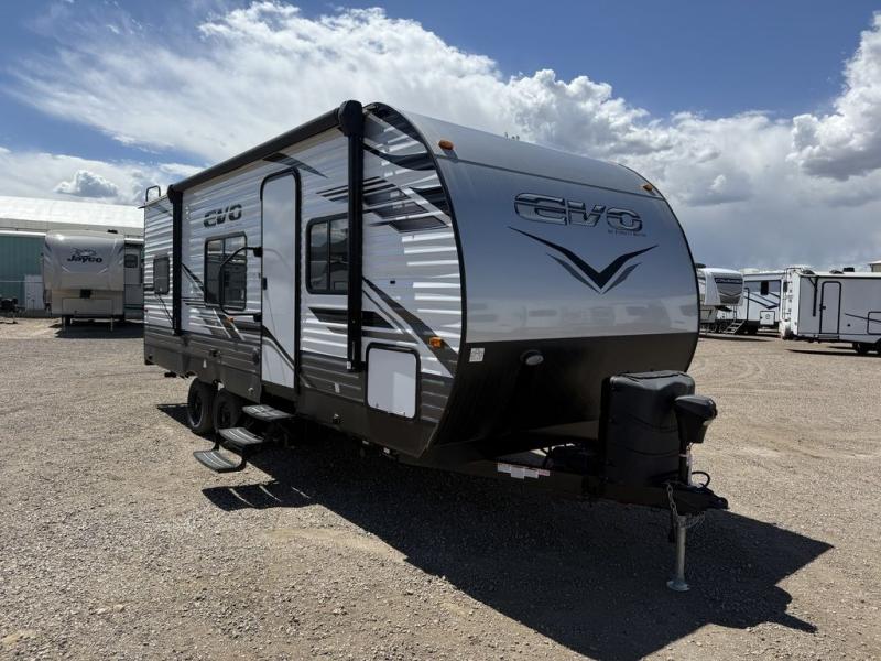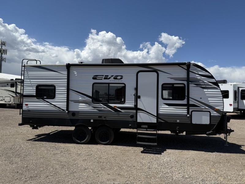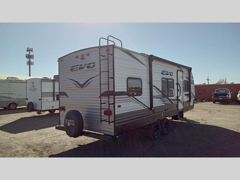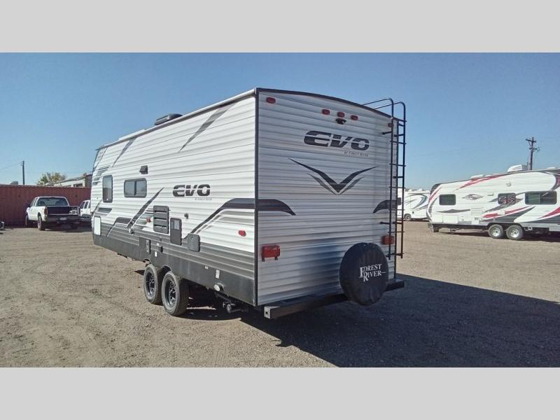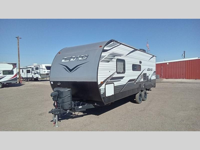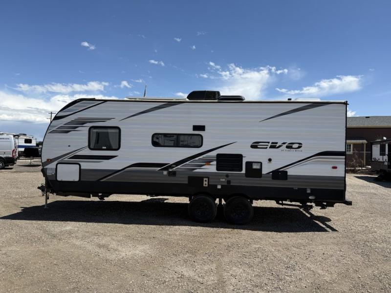 Enjoy the camping lifestyle in an EVO travel trailer by Forest River! These units are constructed with a rust resistant powder coated I-beam chassis, a front lower gravel guard, and a one-piece PVC roofing material that will allow you to make memories for years. EZ lube axles will make towing easier than ever, along with 4-wheel electric self-adjusting brakes and an aerodynamic aluminum front cap. There are stylish solid surface countertops in the kitchen, night shades in the living area, plus stained wood cabinet doors and deluxe ball bearing drawer guides for a more residential feel. Outside, you'll find exterior speakers, a Dometic awing with retractor assist springs, power stabilizer jacks for hassle-free set up, plus many more convenient features. There are a variety of floorplans to choose from, whether you're needing a couple's unit or a bunkhouse model, there's an EVO travel trailer for you!