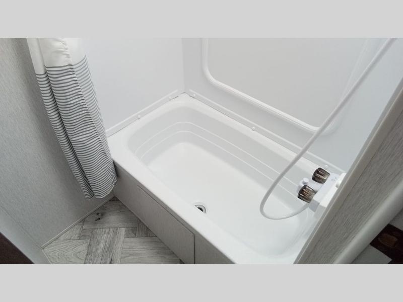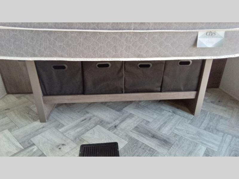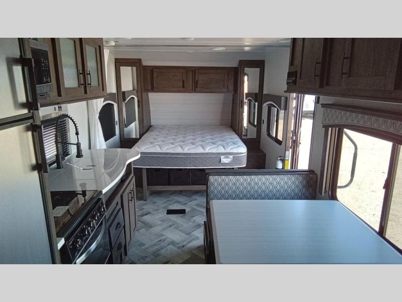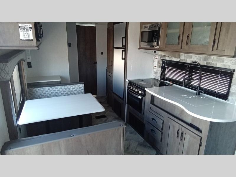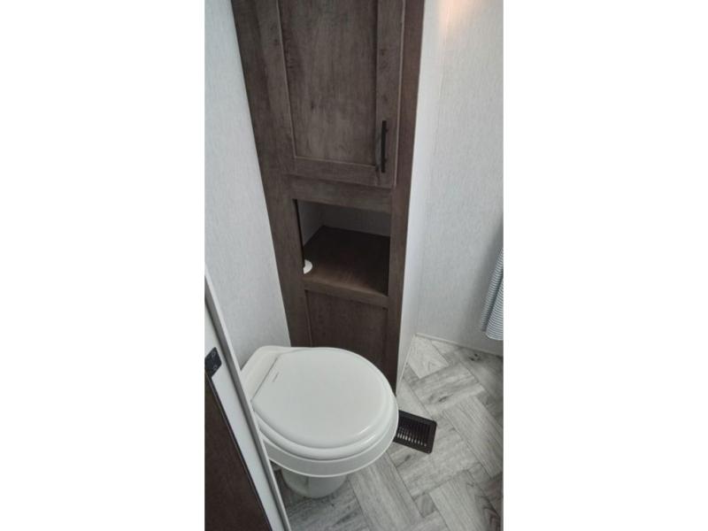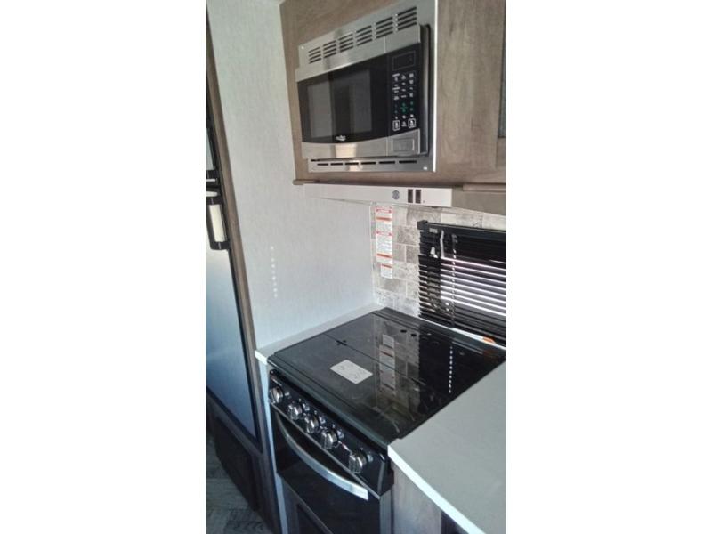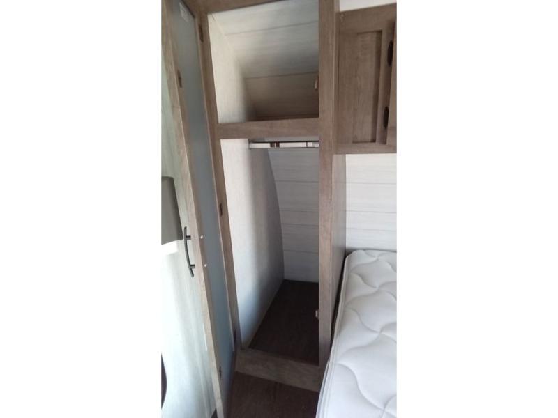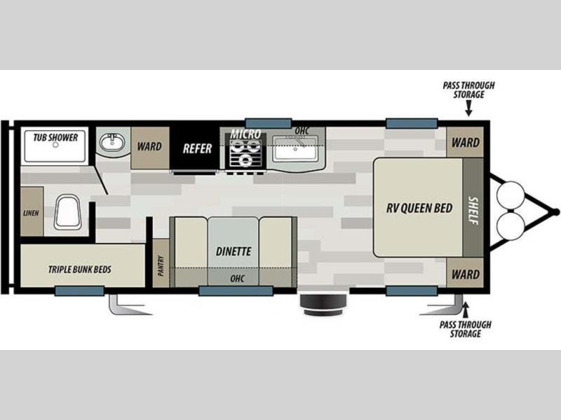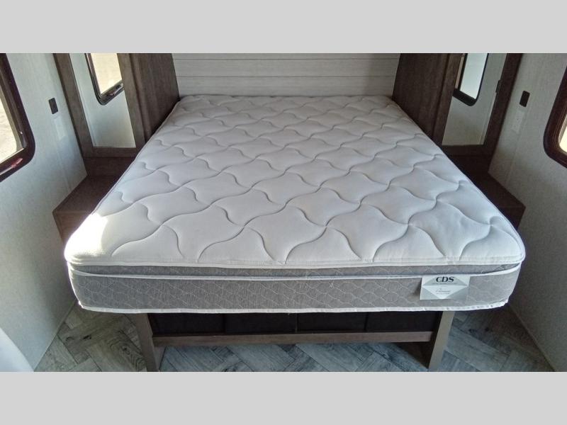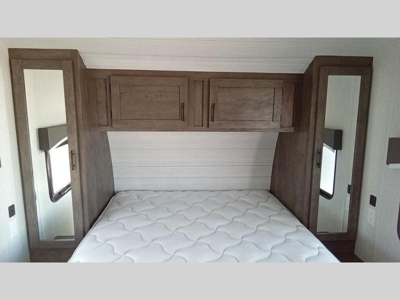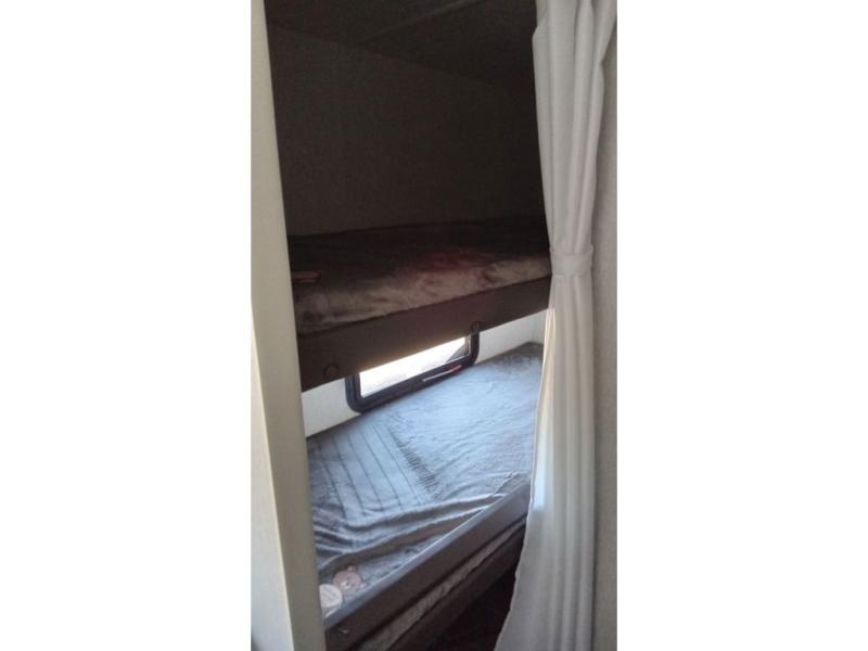 You can comfortably sleep six happy campers in this travel trailer thanks to the added triple bunk beds in the back. The private toilet and tub/shower is close by for nighttime use, and the sink is just outside this door so two people can freshen up at once. Meals can be cooked on the three burner range or in the 17" oven, plus there is a microwave oven and an extra large country sink with recessed covers for more counter space. Up front you'll find the walk-around RV queen bed with a Denver pillow top memory foam mattress, plus dual wardrobes for your clothes!