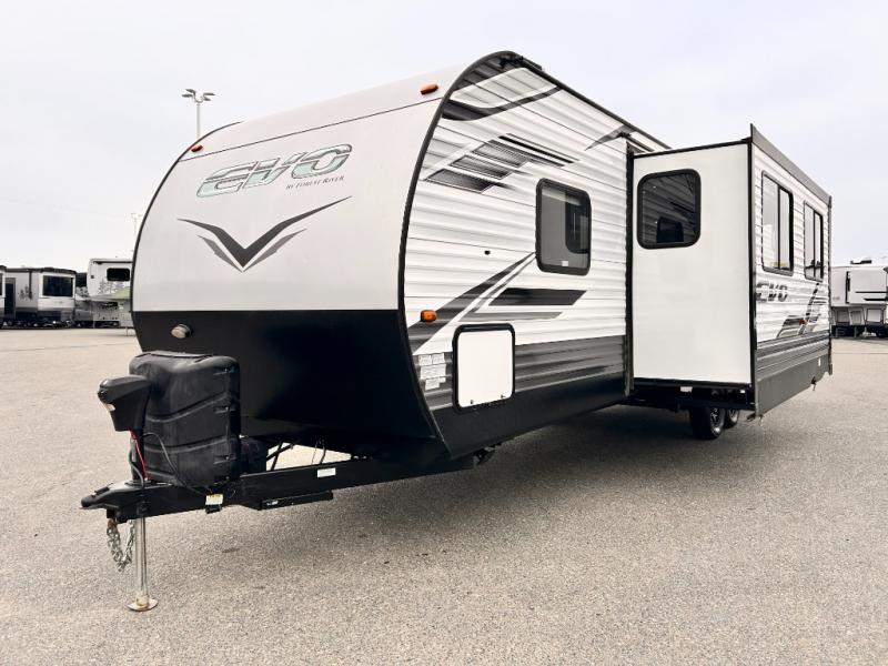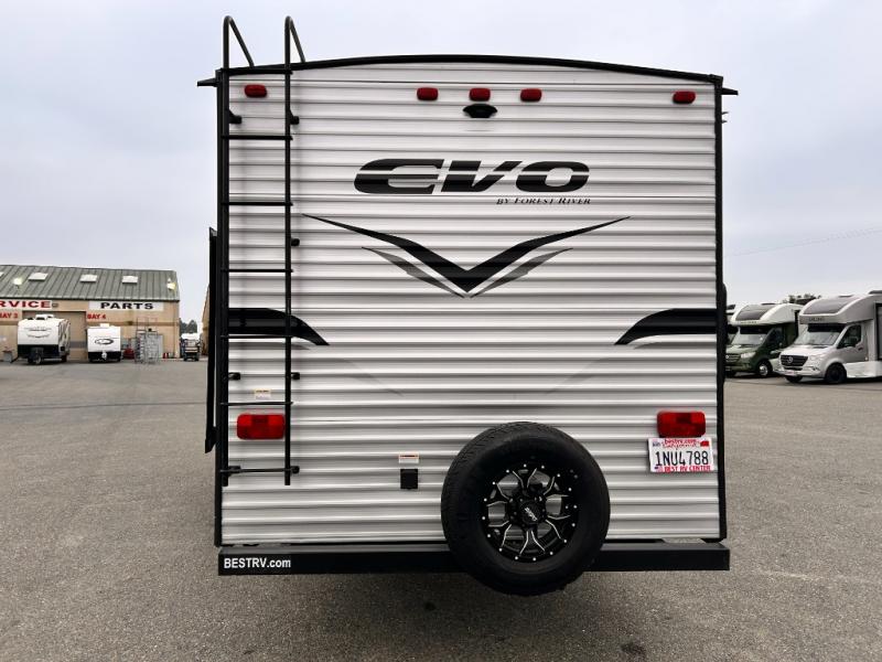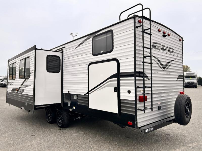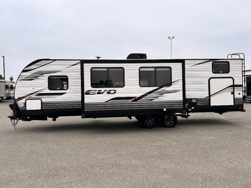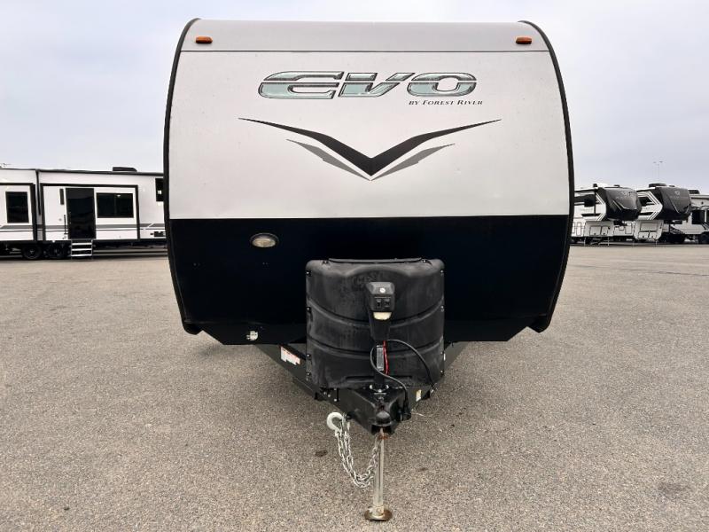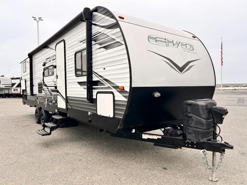 Enjoy the camping lifestyle in an EVO travel trailer by Forest River! These units are constructed with a rust resistant powder coated I-beam chassis, a front lower gravel guard, and a one-piece PVC roofing material that will allow you to make memories for years. EZ lube axles will make towing easier than ever, along with 4-wheel electric self-adjusting brakes and an aerodynamic aluminum front cap. There are stylish solid surface countertops in the kitchen, night shades in the living area, plus stained wood cabinet doors and deluxe ball bearing drawer guides for a more residential feel. Outside, you'll find exterior speakers, a Dometic awing with retractor assist springs, power stabilizer jacks for hassle-free set up, plus many more convenient features. There are a variety of floorplans to choose from, whether you're needing a couple's unit or a bunkhouse model, there's an EVO travel trailer for you!