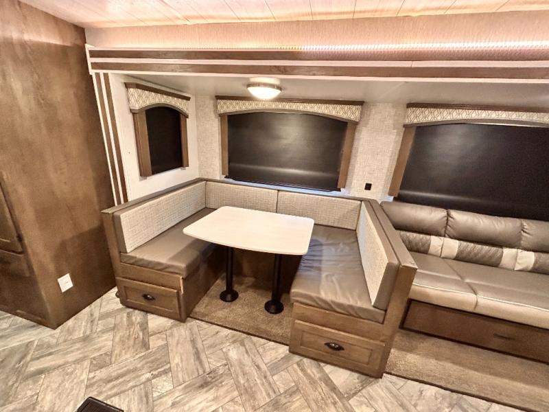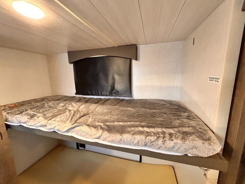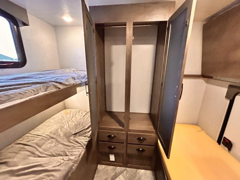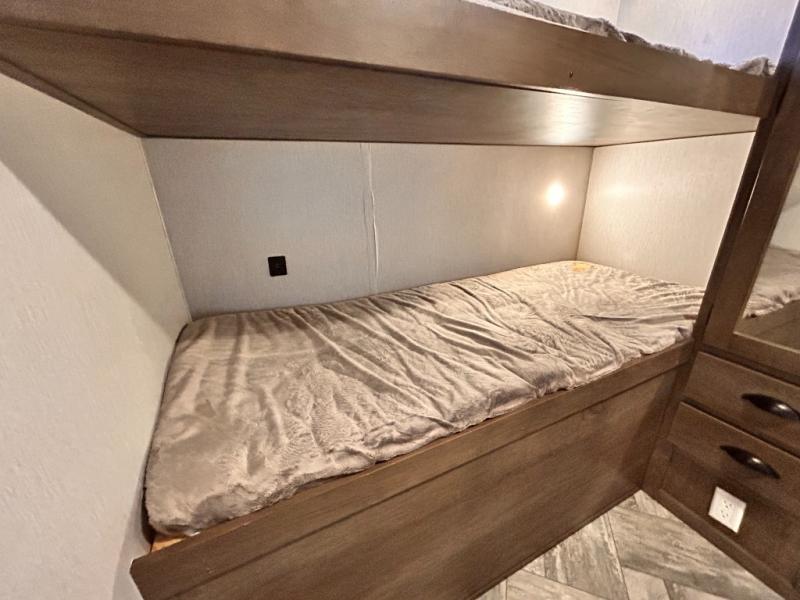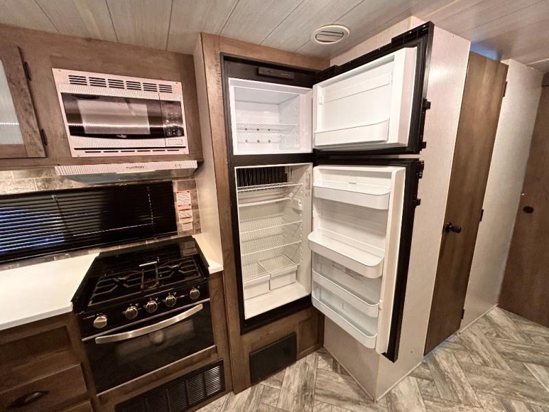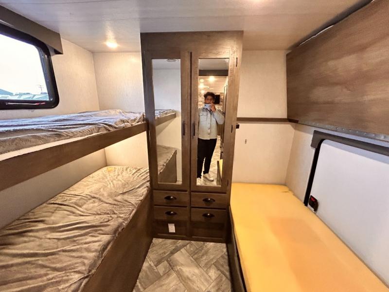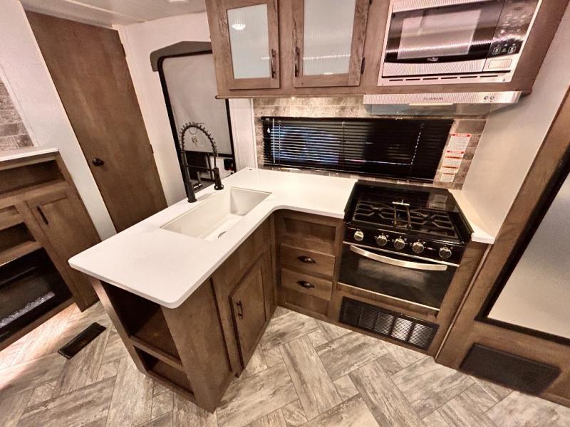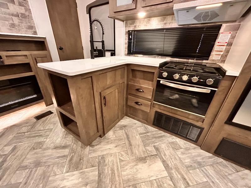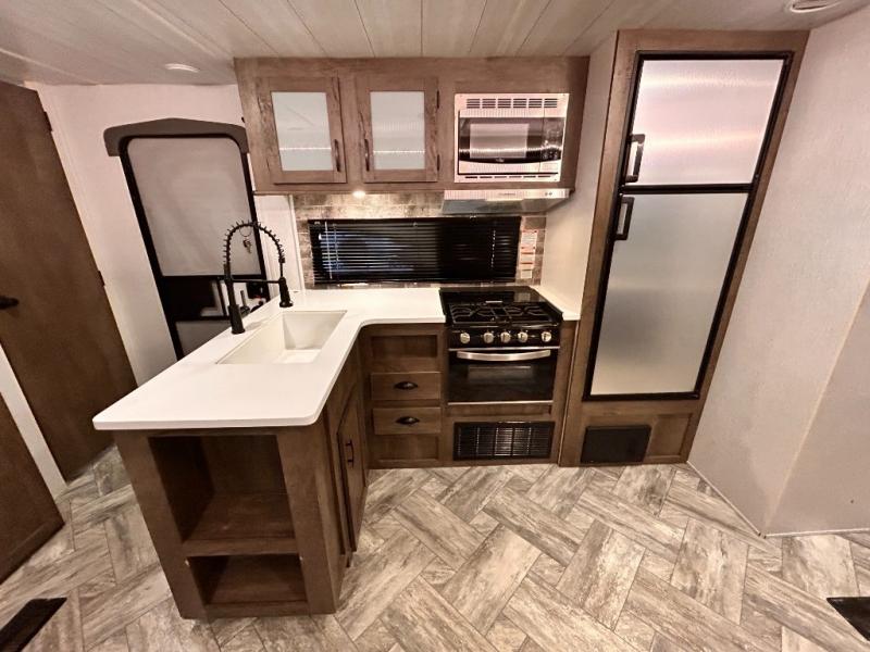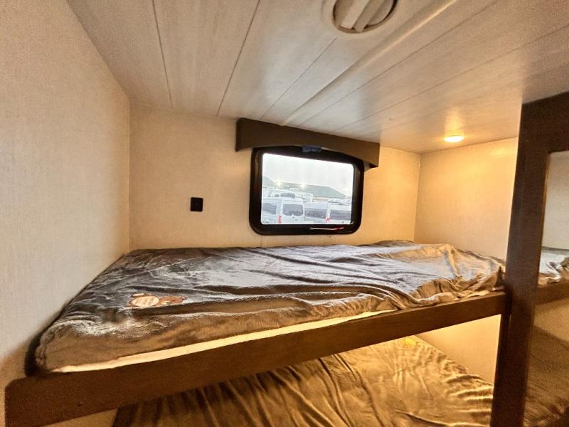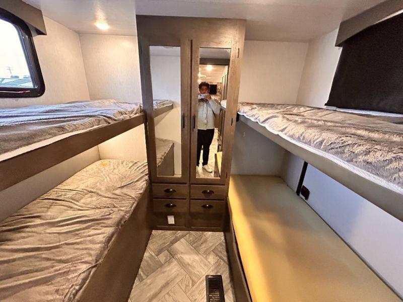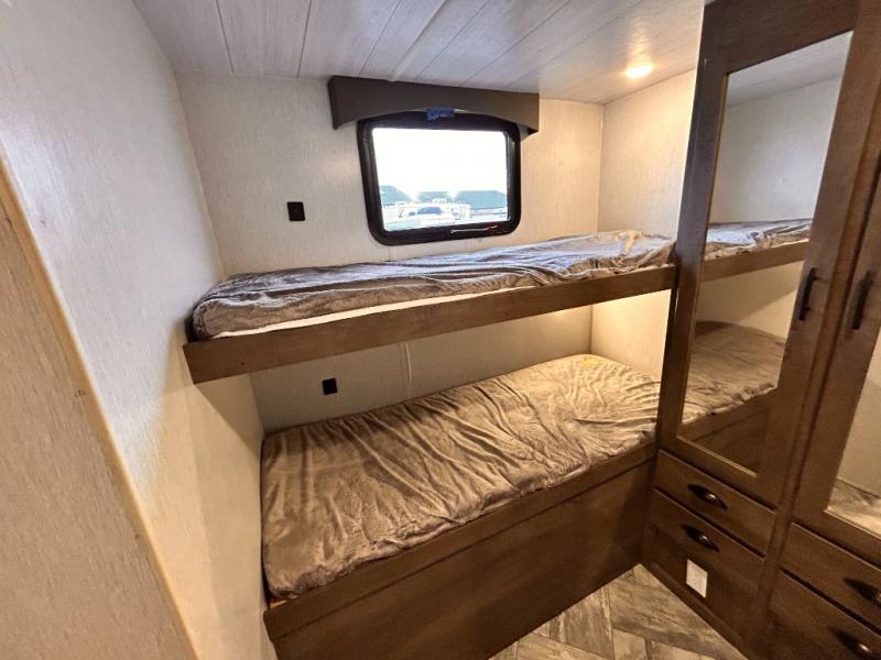 If you've been looking for a travel trailer that will fit your whole crew, your search is over! This model can sleep ten each night thanks to the two sets of bunks in the bunkhouse, the RV queen bed in the bedroom, plus the furniture within the large slide out. The chef of your group can cook indoors on the three burner range with a 17" oven, or they can choose the optional outside kitchen that will be perfect for fish frying!