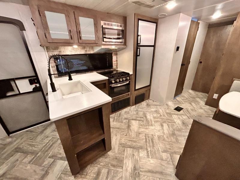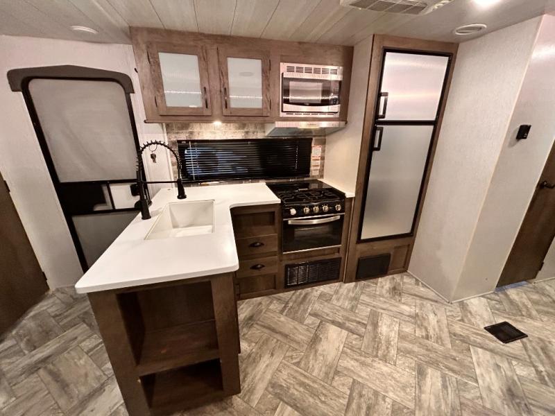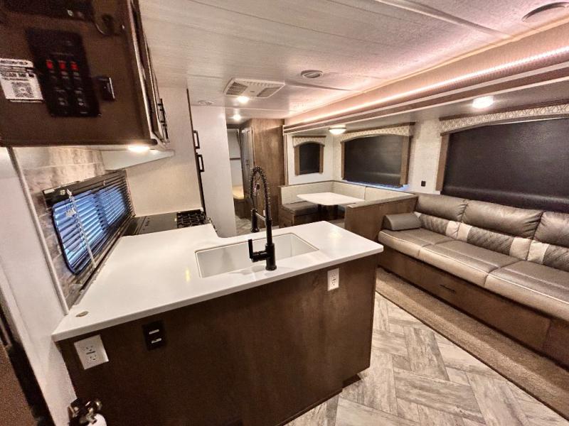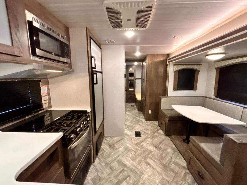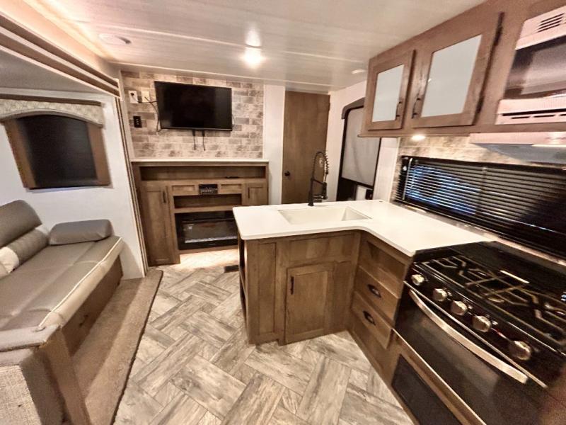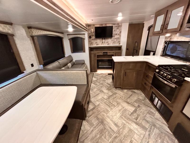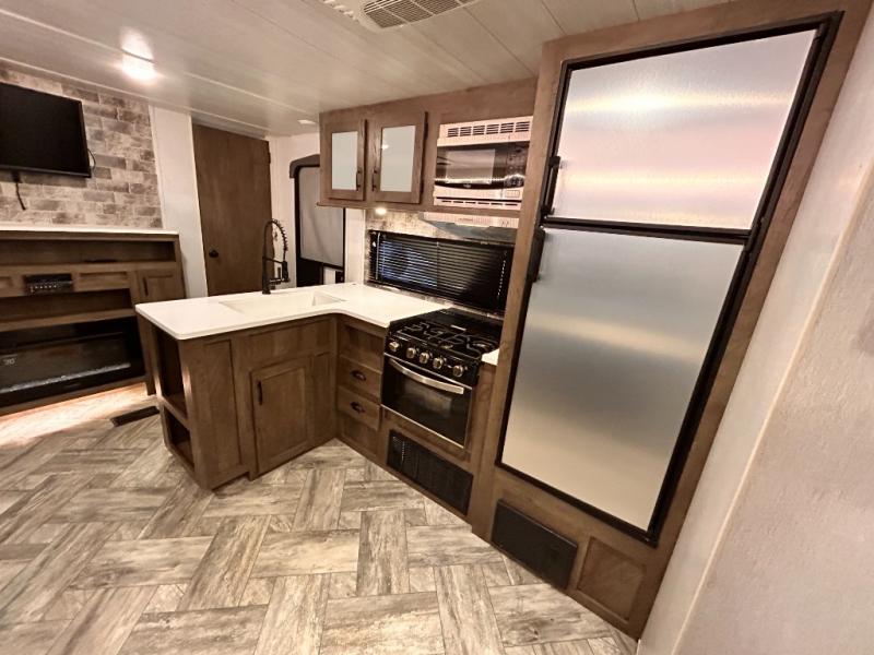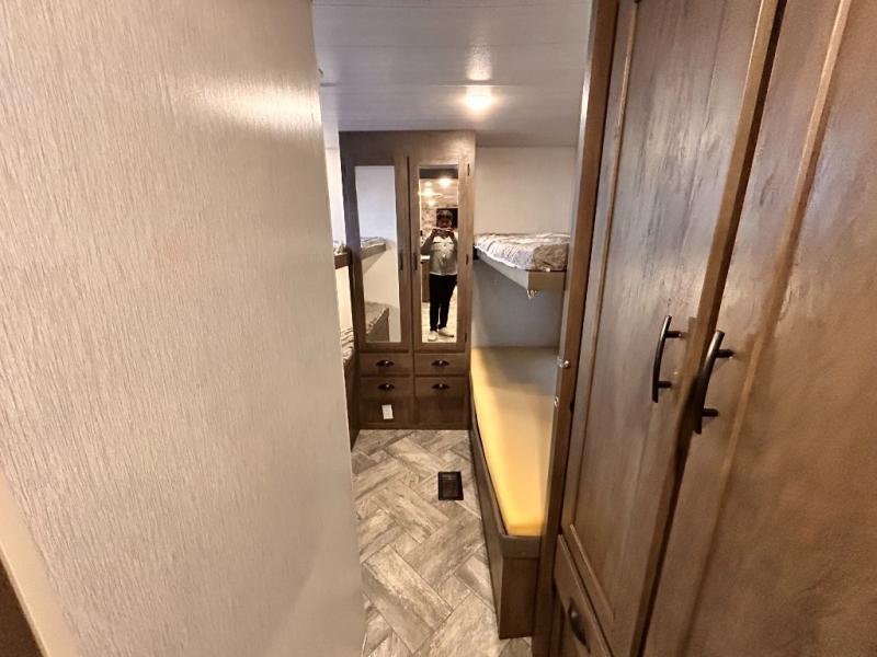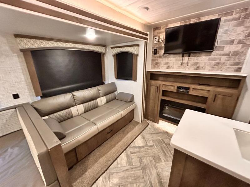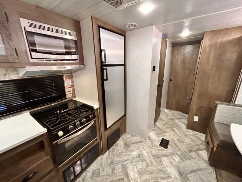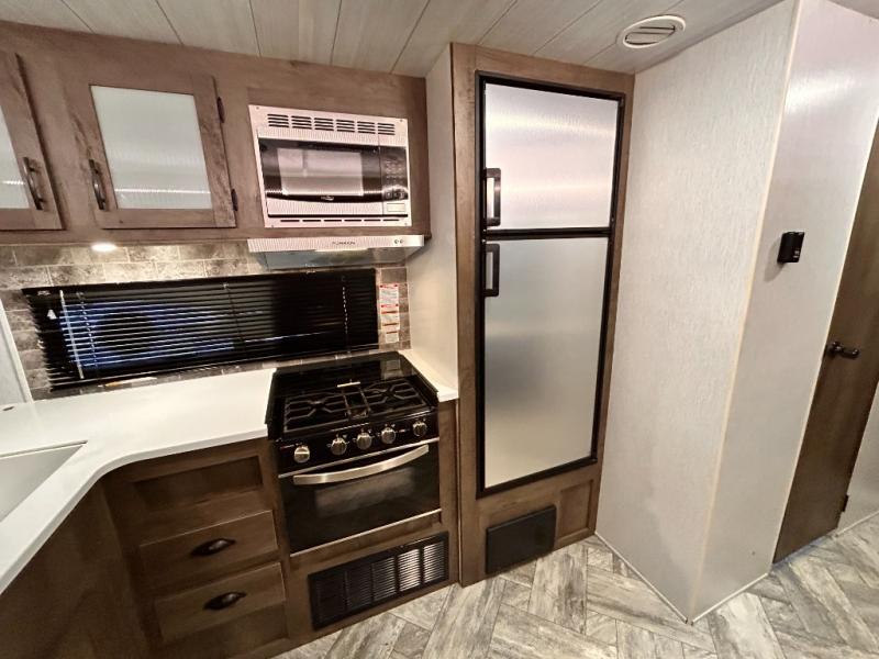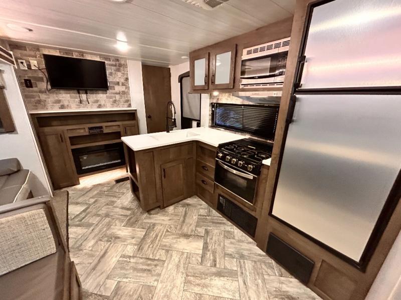 If you've been looking for a travel trailer that will fit your whole crew, your search is over! This model can sleep ten each night thanks to the two sets of bunks in the bunkhouse, the RV queen bed in the bedroom, plus the furniture within the large slide out. The chef of your group can cook indoors on the three burner range with a 17" oven, or they can choose the optional outside kitchen that will be perfect for fish frying!