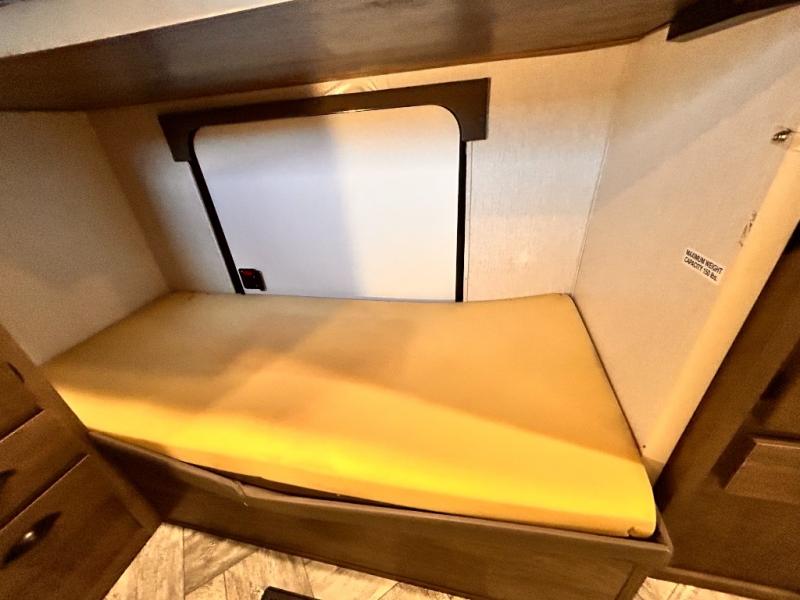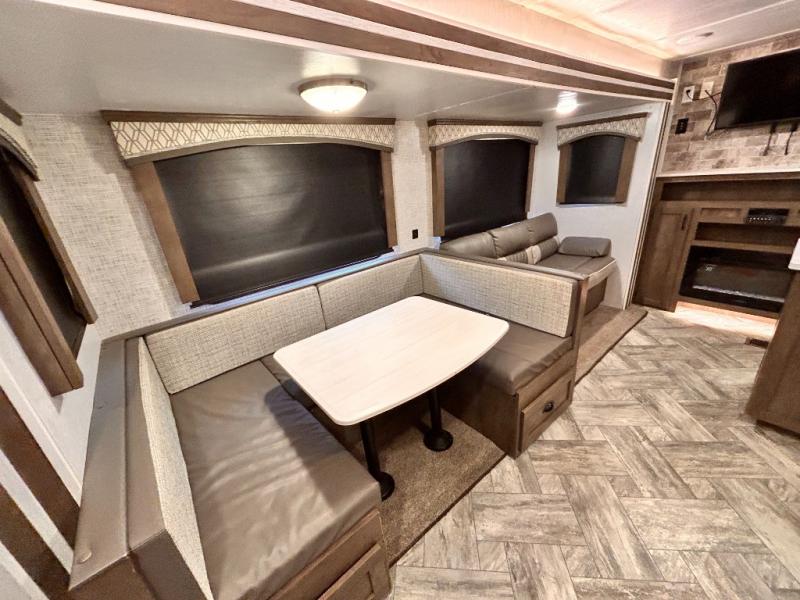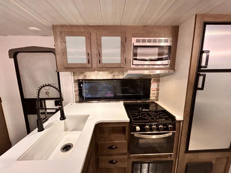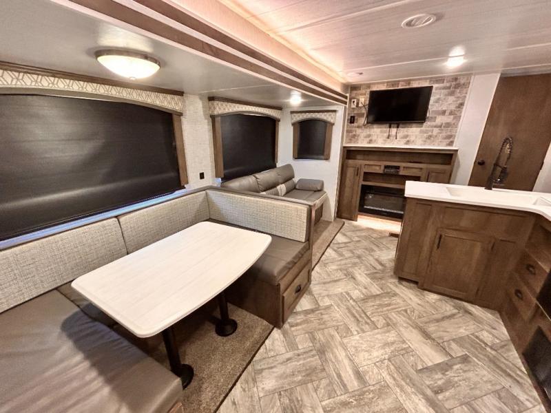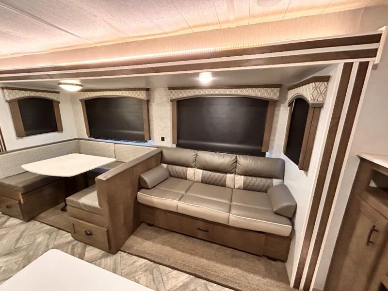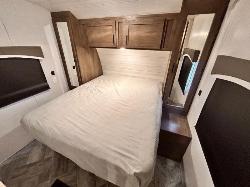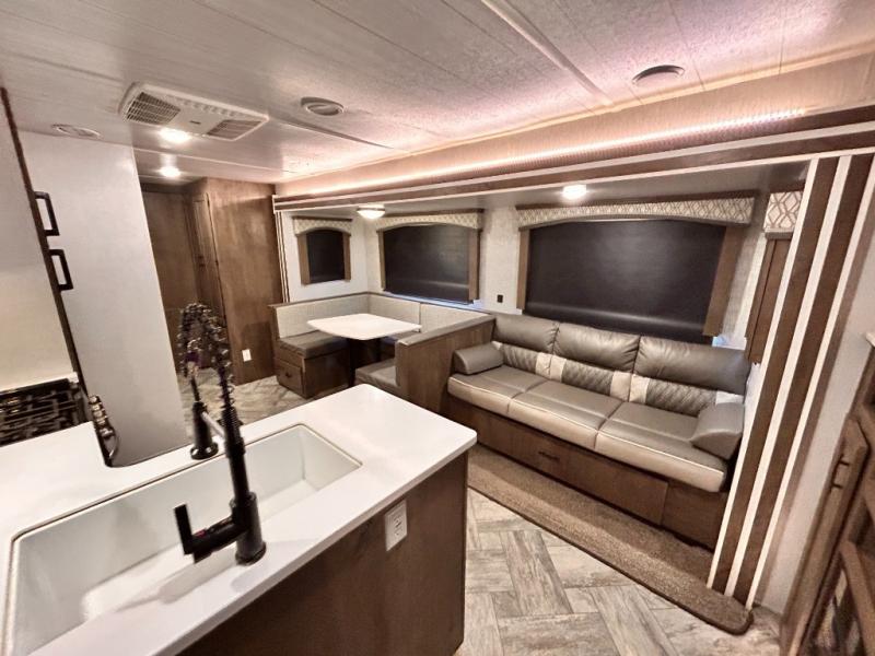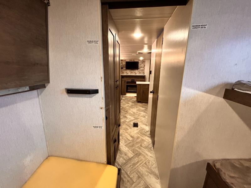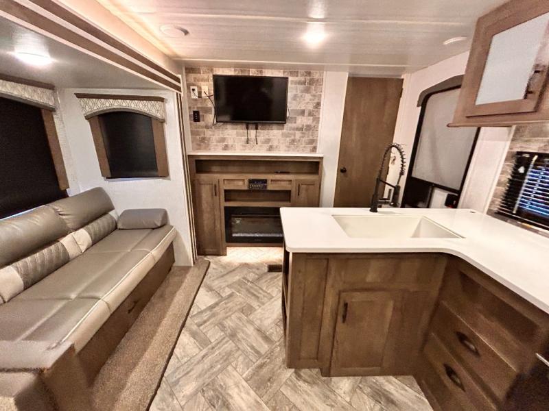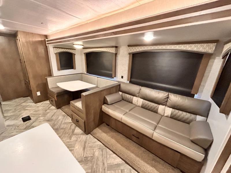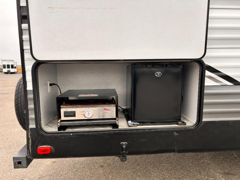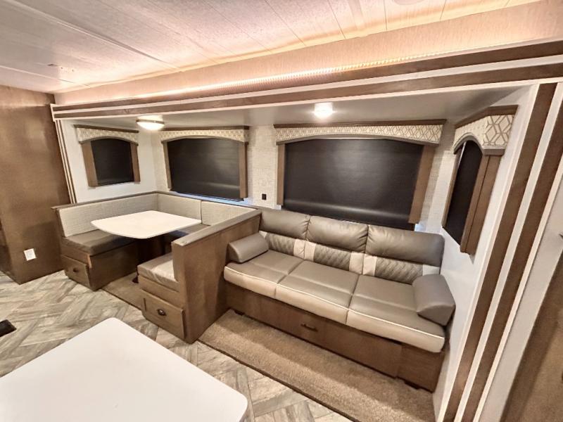 If you've been looking for a travel trailer that will fit your whole crew, your search is over! This model can sleep ten each night thanks to the two sets of bunks in the bunkhouse, the RV queen bed in the bedroom, plus the furniture within the large slide out. The chef of your group can cook indoors on the three burner range with a 17" oven, or they can choose the optional outside kitchen that will be perfect for fish frying!
