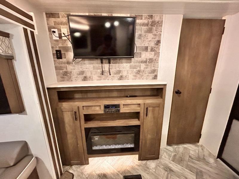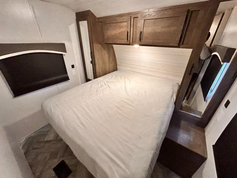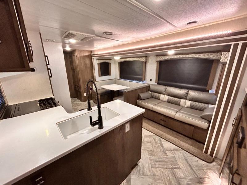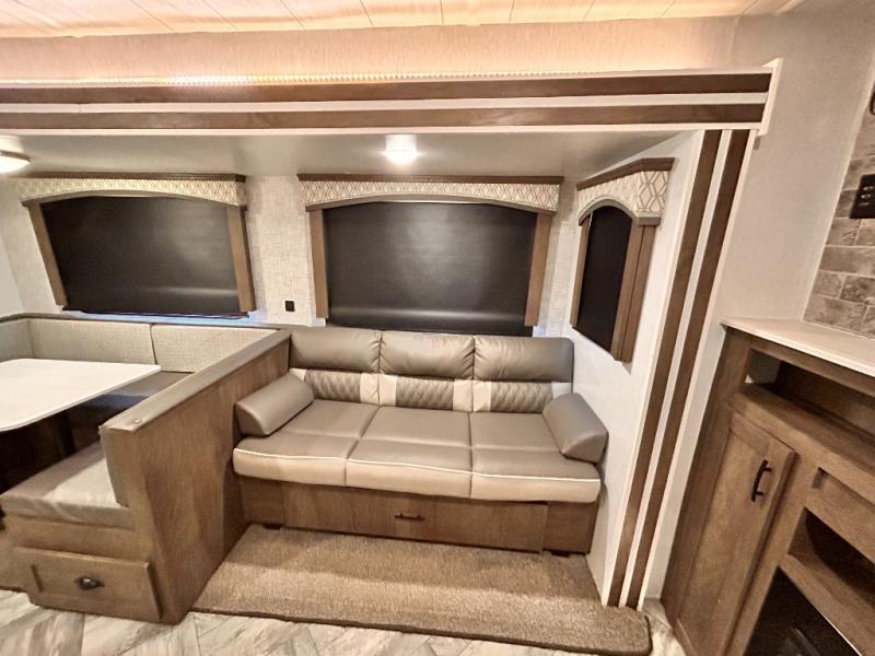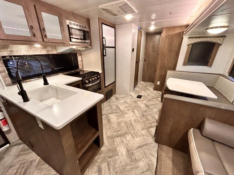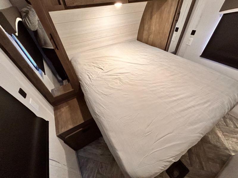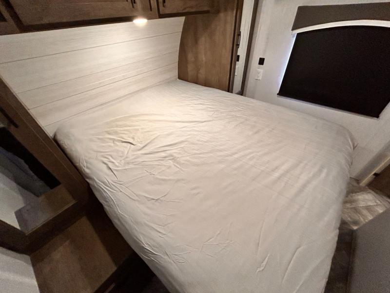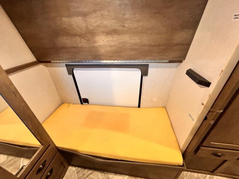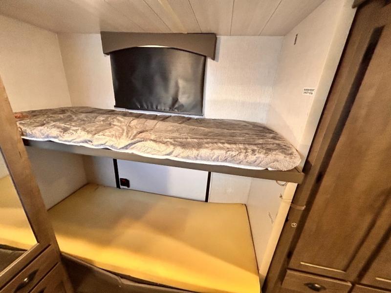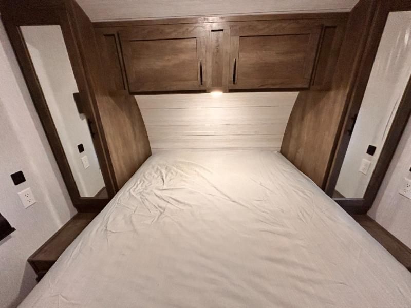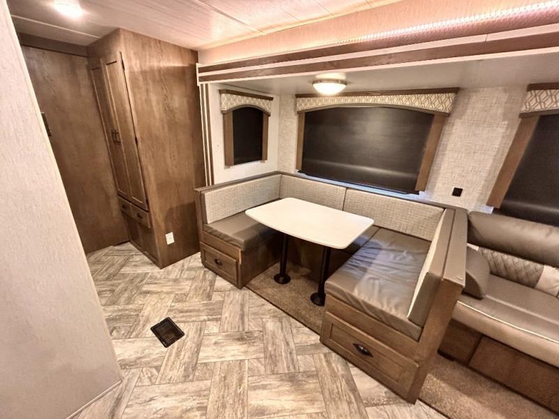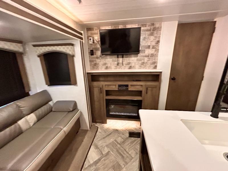 If you've been looking for a travel trailer that will fit your whole crew, your search is over! This model can sleep ten each night thanks to the two sets of bunks in the bunkhouse, the RV queen bed in the bedroom, plus the furniture within the large slide out. The chef of your group can cook indoors on the three burner range with a 17" oven, or they can choose the optional outside kitchen that will be perfect for fish frying!