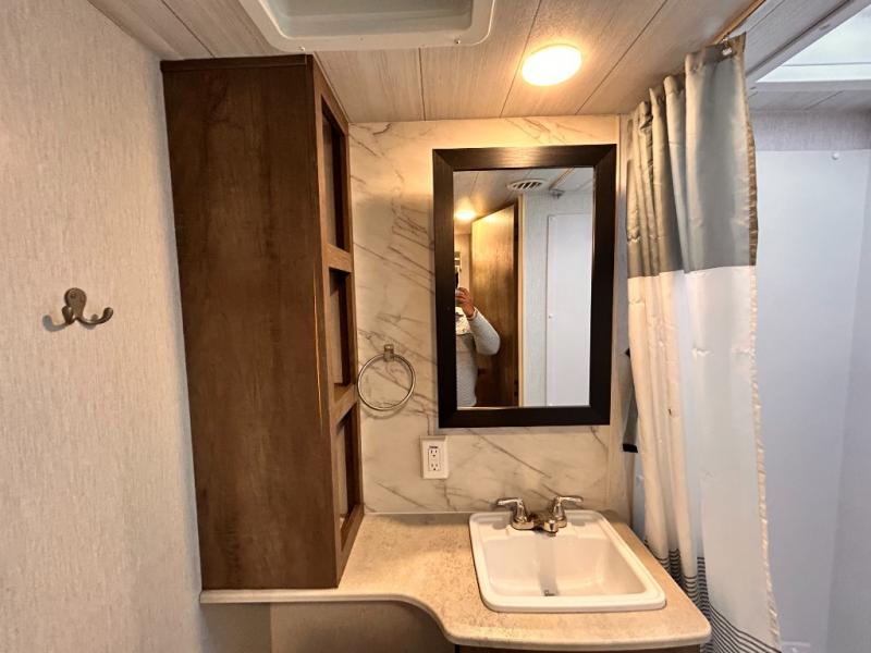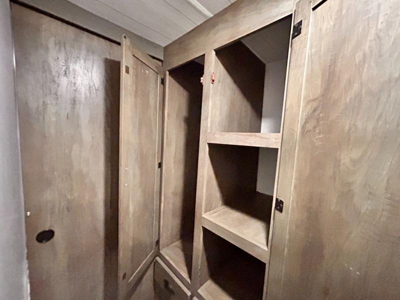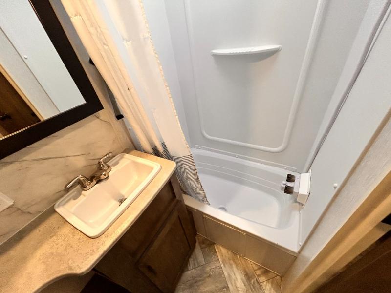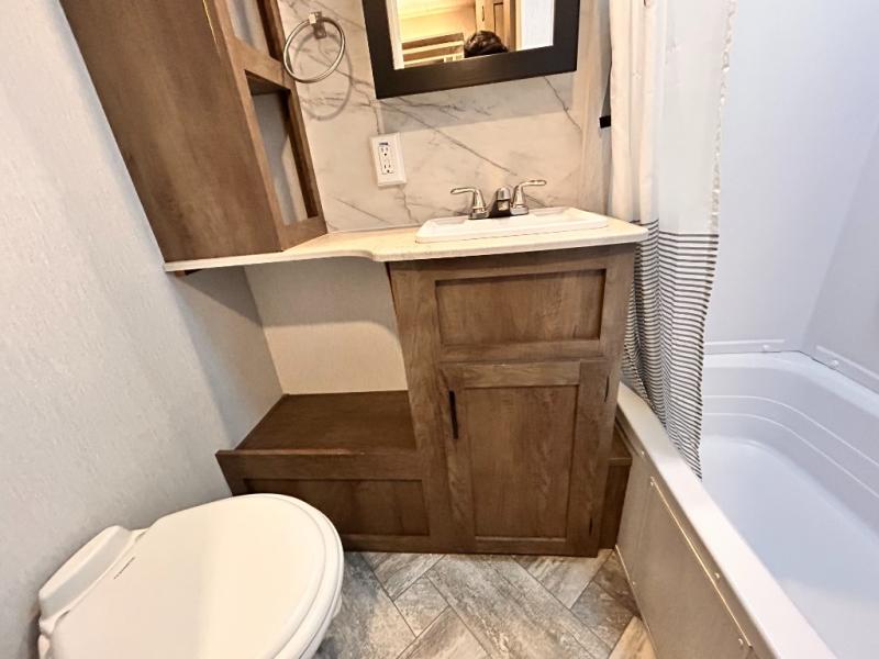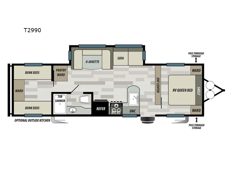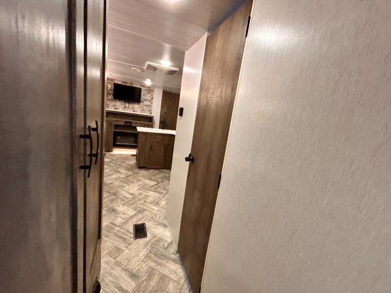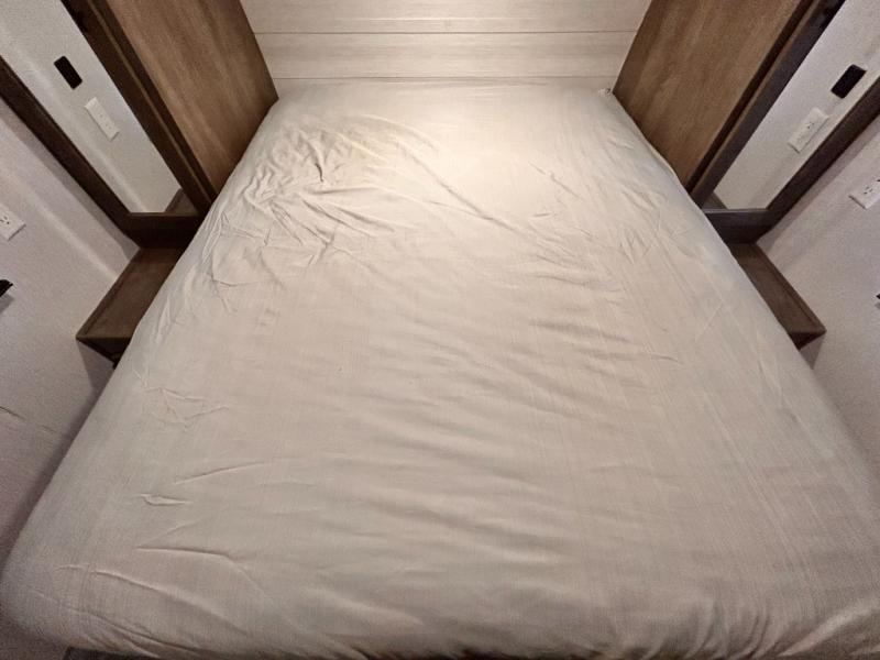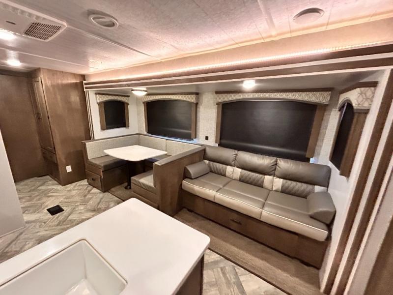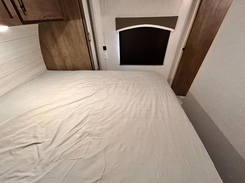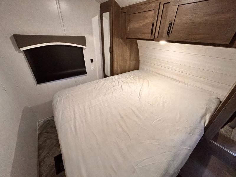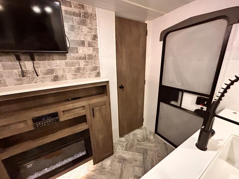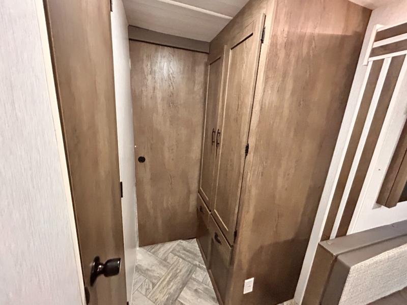 If you've been looking for a travel trailer that will fit your whole crew, your search is over! This model can sleep ten each night thanks to the two sets of bunks in the bunkhouse, the RV queen bed in the bedroom, plus the furniture within the large slide out. The chef of your group can cook indoors on the three burner range with a 17" oven, or they can choose the optional outside kitchen that will be perfect for fish frying!