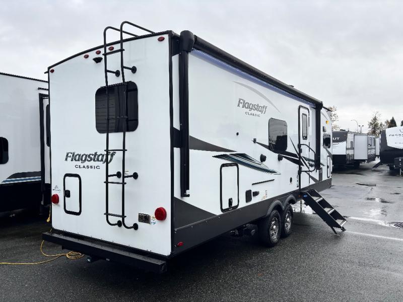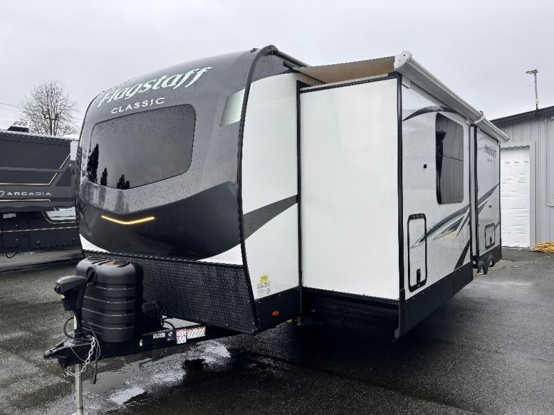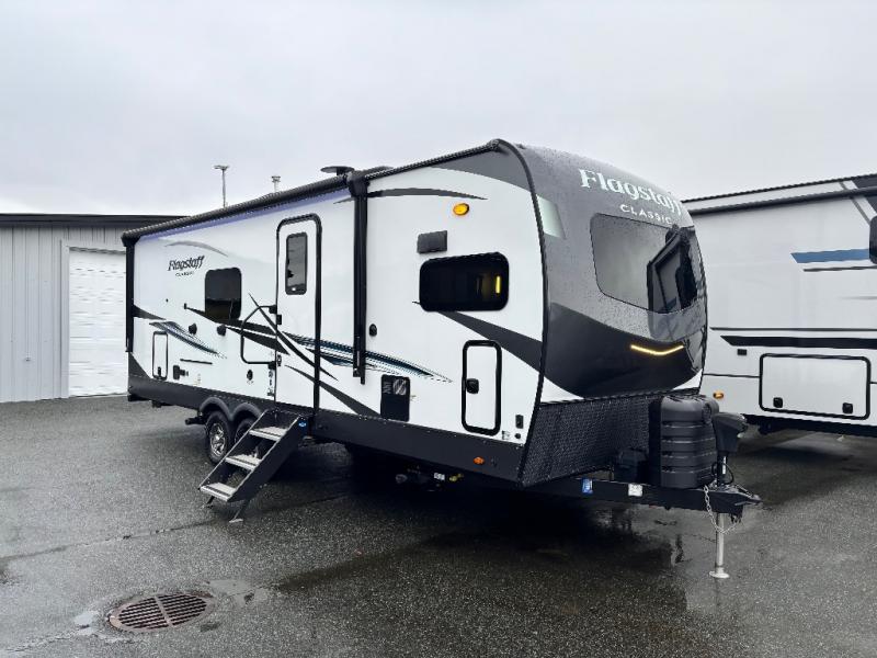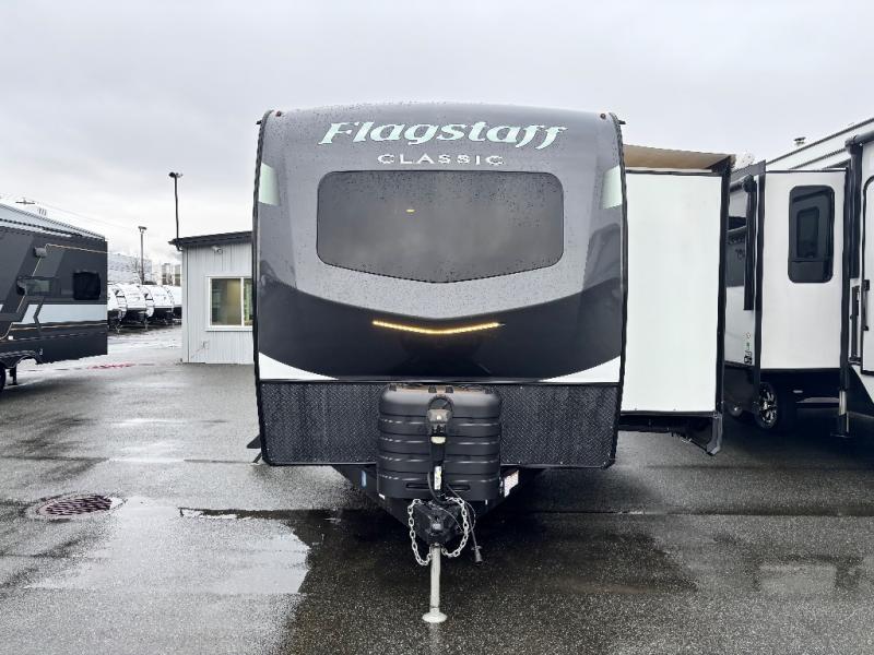 Each one of these Forest River Flagstaff Classic fifth wheels or travel trailers will be your home on wheels! Their quality craftsmanship and attention to detail shines through the surface-coated steel I-beam frame on fifth wheels, the enclosed underbelly, the radius roof with vaulted interior ceilings, and six-sided fully aluminum-framed floor, walls, and roof. Towing your unit will be easy with the torsion axle, Rubber-Ryde suspension, power tongue jack, and nitrogen-filled Goodyear Endurance tires. You will even reduce your use of water with the Showermiser water saving system in the bathroom. A few other convenient features you will enjoy include a control panel with WeRV app control, an upgraded backlit headboard, and an outside shower with hot and cold water. Come choose your favorite one today!