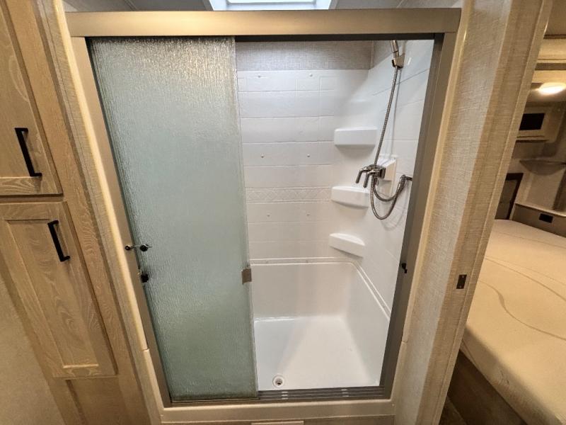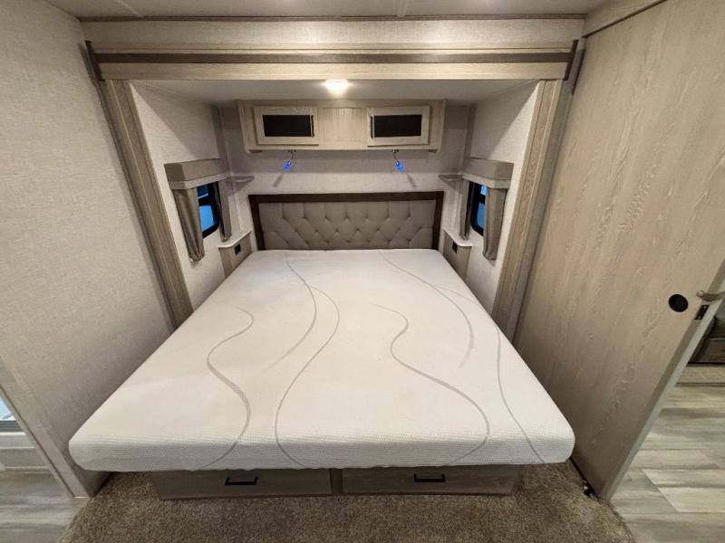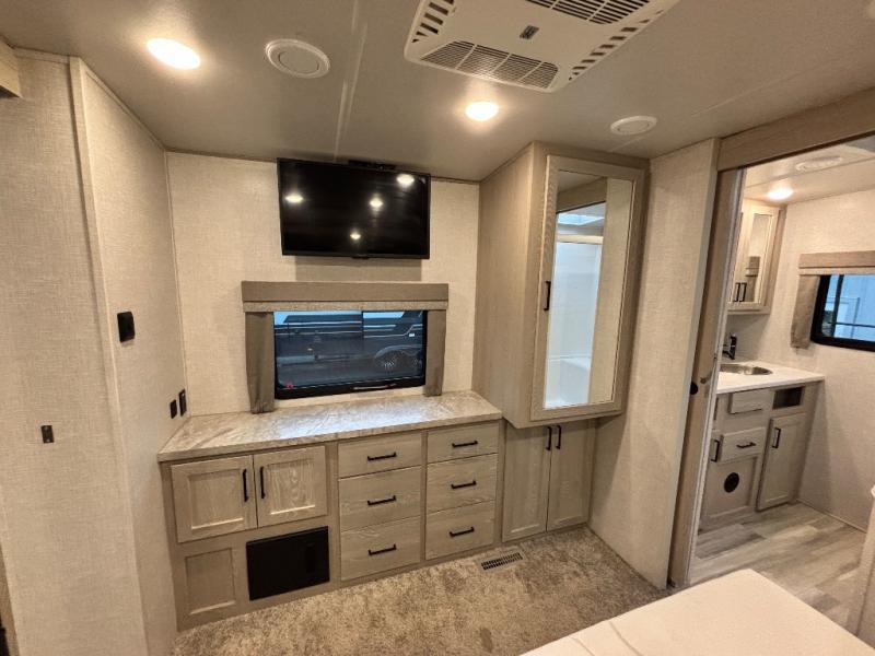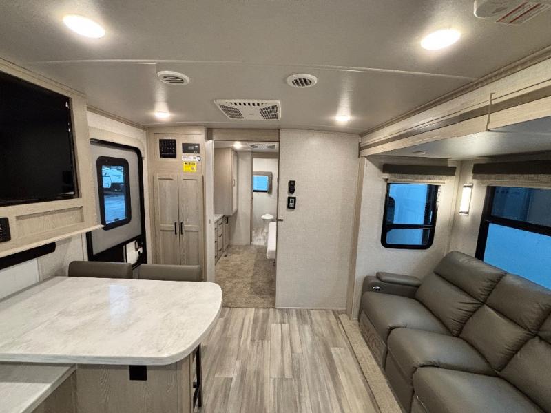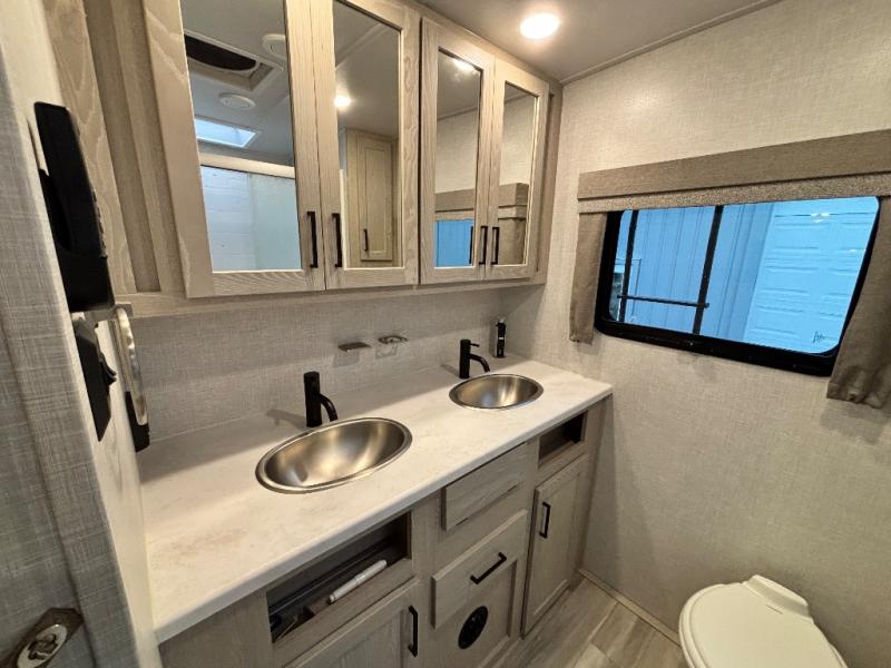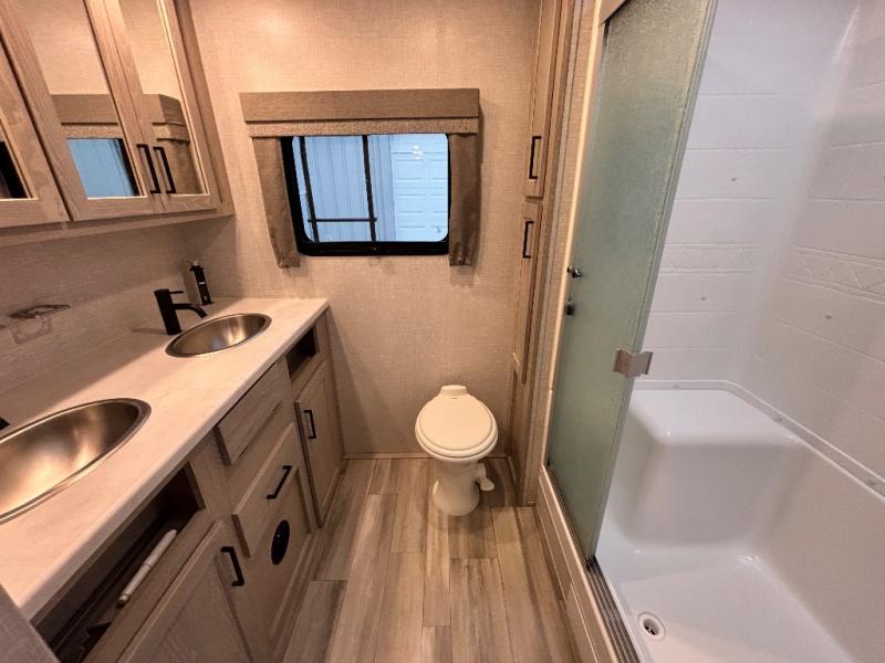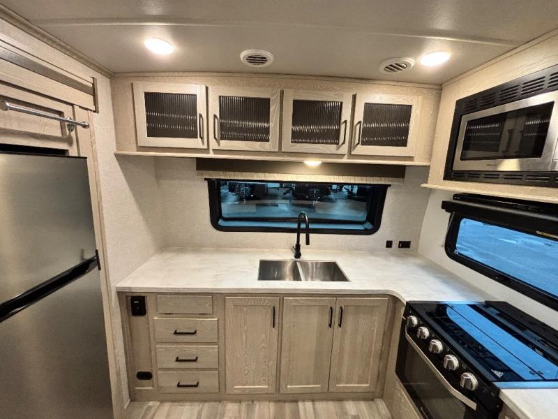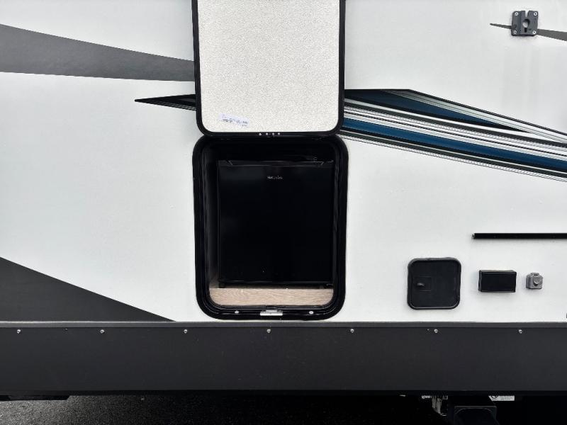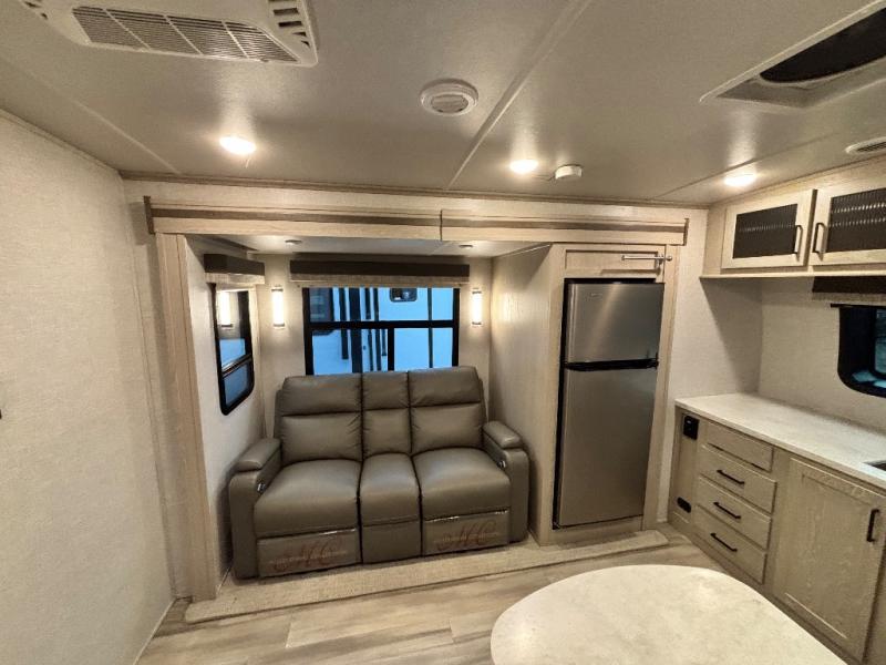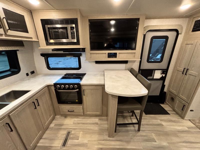 You will love how open this travel trailer will feel with the large front window that you can look out from the two-person bar top seating! The front kitchen has plenty of countertop space for you to prepare your best meals. Your nights will be spent in true relaxation with the 67" theater seating and king bed slide to lay your head. The full rear bathroom has a shower with a seat to take a nice, hot shower before bed and a dual-sink vanity for two to get ready at once in the mornings!