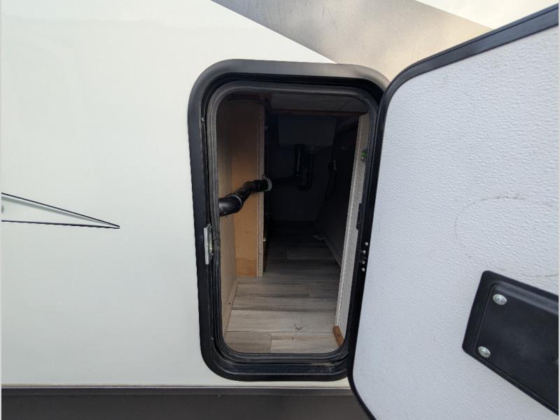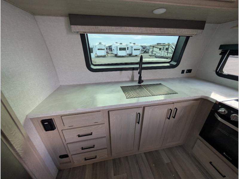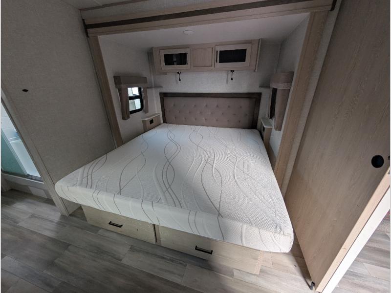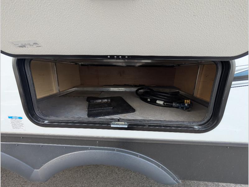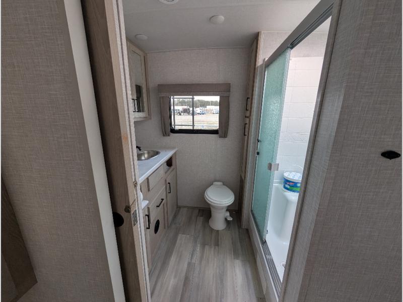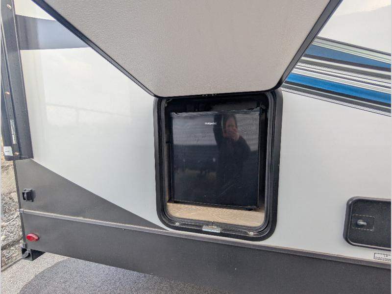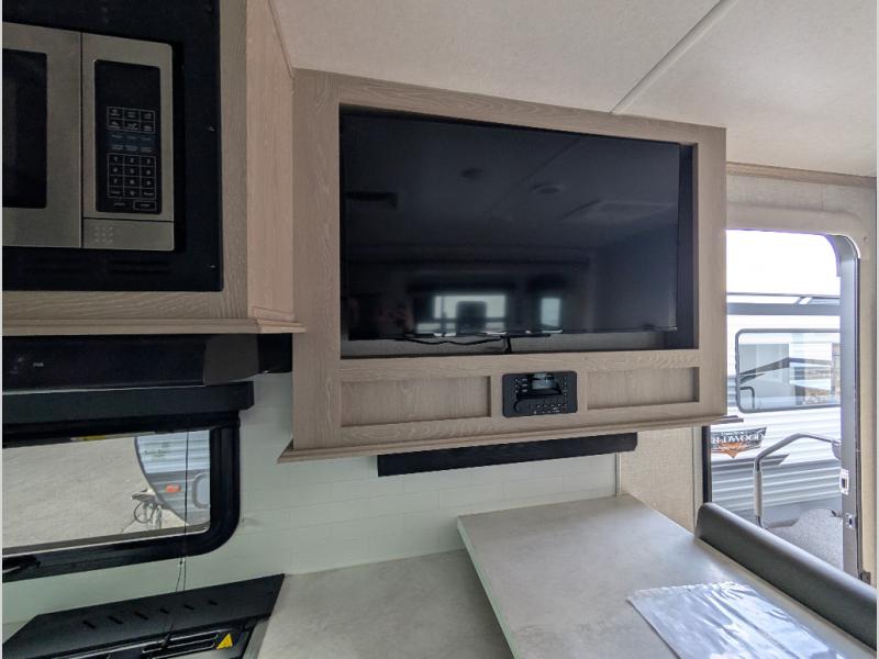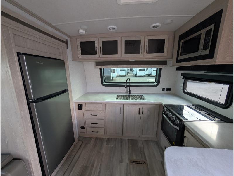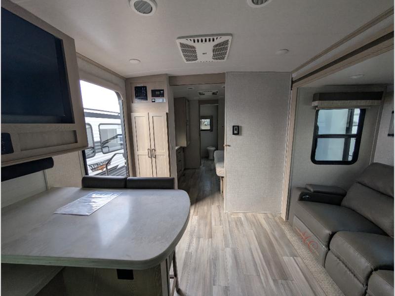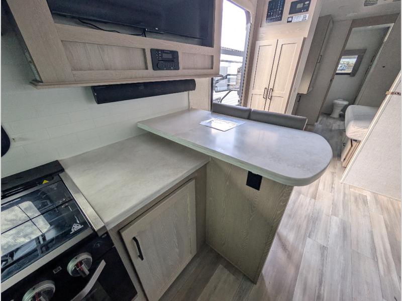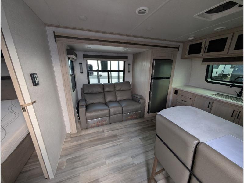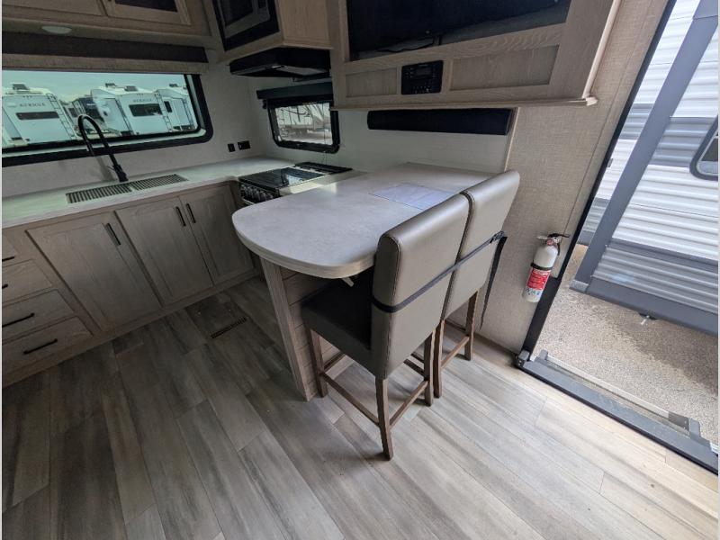 You will love how open this travel trailer will feel with the large front window that you can look out from the two-person bar top seating! The front kitchen has plenty of countertop space for you to prepare your best meals. Your nights will be spent in true relaxation with the 67" theater seating and king bed slide to lay your head. The full rear bathroom has a shower with a seat to take a nice, hot shower before bed and a dual-sink vanity for two to get ready at once in the mornings!