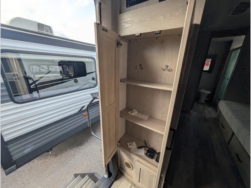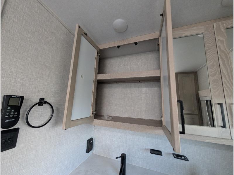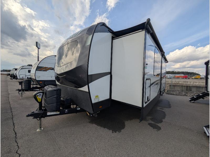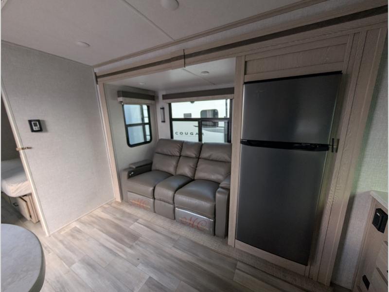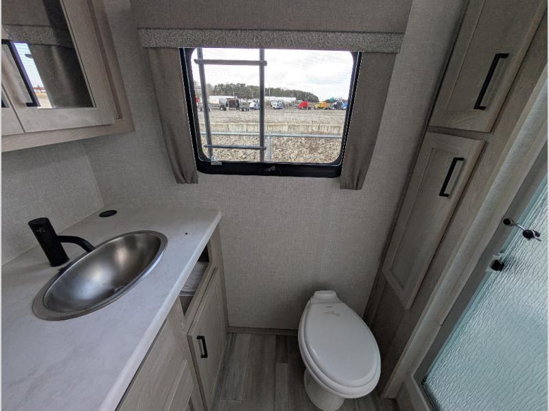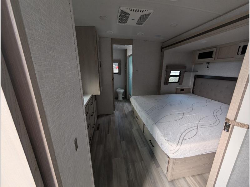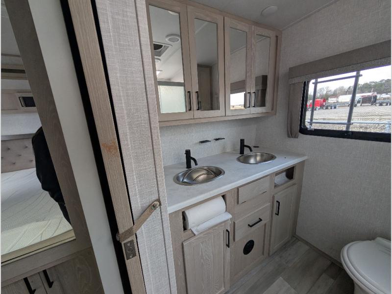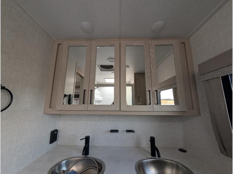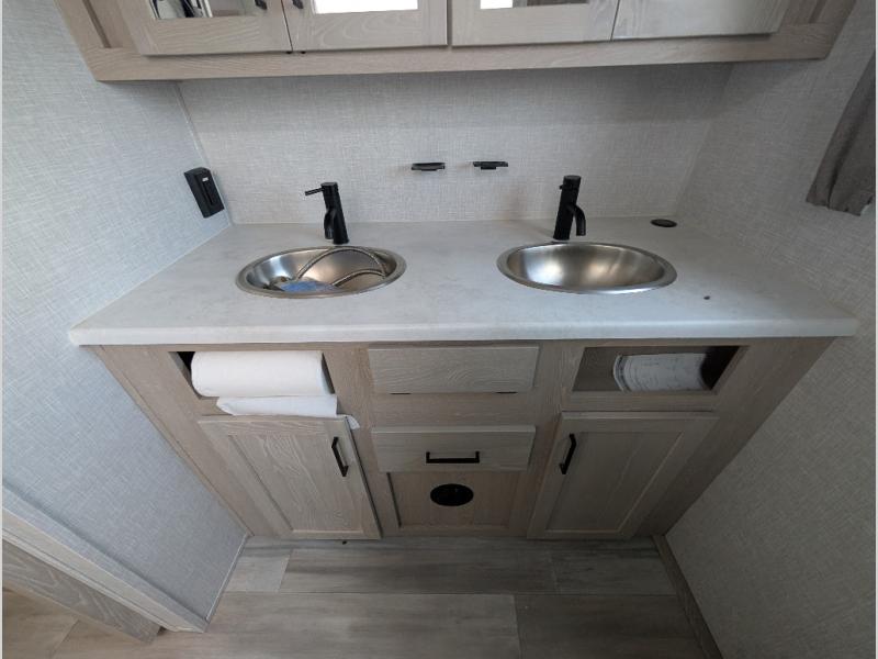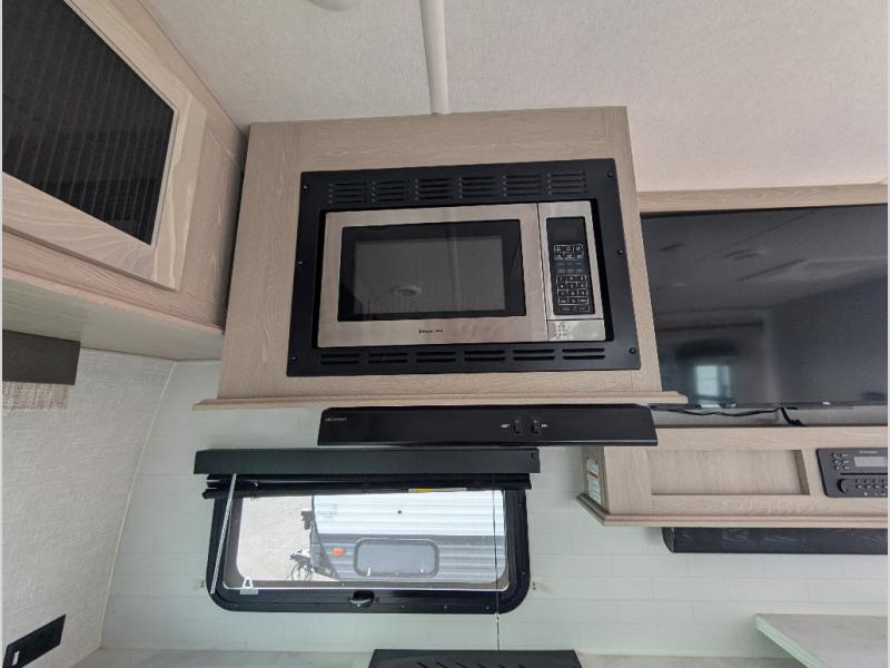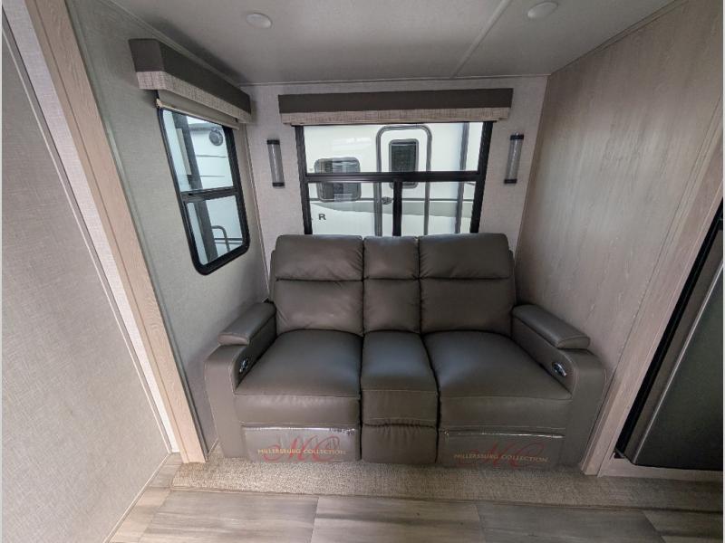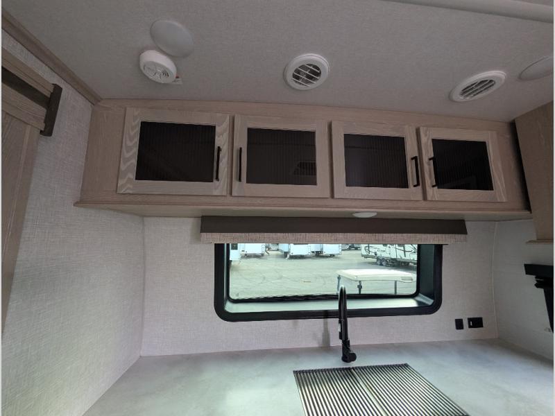 You will love how open this travel trailer will feel with the large front window that you can look out from the two-person bar top seating! The front kitchen has plenty of countertop space for you to prepare your best meals. Your nights will be spent in true relaxation with the 67" theater seating and king bed slide to lay your head. The full rear bathroom has a shower with a seat to take a nice, hot shower before bed and a dual-sink vanity for two to get ready at once in the mornings!