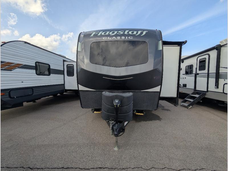 Each one of these Forest River Flagstaff Classic fifth wheels or travel trailers will be your home on wheels! Their quality craftsmanship and attention to detail shines through the surface-coated steel I-beam frame on fifth wheels, the enclosed underbelly, the radius roof with vaulted interior ceilings, and six-sided fully aluminum-framed floor, walls, and roof. Towing your unit will be easy with the torsion axle, Rubber-Ryde suspension, power tongue jack, and nitrogen-filled Goodyear Endurance tires. You will even reduce your use of water with the Showermiser water saving system in the bathroom. A few other convenient features you will enjoy include a control panel with WeRV app control, an upgraded backlit headboard, and an outside shower with hot and cold water. Come choose your favorite one today!