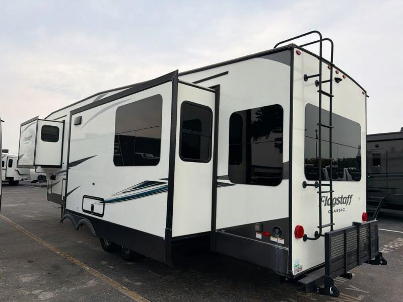Each one of these Forest River Flagstaff Classic fifth wheels or travel trailers will be your home on wheels! Their quality craftsmanship and attention to detail shines through the surface-coated steel I-beam frame on fifth wheels, the enclosed underbelly, the radius roof with vaulted interior ceilings, and six-sided fully aluminum-framed floor, walls, and roof. Towing your unit will be easy with the torsion axle, Rubber-Ryde suspension, power tongue jack, and nitrogen-filled Goodyear Endurance tires. You will even reduce your use of water with the Showermiser water saving system in the bathroom. A few other convenient features you will enjoy include a control panel with WeRV app control, an upgraded backlit headboard, and an outside shower with hot and cold water. Come choose your favorite one today!