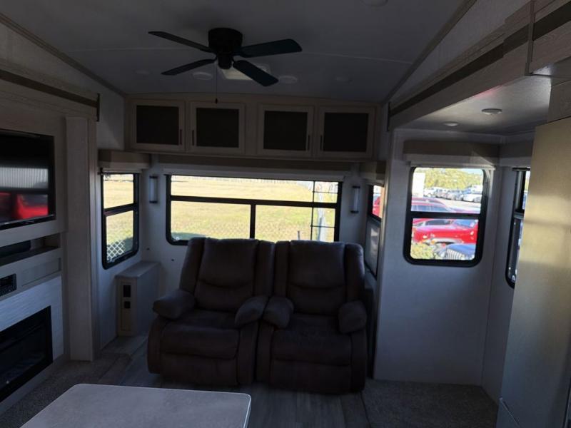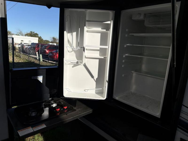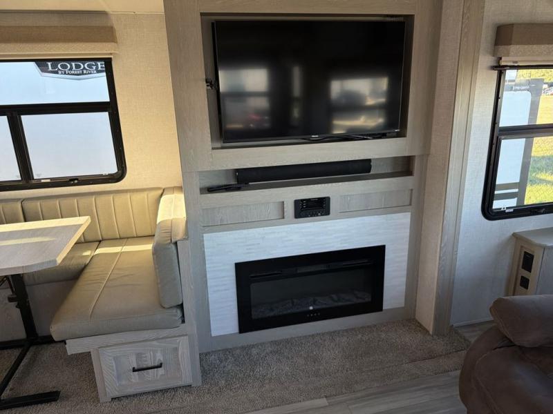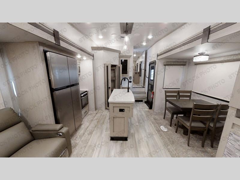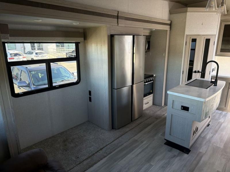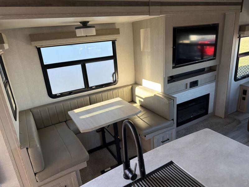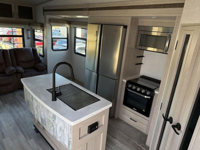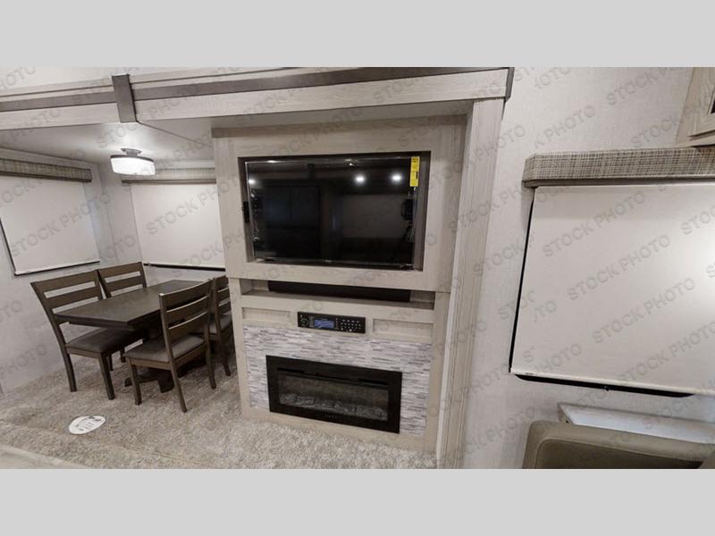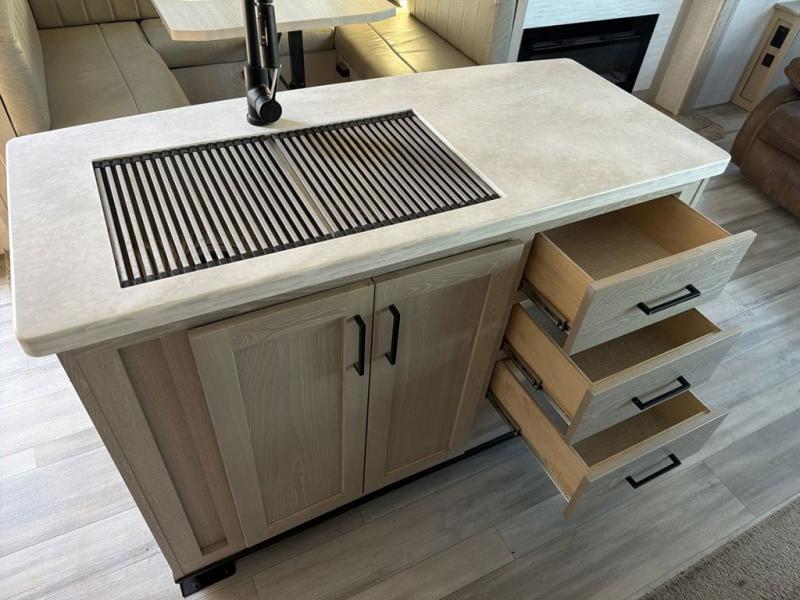 Meal prepping is made easy in this fifth wheel with a kitchen island! You can even prepare dinner outdoors at the outside kitchen with a refrigerator to keep your beverages cold while you cook. The 44" King U-shaped dinette is big enough for everyone to gather around for game night, or some can choose to relax on either the rear 76" hide-a-bed sofa or 60" theater seating across from the entertainment center with a fireplace. The full bathroom has a shower with a seat to rinse the sand out of your hair and a linen closet close by to store your towels. Inside the front private bedroom is a king bed slide across from a dresser with the option to add a TV, as well as a front wardrobe with a shirt closet and an area to add an optional washer and dryer!