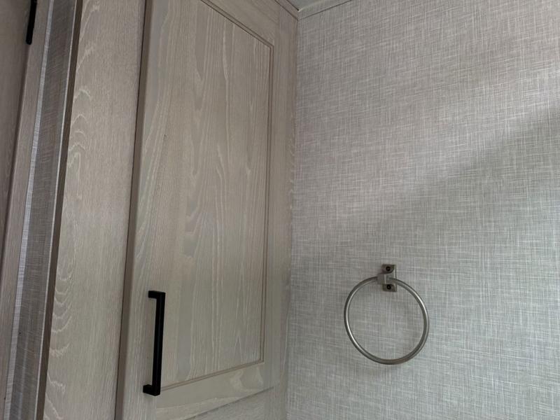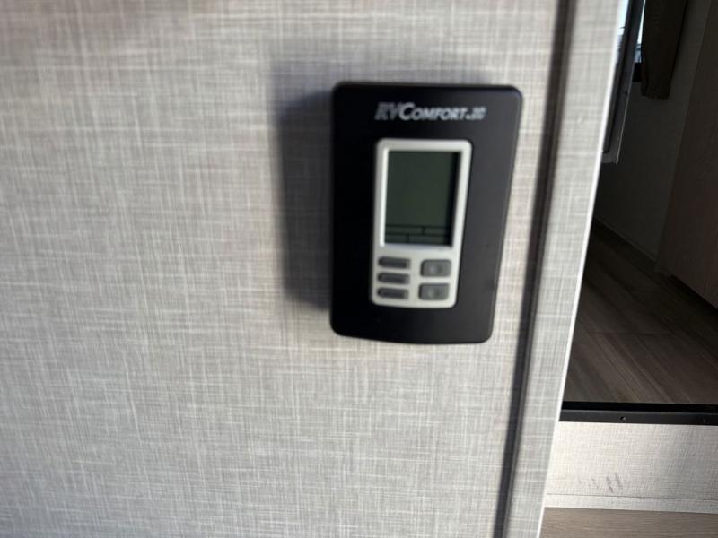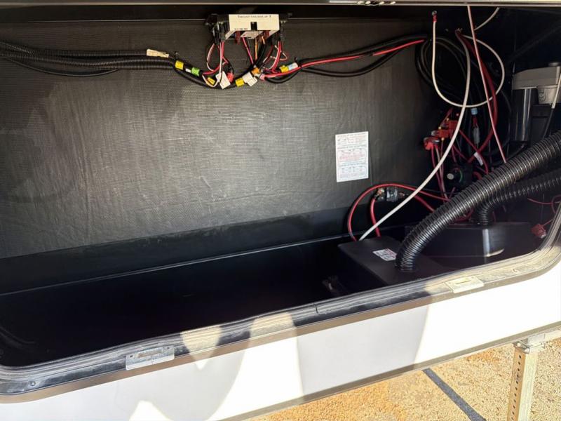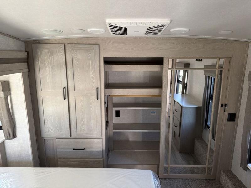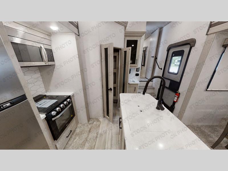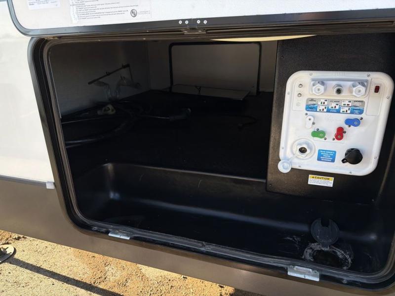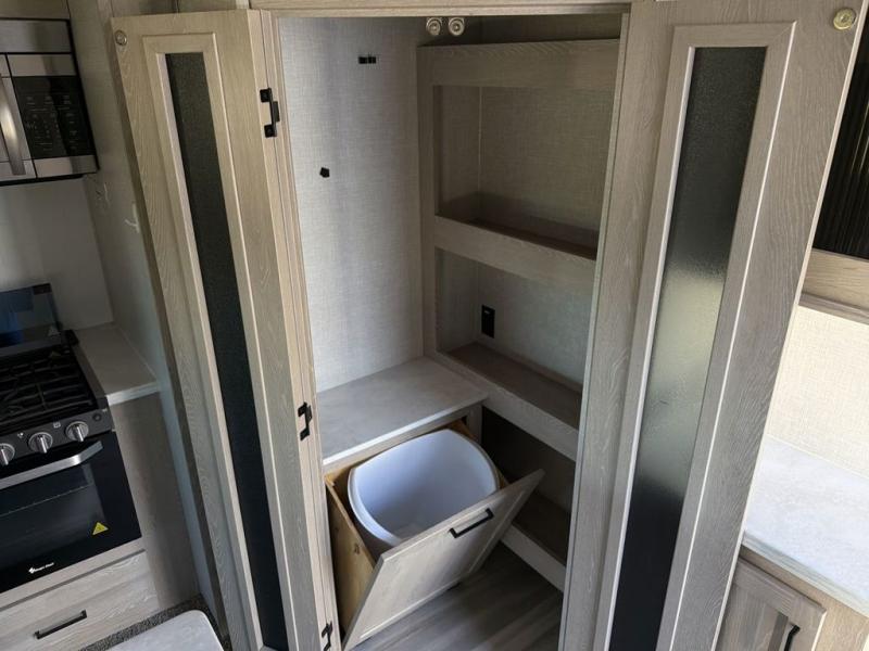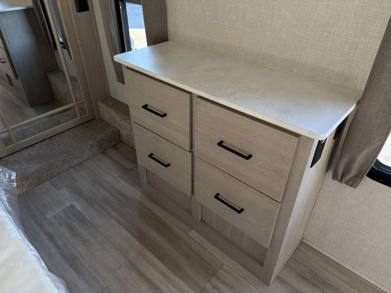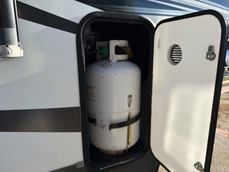 Meal prepping is made easy in this fifth wheel with a kitchen island! You can even prepare dinner outdoors at the outside kitchen with a refrigerator to keep your beverages cold while you cook. The 44" King U-shaped dinette is big enough for everyone to gather around for game night, or some can choose to relax on either the rear 76" hide-a-bed sofa or 60" theater seating across from the entertainment center with a fireplace. The full bathroom has a shower with a seat to rinse the sand out of your hair and a linen closet close by to store your towels. Inside the front private bedroom is a king bed slide across from a dresser with the option to add a TV, as well as a front wardrobe with a shirt closet and an area to add an optional washer and dryer!