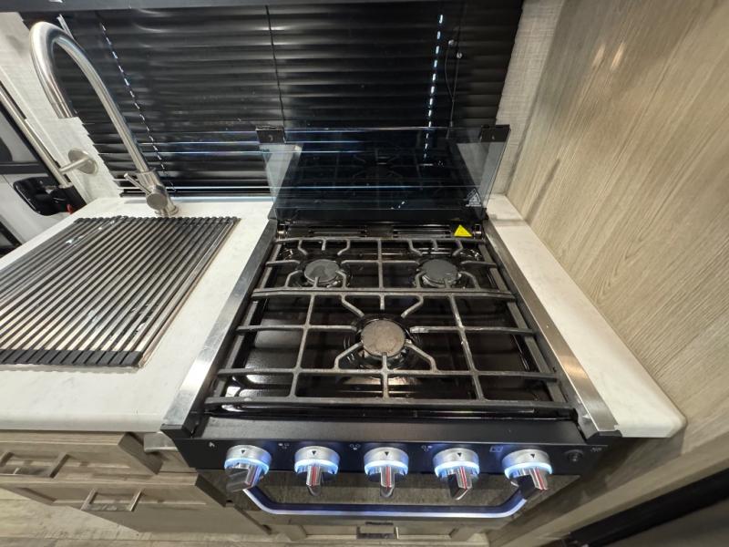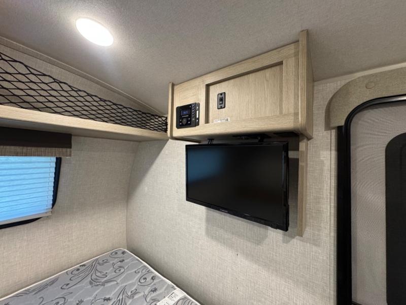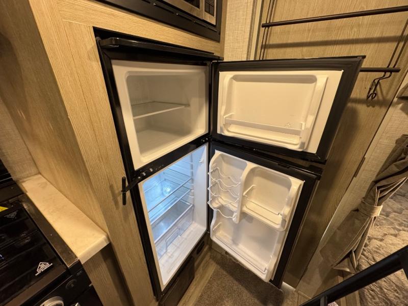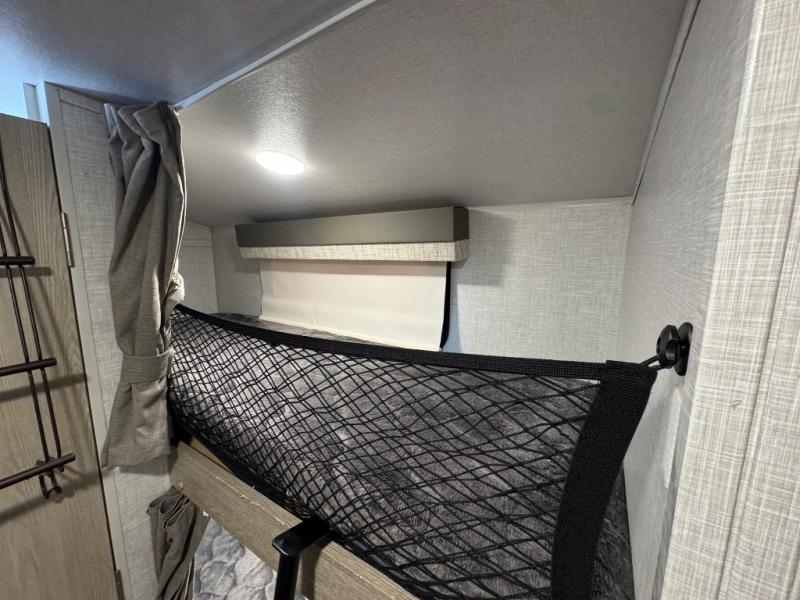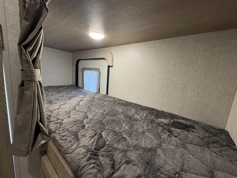 Enjoy moving from campgrounds to campgrounds easily in this trailer thanks to not having a slide out, you can hitch up and go when you are ready. Just don't forget to push the button to the 13' power awning. Your kids or friends will enjoy having their own bunk bed to sleep on while you have a full bed up front, and the dinette sleeps one more. Convenience is appreciated in the rear toilet and shower/bath giving you a place to change in privacy and get cleaned up. The bike door allows you to store bicycles or totes easily inside for traveling, and the exterior storage compartments give you extra space for outdoor gear, camping chairs and such.