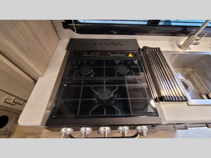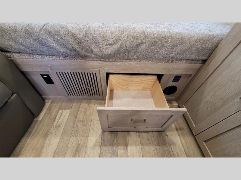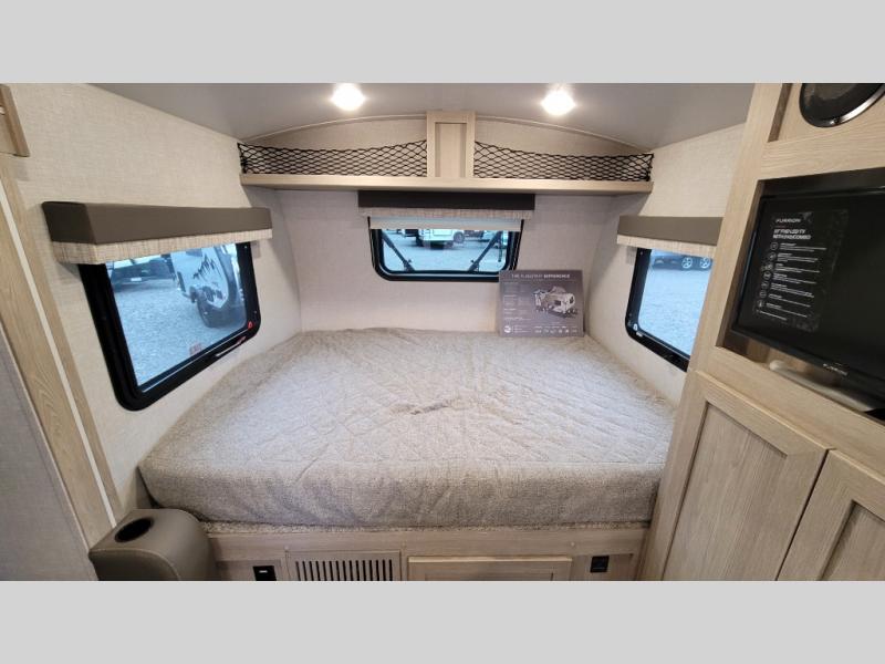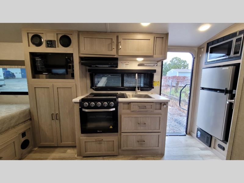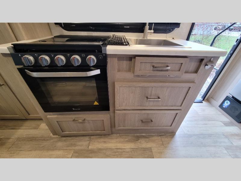 Camp with your favorite person in this trailer with the versatile Murphy bed/sofa combo up front giving you both a living area and a bedroom when you so choose. If you need sleeping space for one more, the dinette will provide that once easily setup. The large window gives you great views while dining or playing games, and the front windshield gives you more views. There is extra floor space in this trailer with the kitchen slide out that offers full amenities plus a sink to keep everything clean. And the full-length rear bathroom offers a spacious area to change your clothes in privacy and get cleaned up in the large shower.