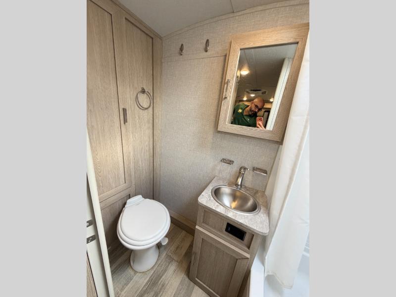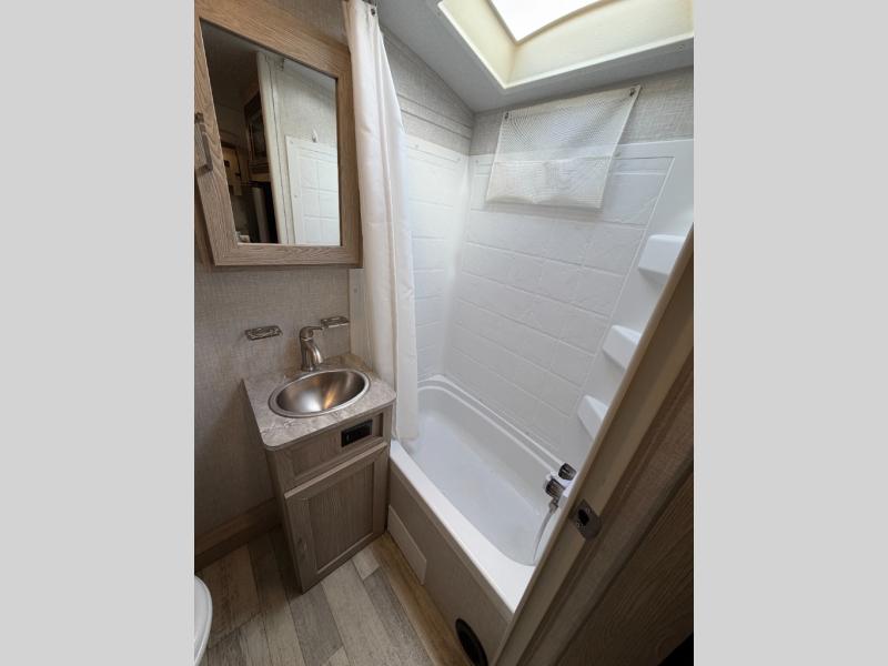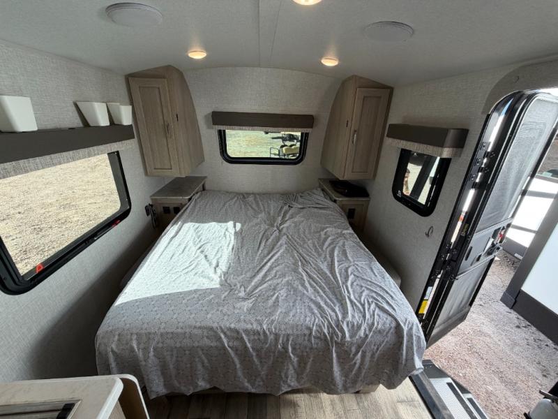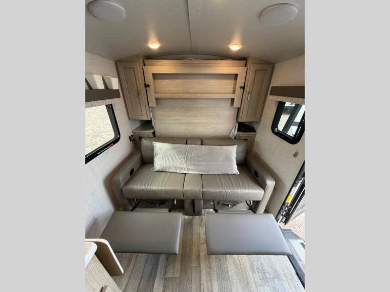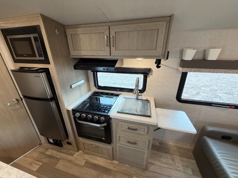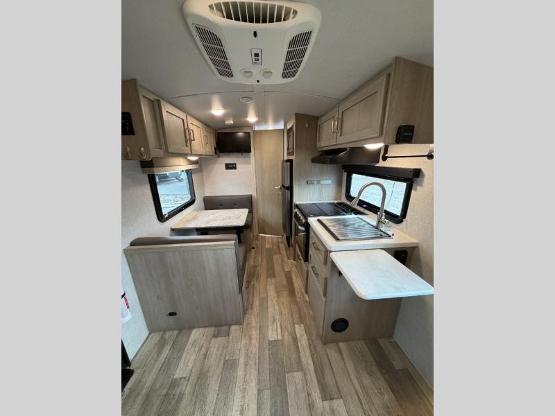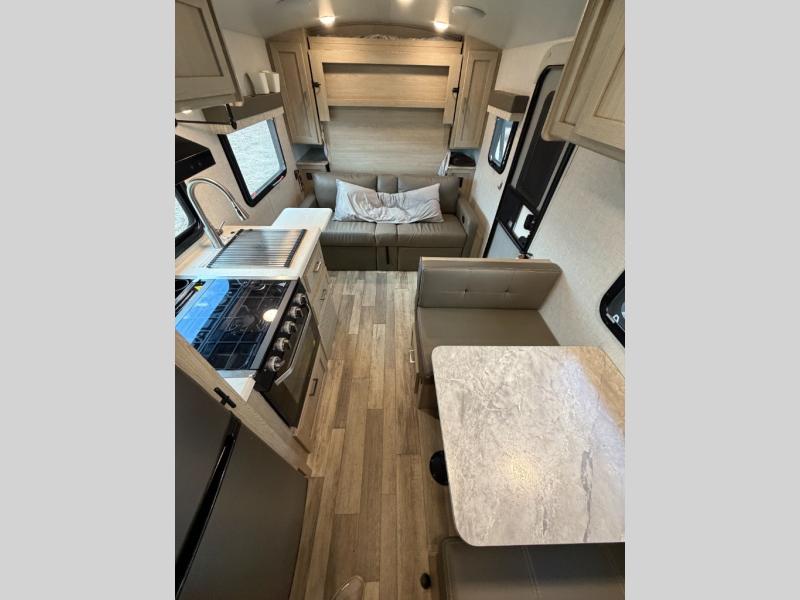 Camp with your favorite person in this trailer with the versatile Murphy bed/sofa combo up front giving you both a living area and a bedroom when you so choose. If you need sleeping space for one more, the dinette will provide that once easily setup. The large window gives you great views while dining or playing games, and the front windshield gives you more views. There is extra floor space in this trailer with the kitchen slide out that offers full amenities plus a sink to keep everything clean. And the full-length rear bathroom offers a spacious area to change your clothes in privacy and get cleaned up in the large shower.