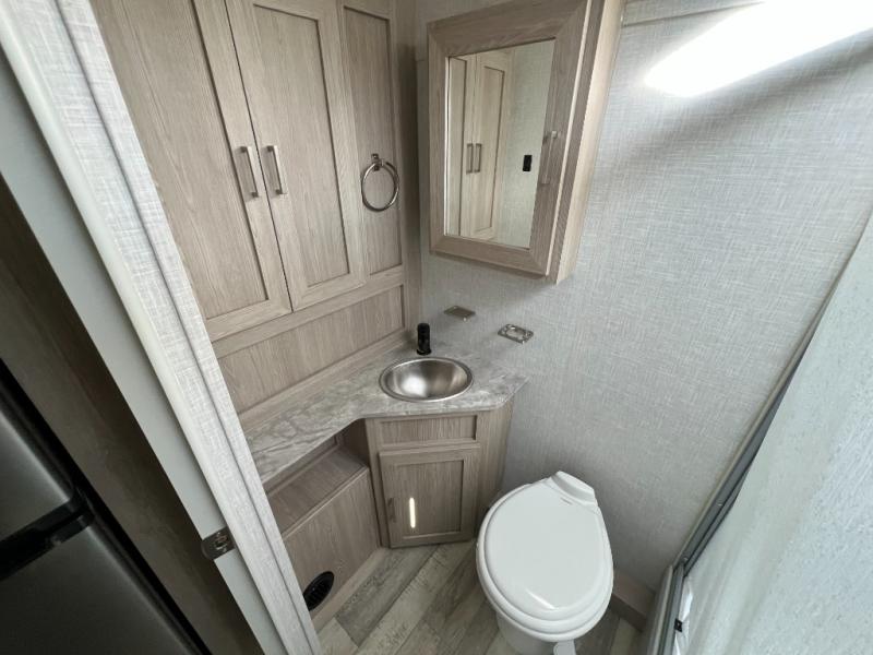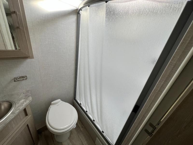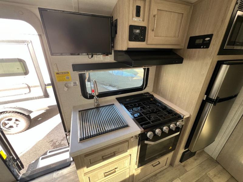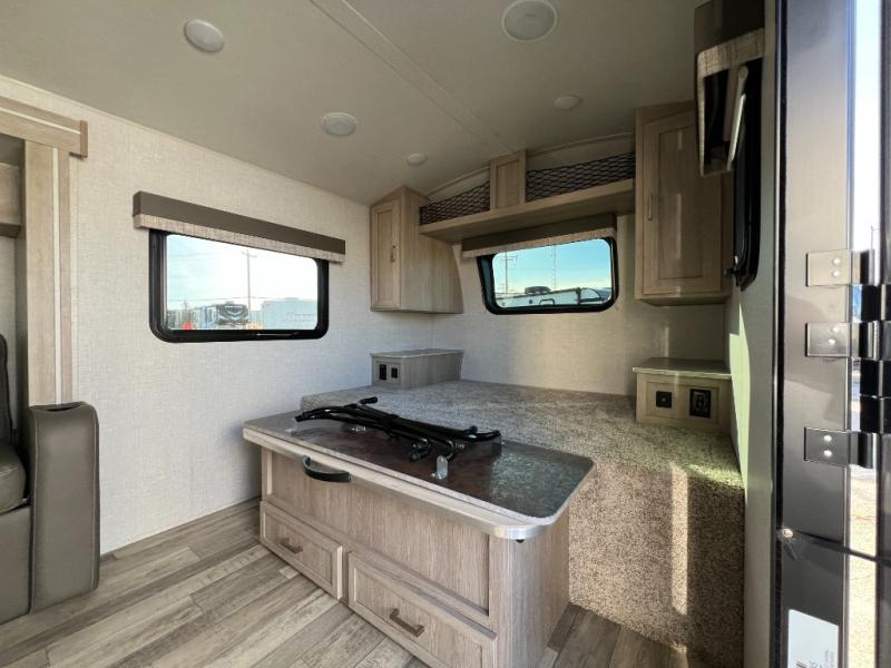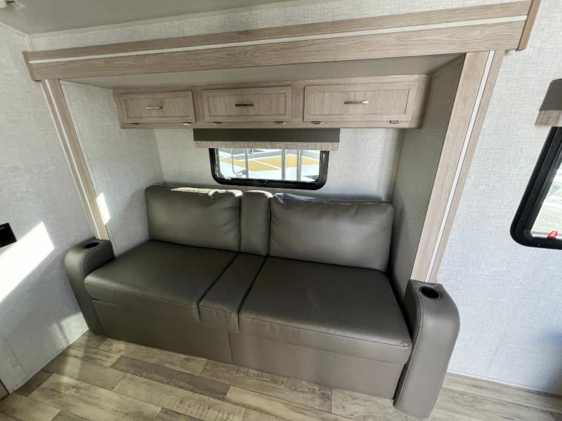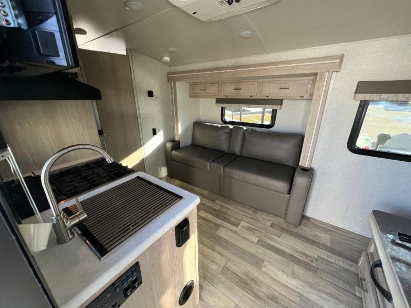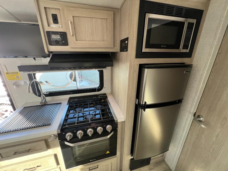 Get ready for a spacious and comfortable trip in this trailer, plus you will have a convenient rear full bathroom with an oversized shower and linen storage to utilize instead of using the campground's facilities. The walk-around full bed gives you two sides with wardrobes to claim as your own. And the kitchen offers full amenities to make meals, and the outside griddle gives you even more choices when cooking. You can relax, dine or even work from the slide out sofa with table and watch the TV. You will find storage along the exterior for your outdoor gear, plus a 14' power awning.